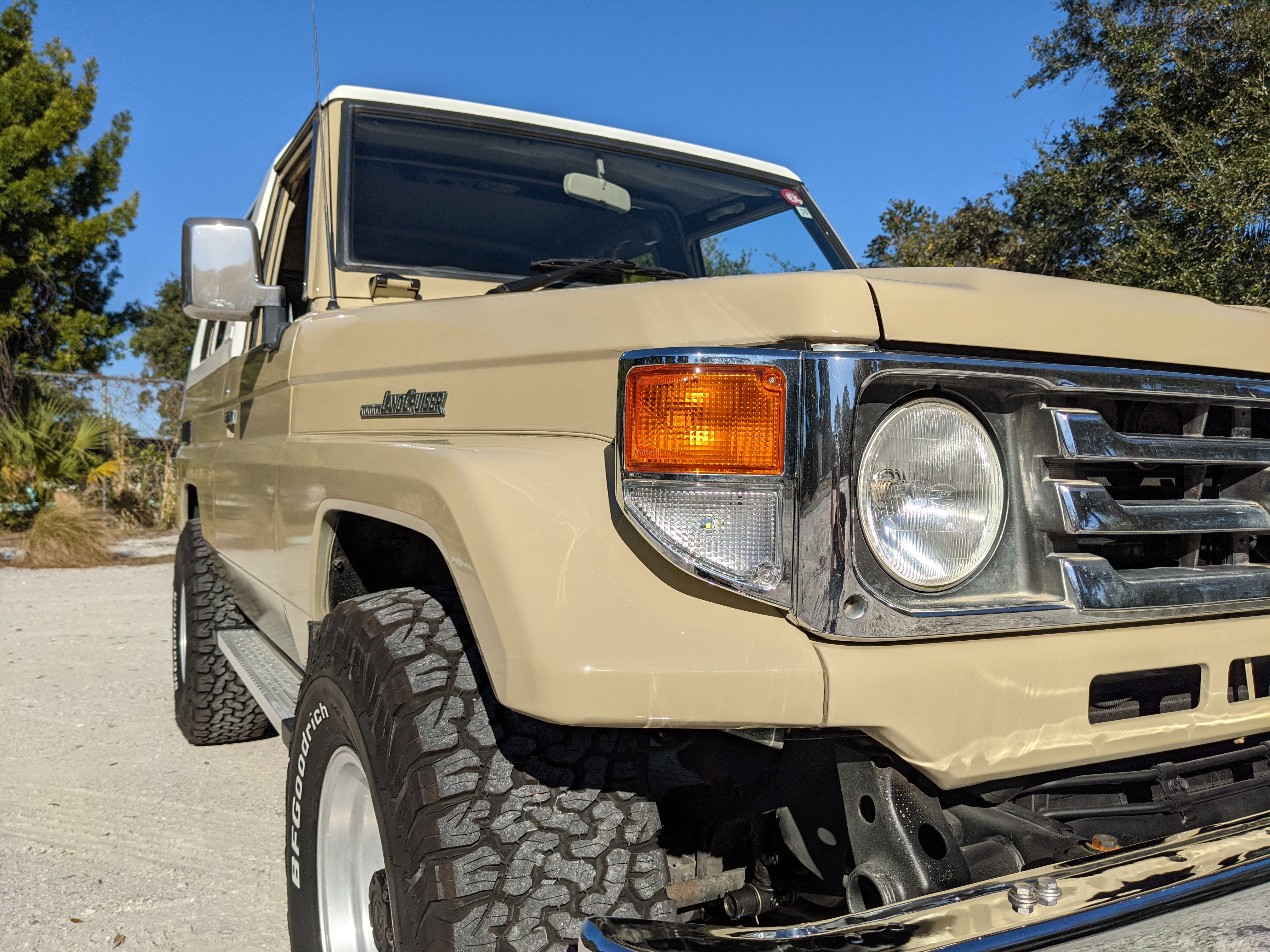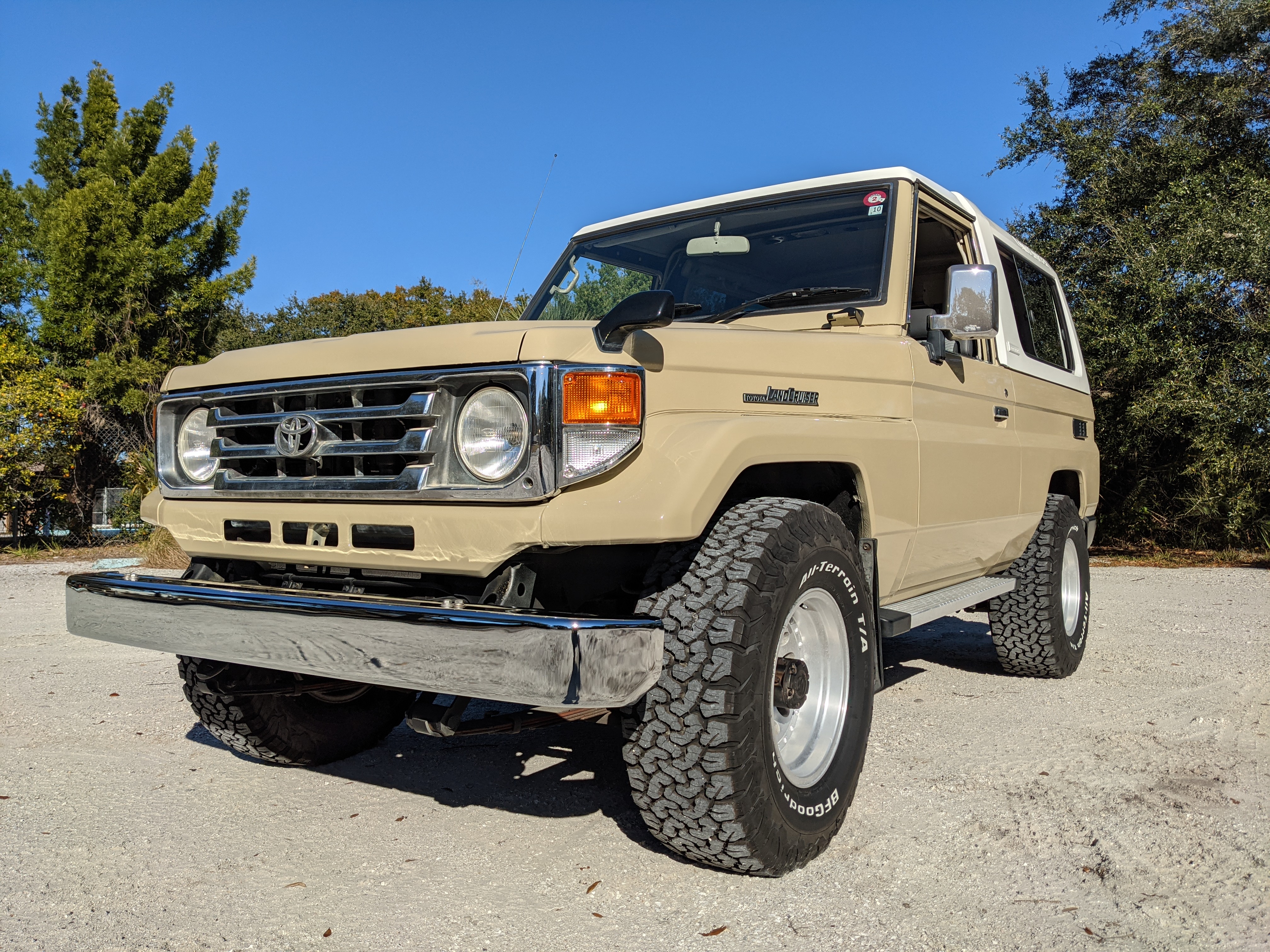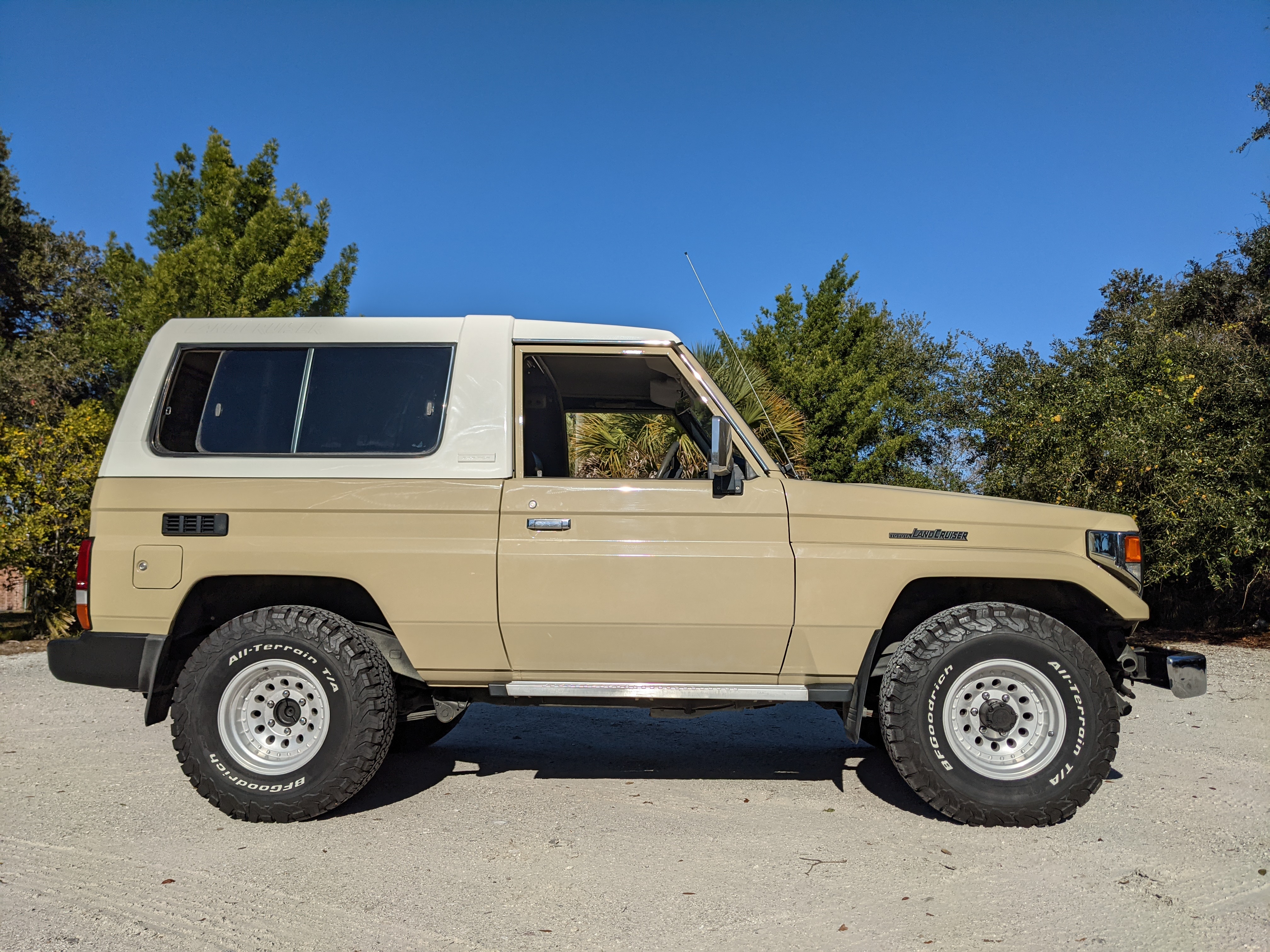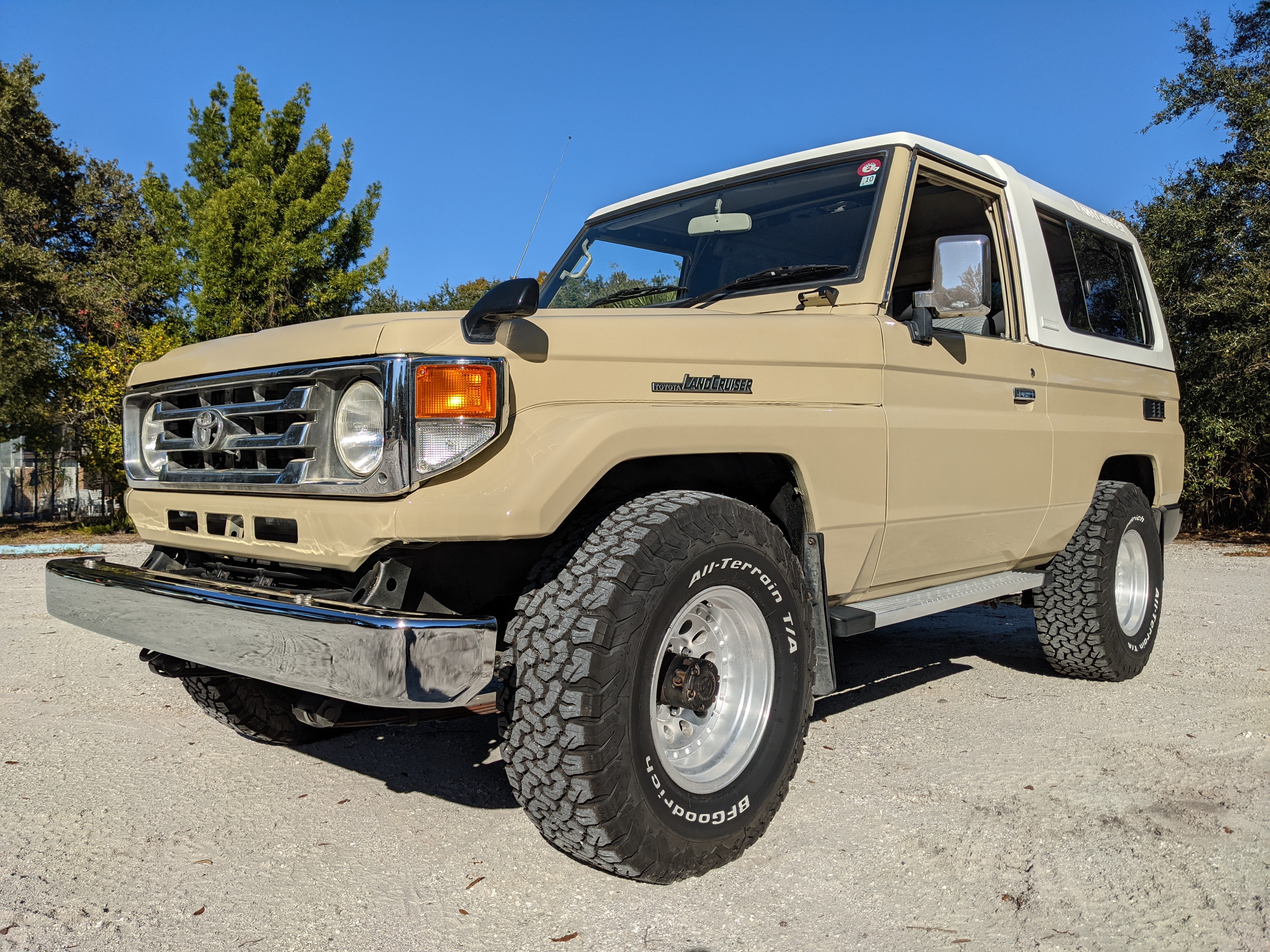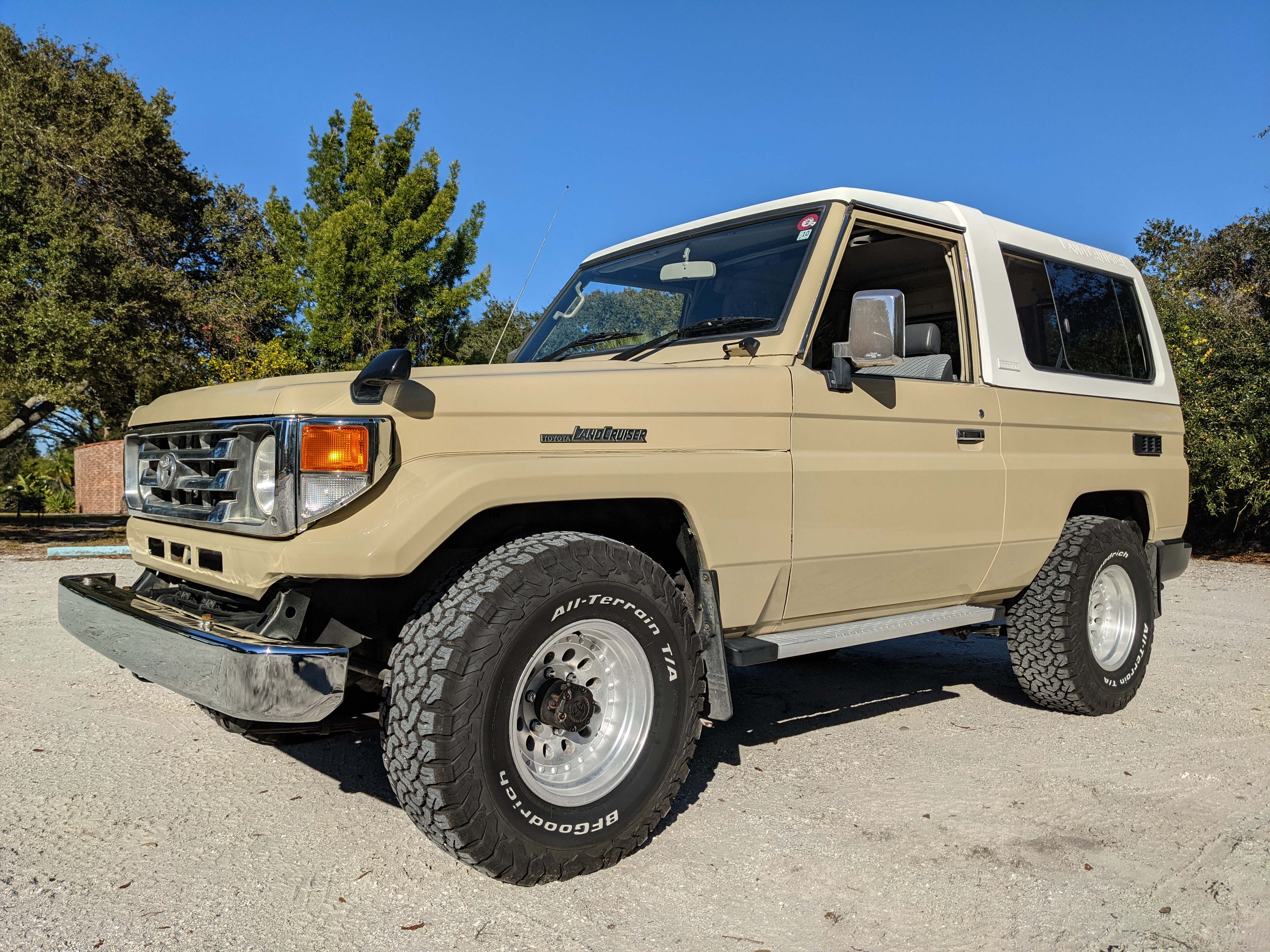 Desert tan on this narrow body model with a bright white FRP top gives a great contrast against most ‘always mad grrr’ designs that SUVs of this type typically wear these days. No dents or dings in the body work either, just straight, clean edges. Spare tire cover has been removed for an even more minimalist look. Aftermarket aluminum wheels are wrapped in brand new 32 inch BF Goodrich KO2s, white letters out.