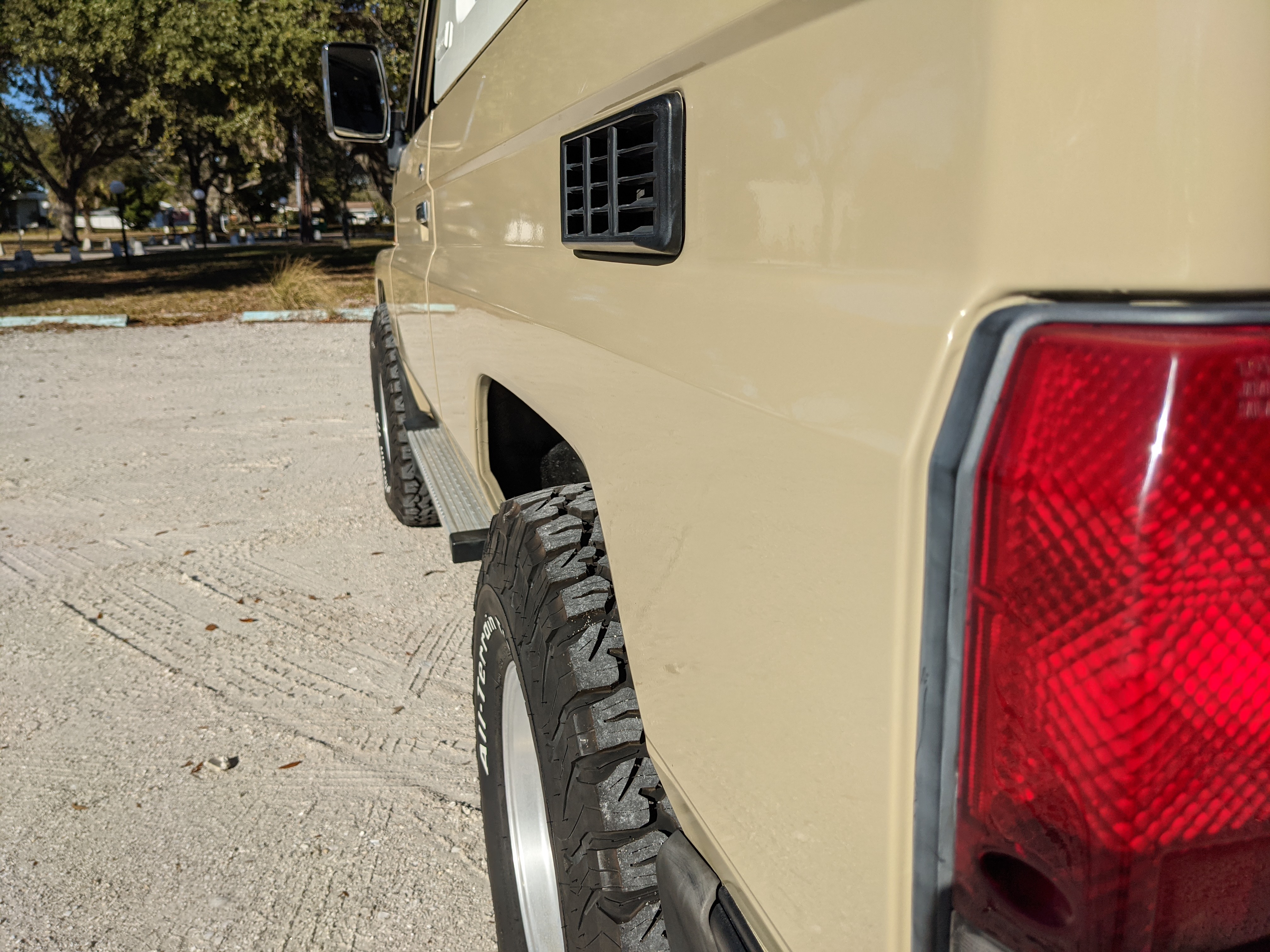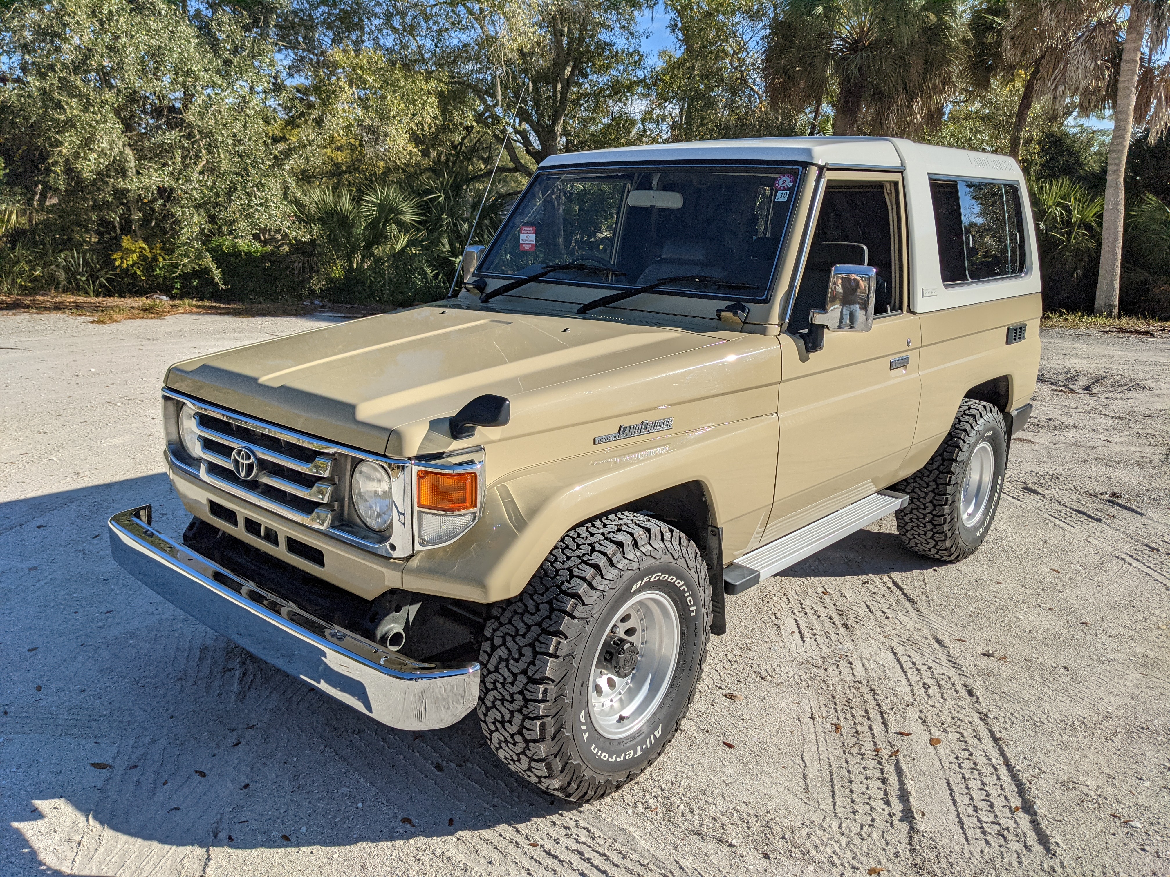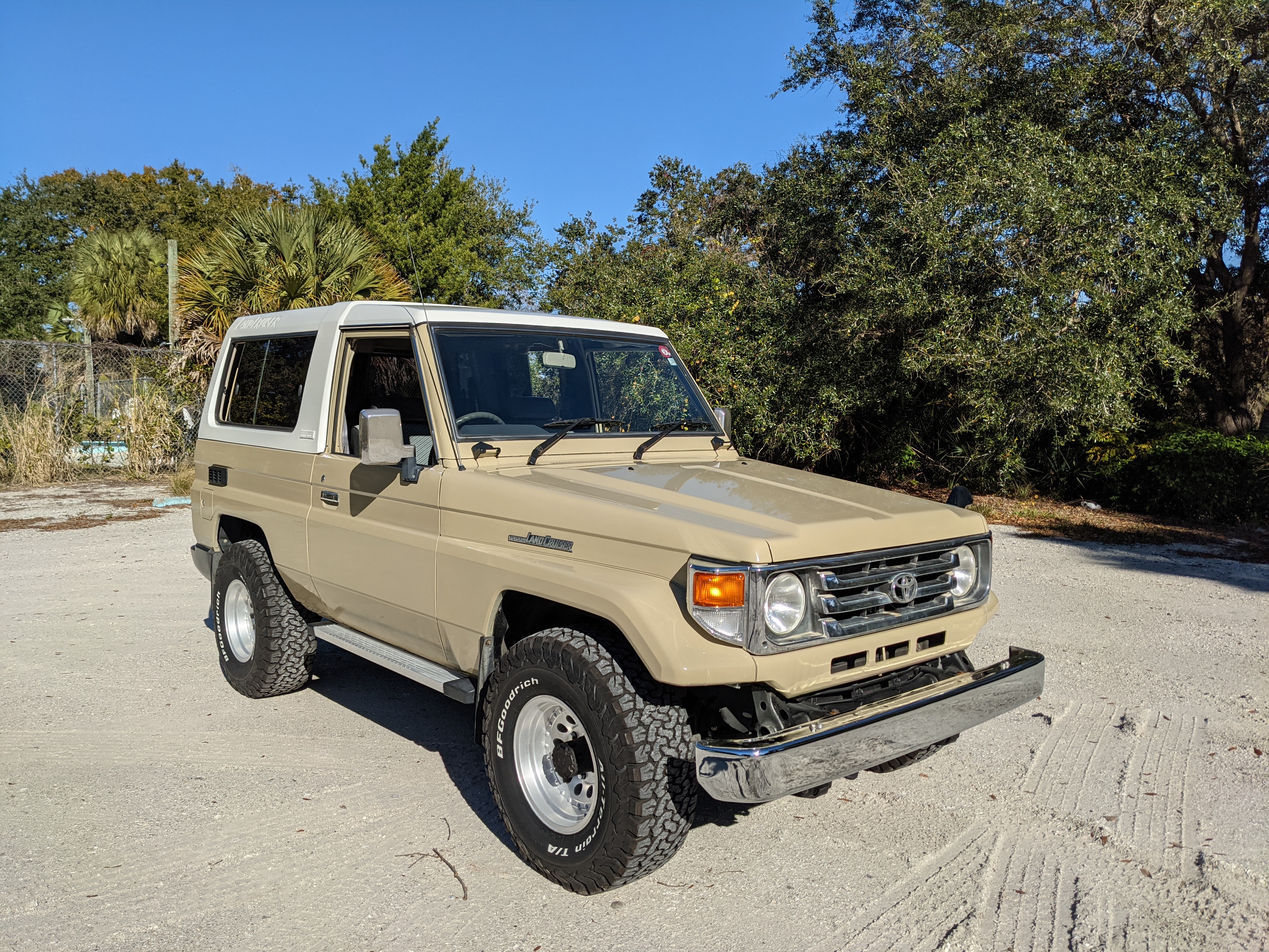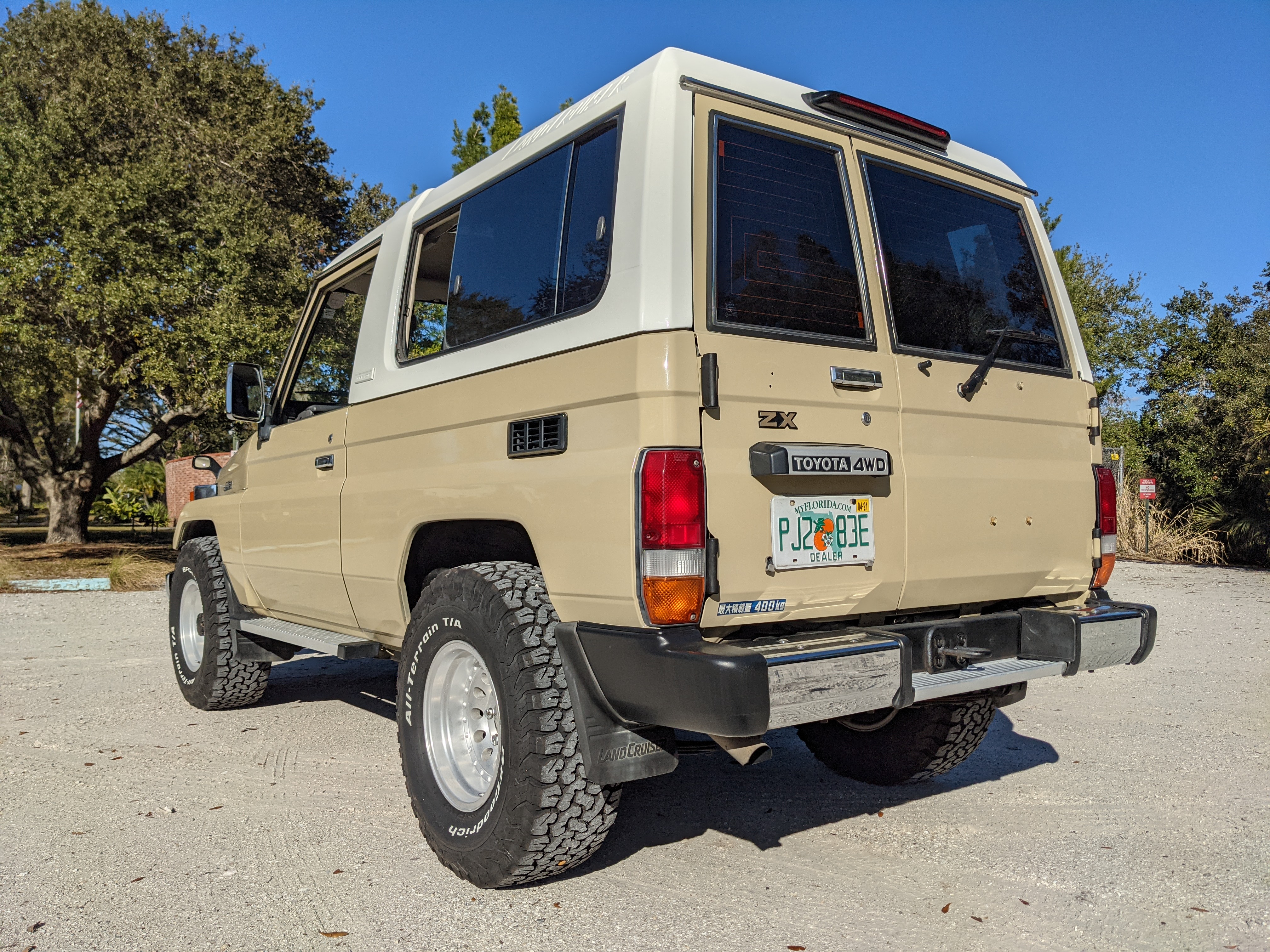 Desert tan on this narrow body model with a bright white FRP top gives a great contrast against most ‘always mad grrr’ designs that SUVs of this type typically wear these days. No dents or dings in the body work either, just straight, clean edges. Spare tire cover has been removed for an even more minimalist look. Aftermarket aluminum wheels are wrapped in brand new 32 inch BF Goodrich KO2s, white letters out.