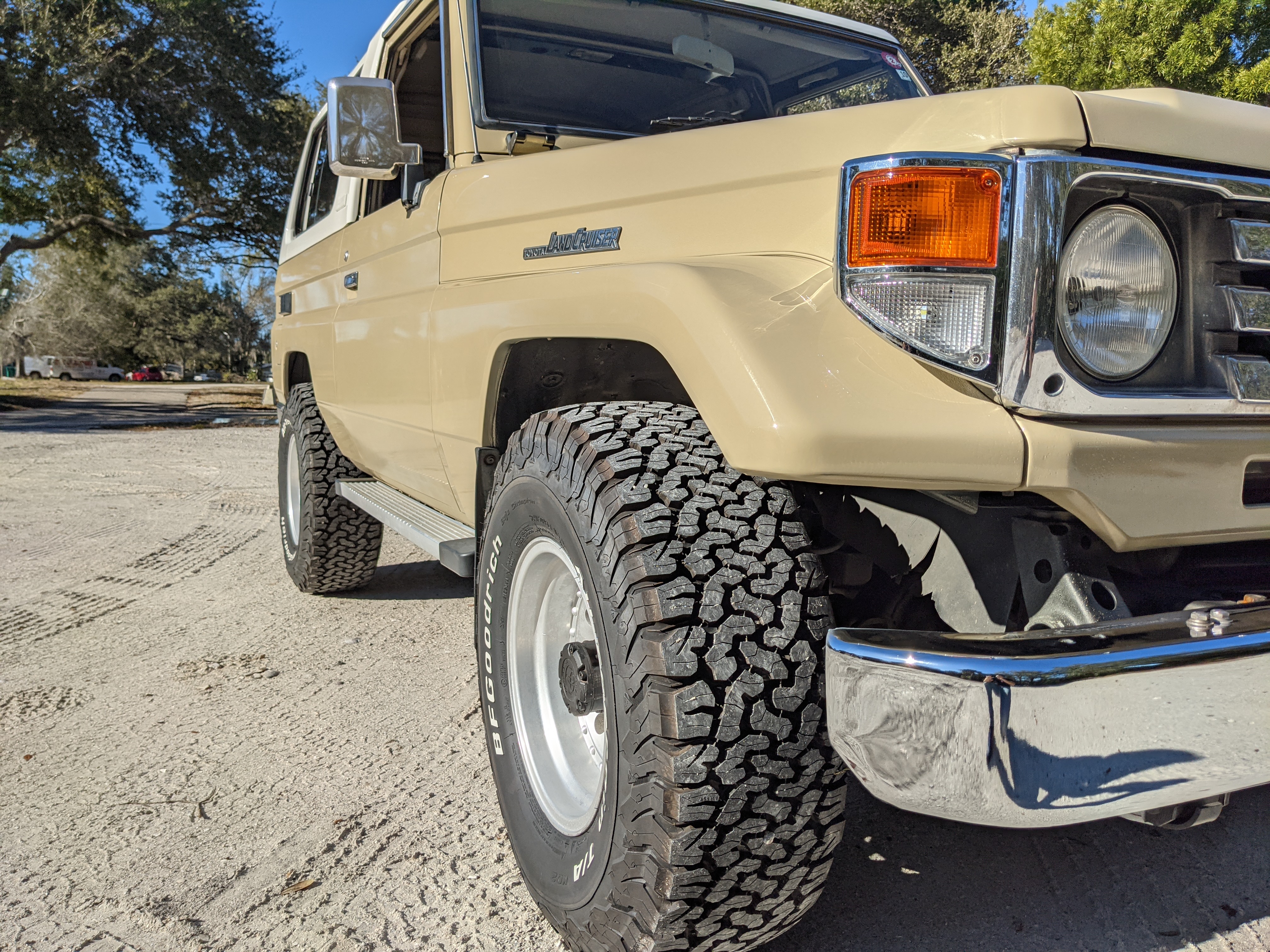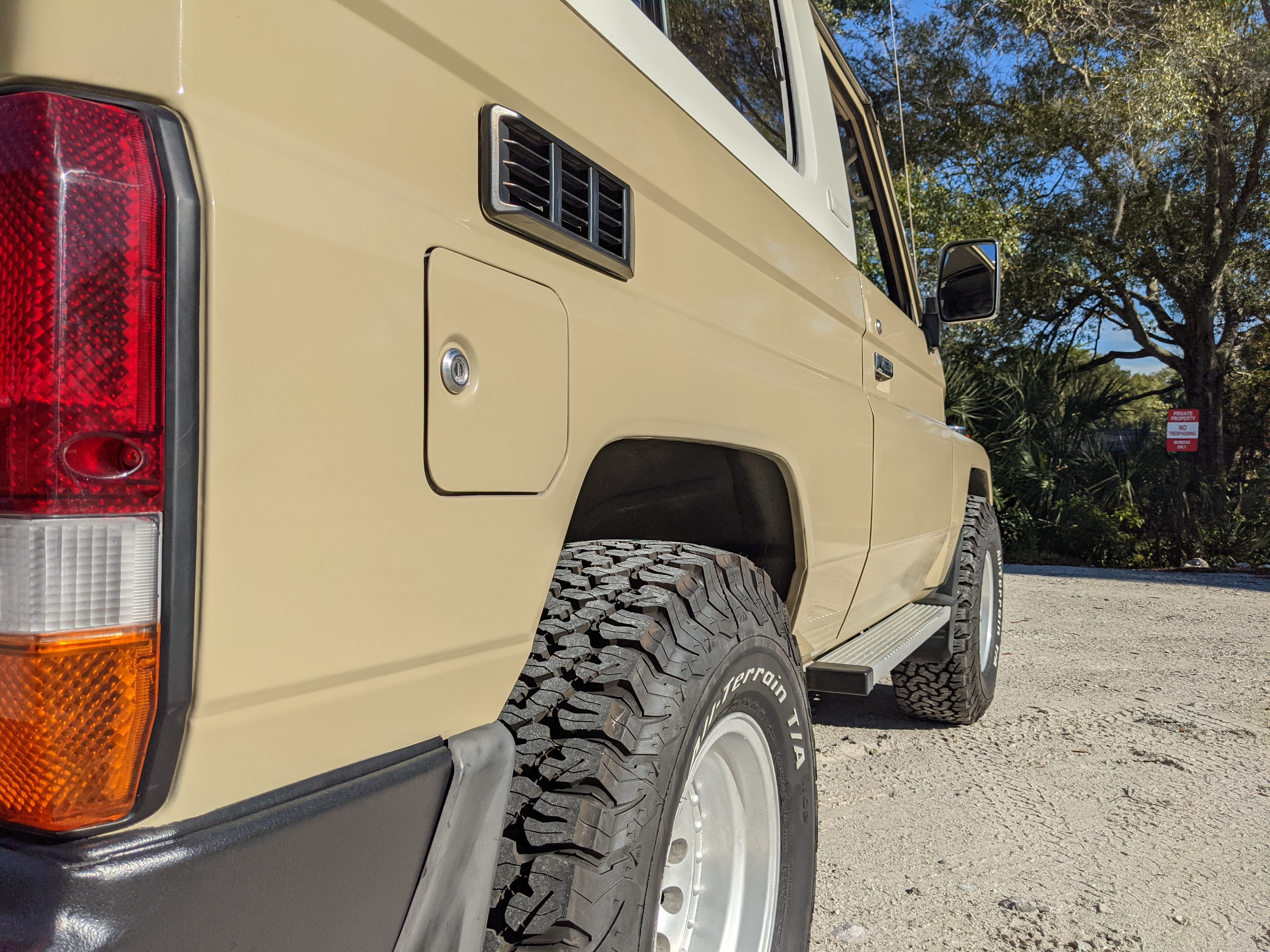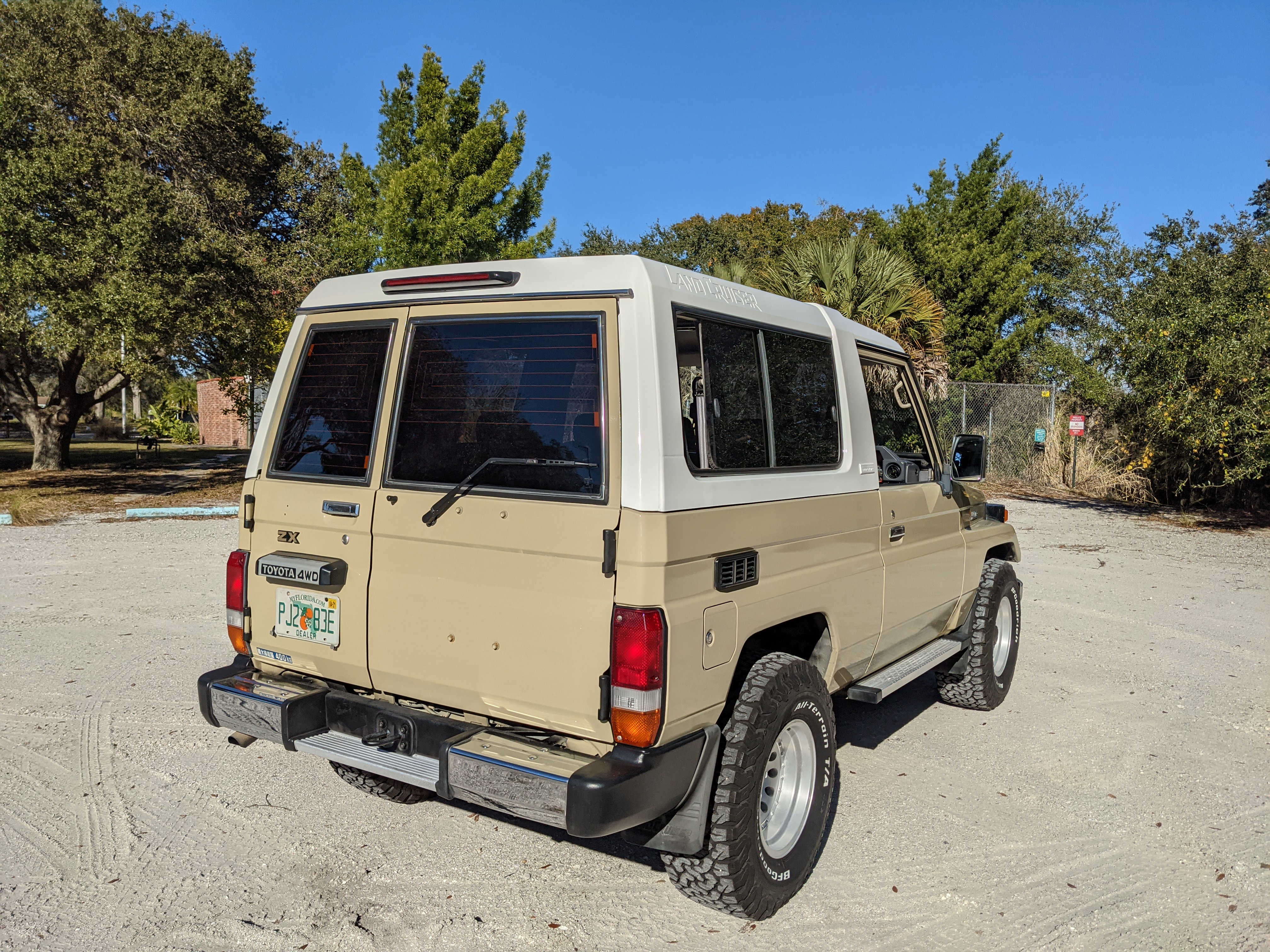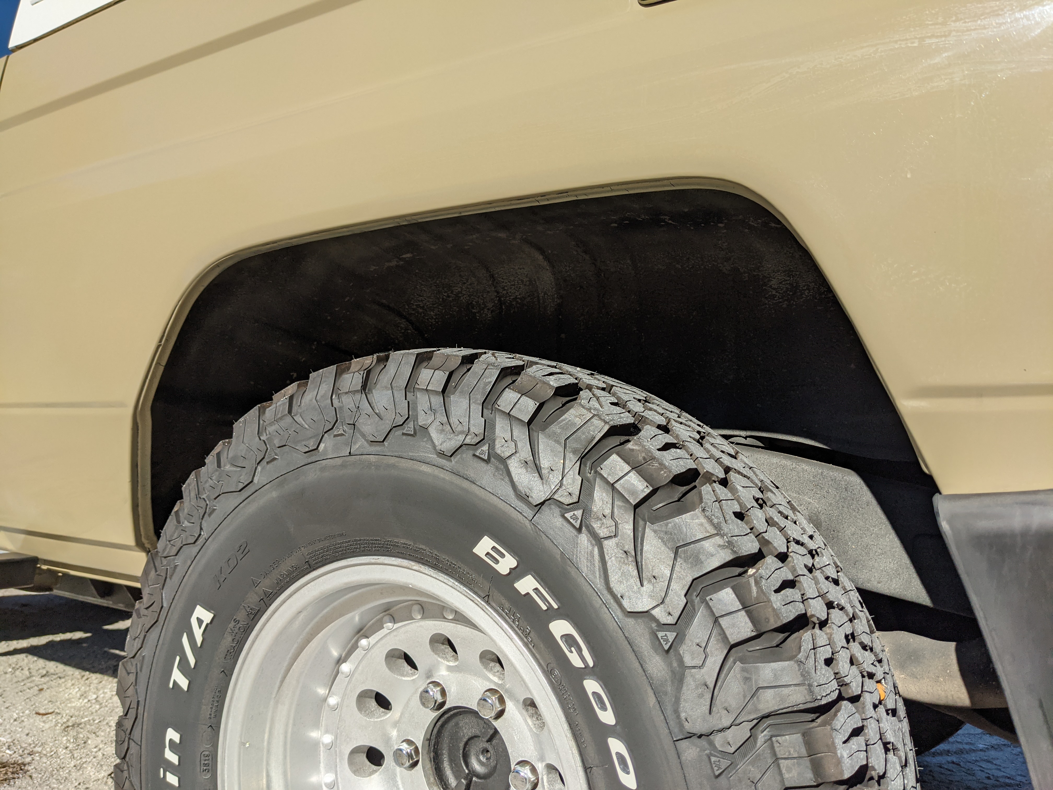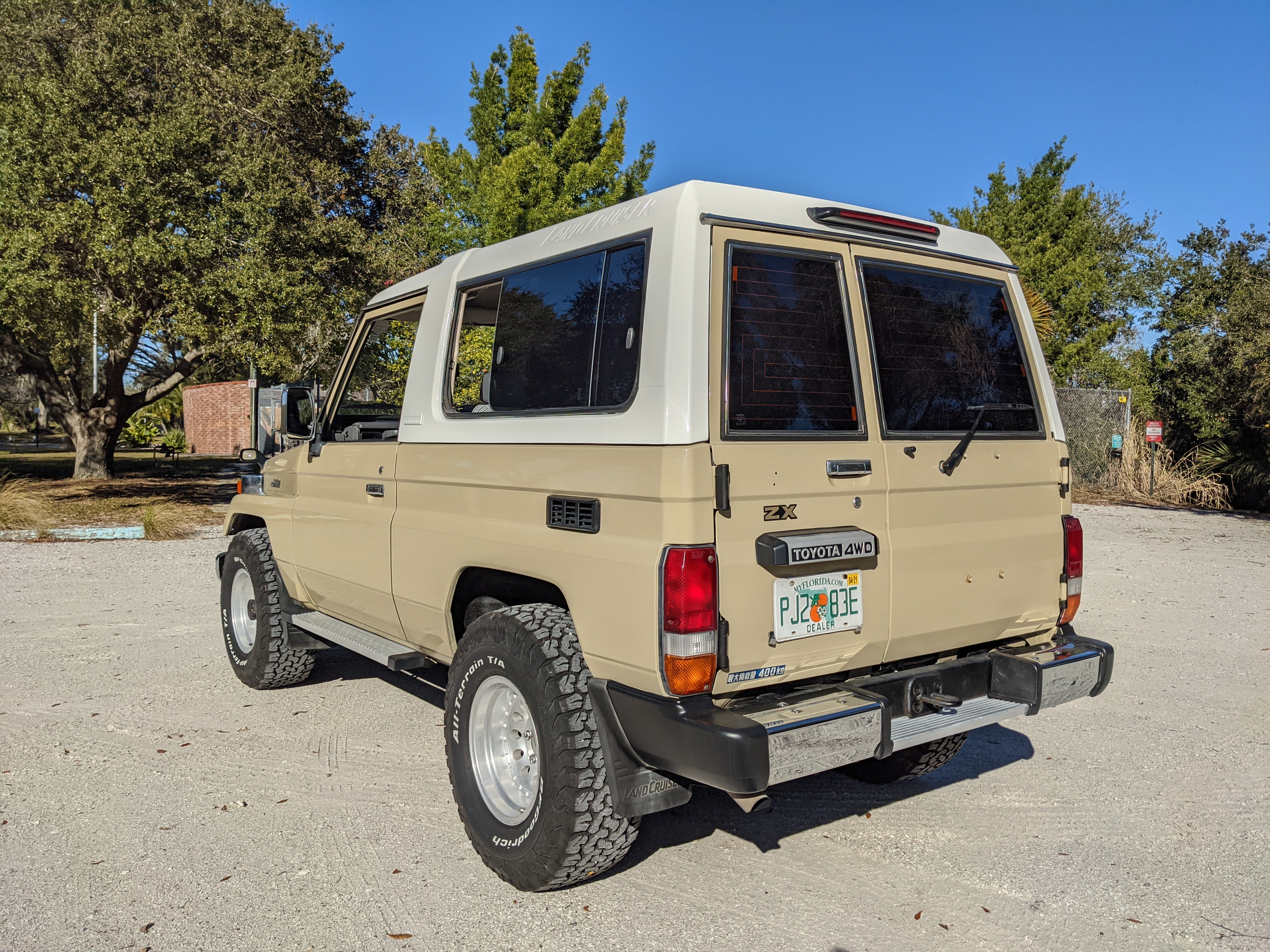 Desert tan on this narrow body model with a bright white FRP top gives a great contrast against most ‘always mad grrr’ designs that SUVs of this type typically wear these days. No dents or dings in the body work either, just straight, clean edges. Spare tire cover has been removed for an even more minimalist look. Aftermarket aluminum wheels are wrapped in brand new 32 inch BF Goodrich KO2s, white letters out.