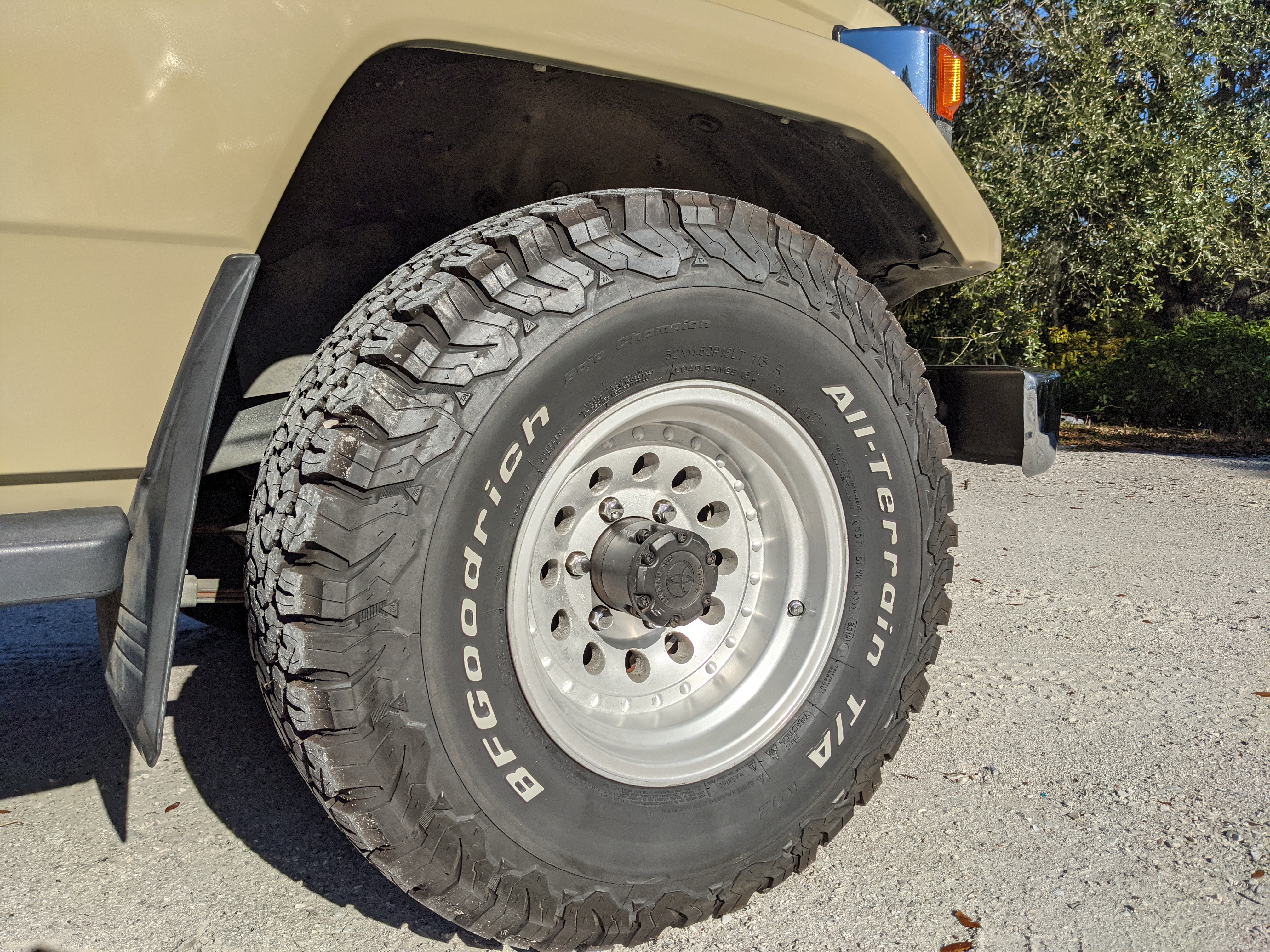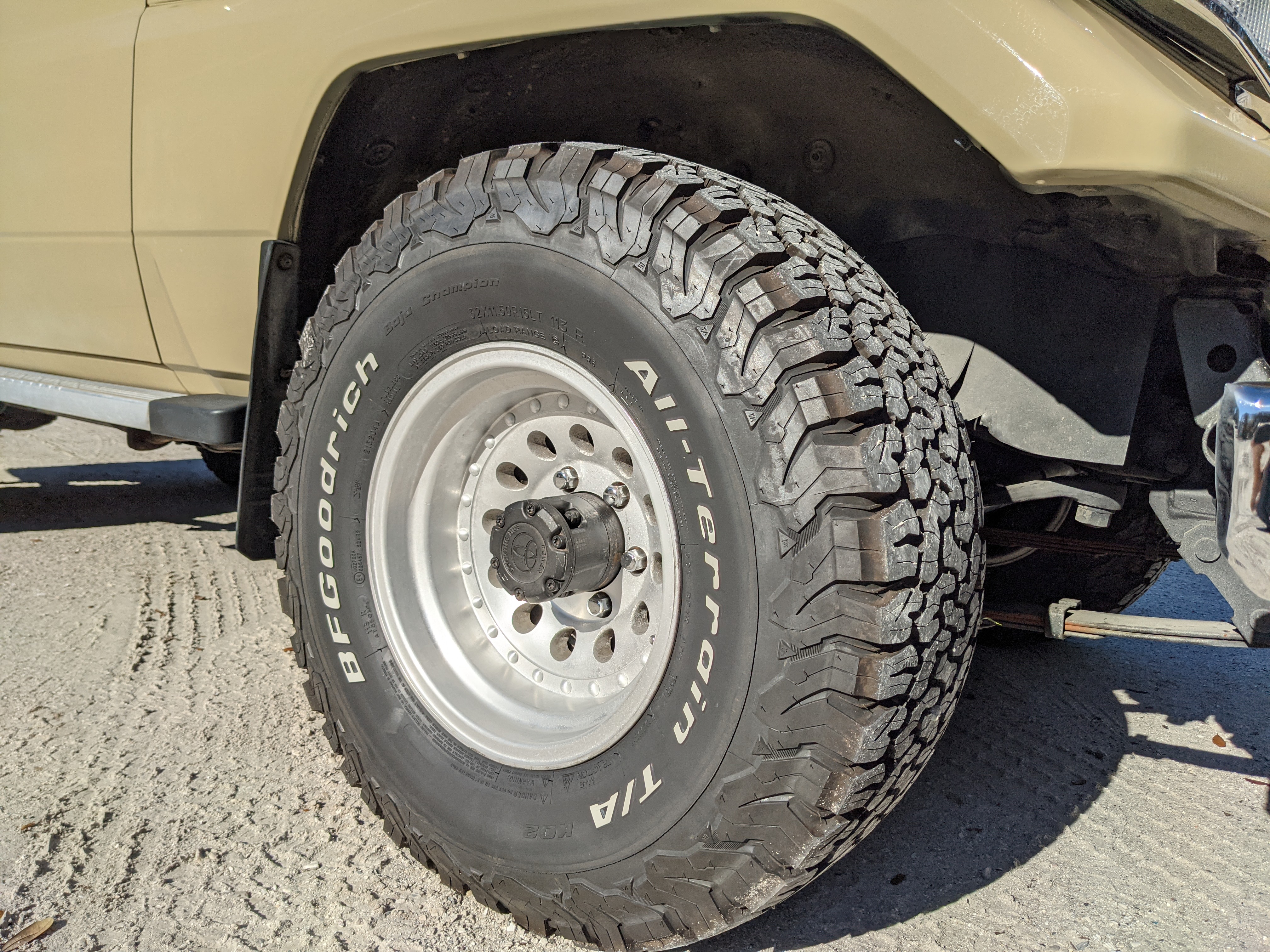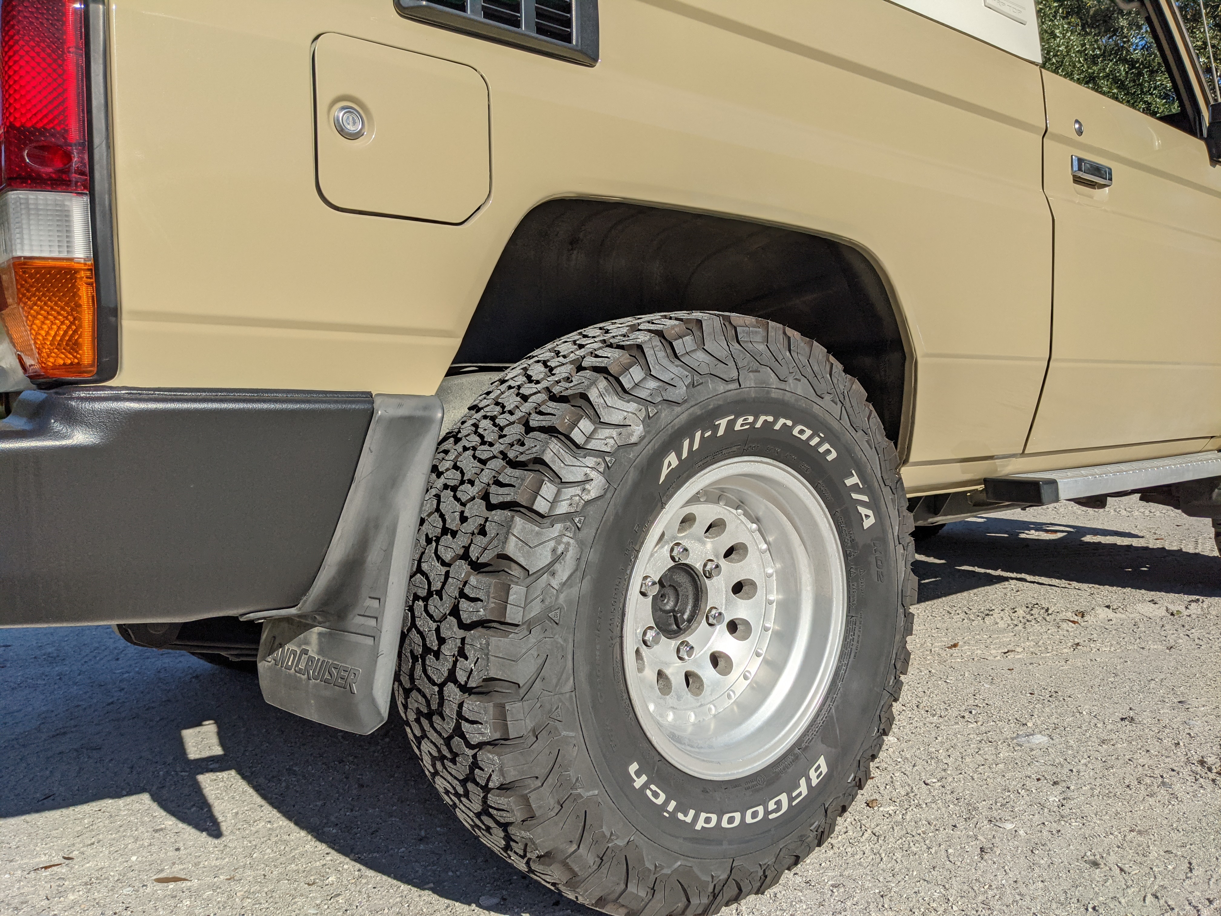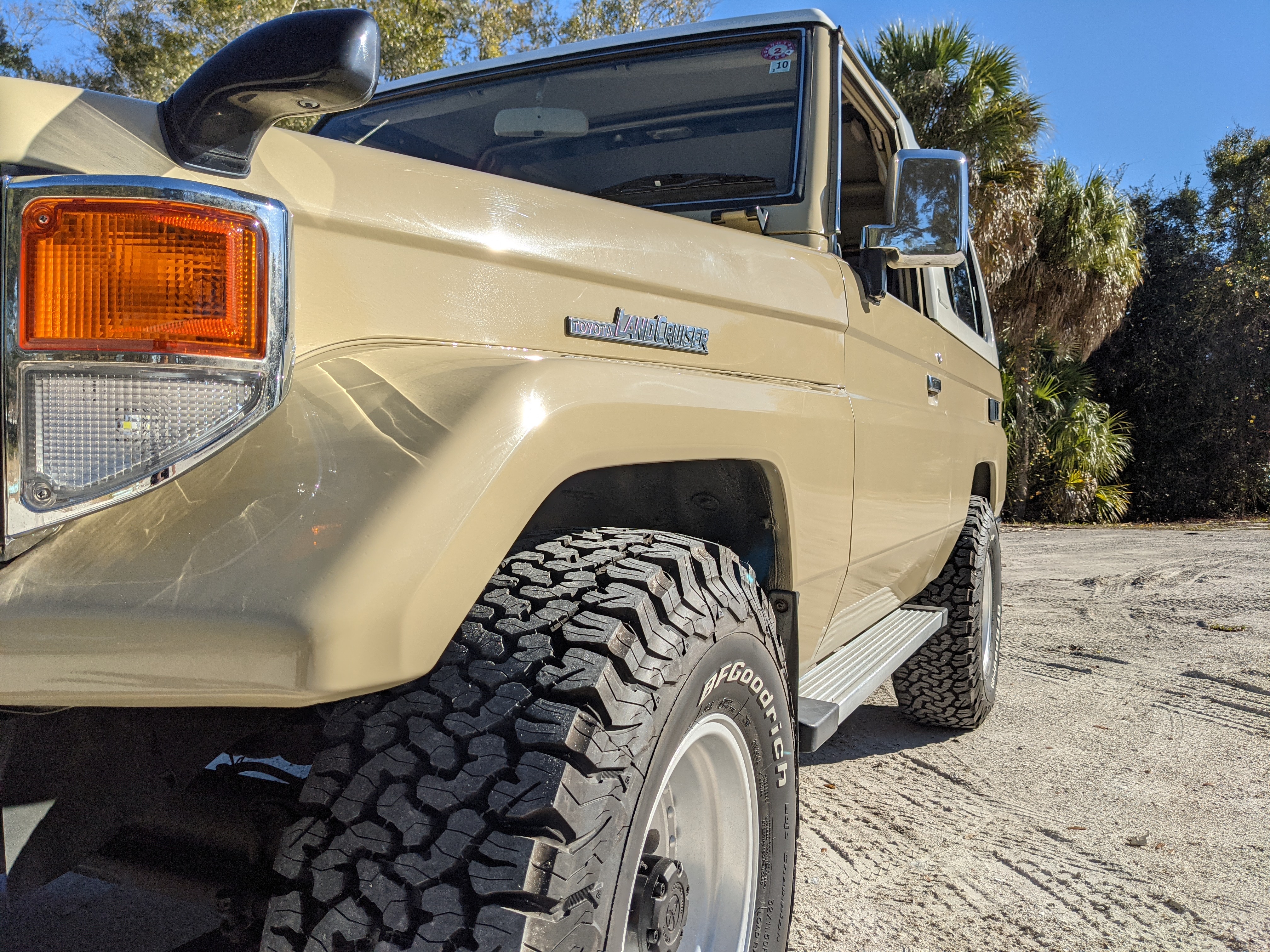 Desert tan on this narrow body model with a bright white FRP top gives a great contrast against most ‘always mad grrr’ designs that SUVs of this type typically wear these days. No dents or dings in the body work either, just straight, clean edges. Spare tire cover has been removed for an even more minimalist look. Aftermarket aluminum wheels are wrapped in brand new 32 inch BF Goodrich KO2s, white letters out.