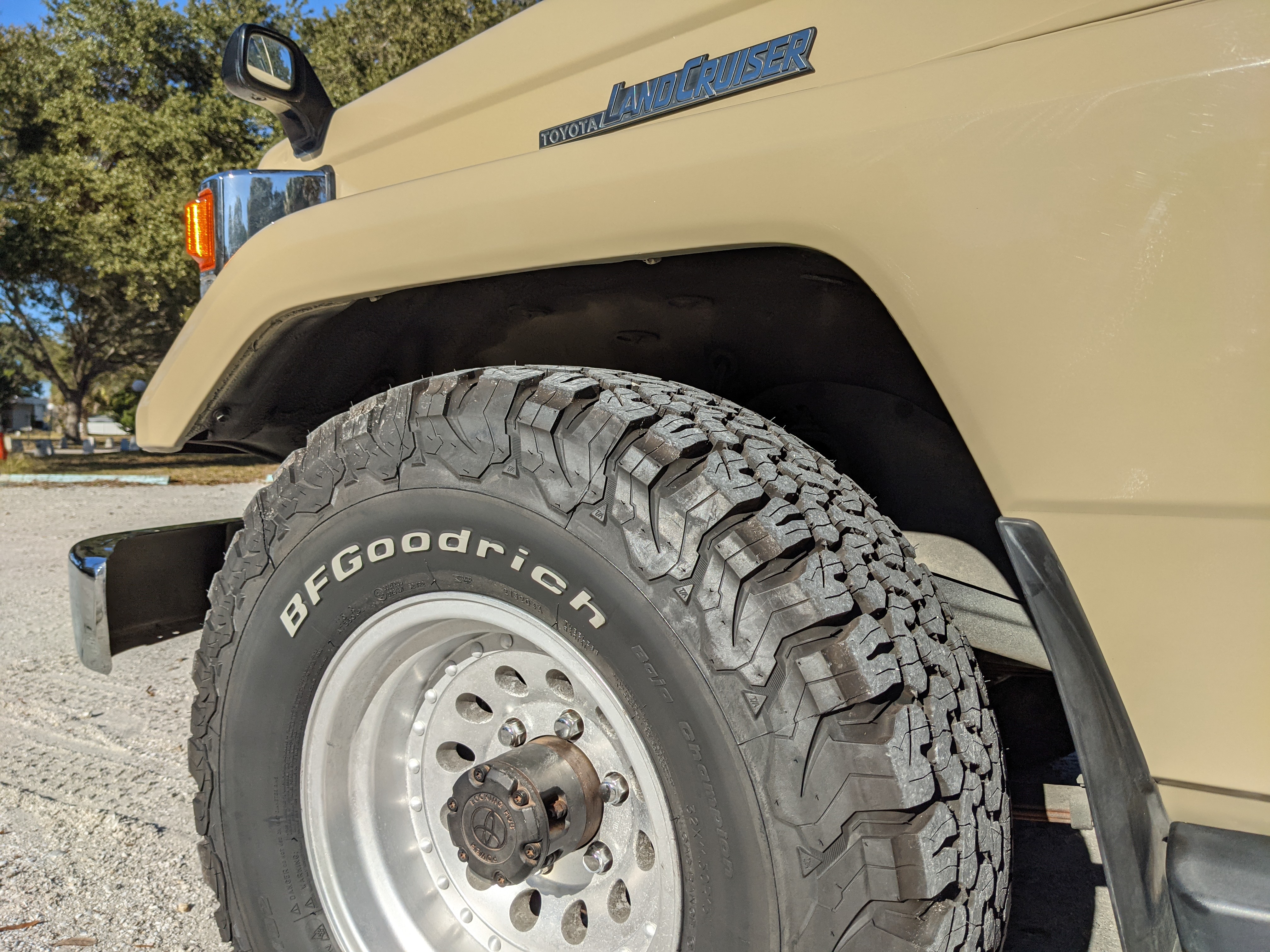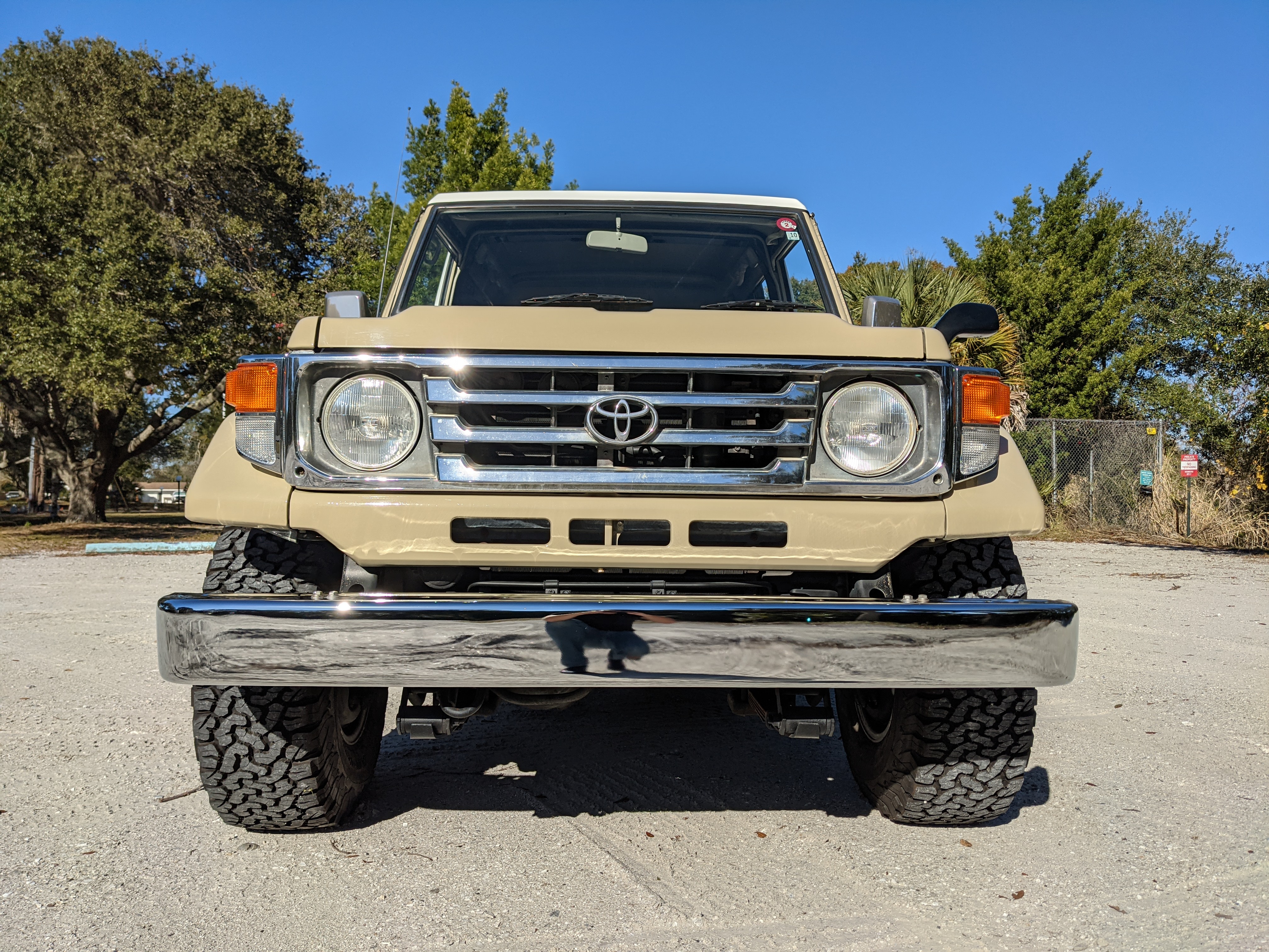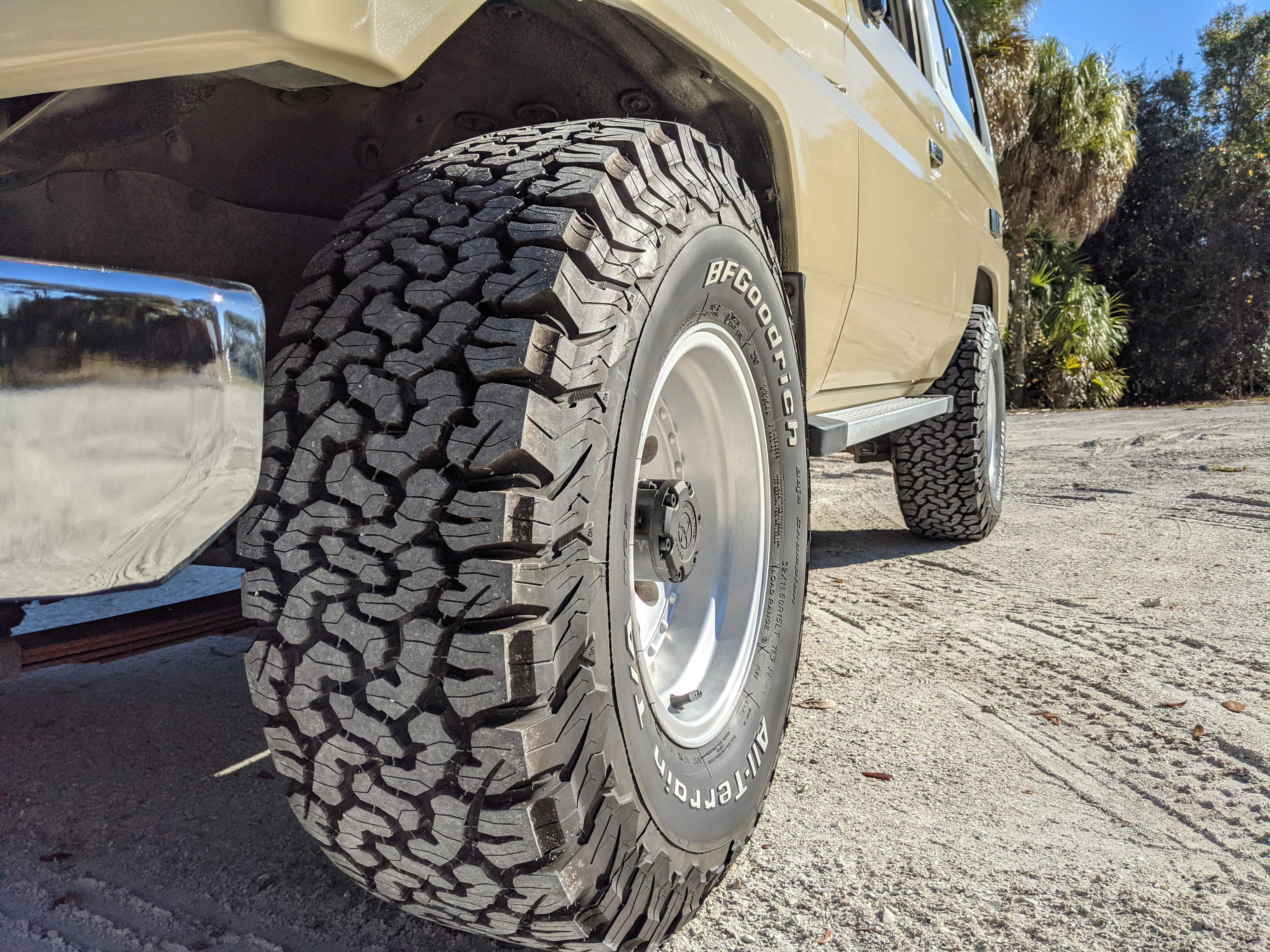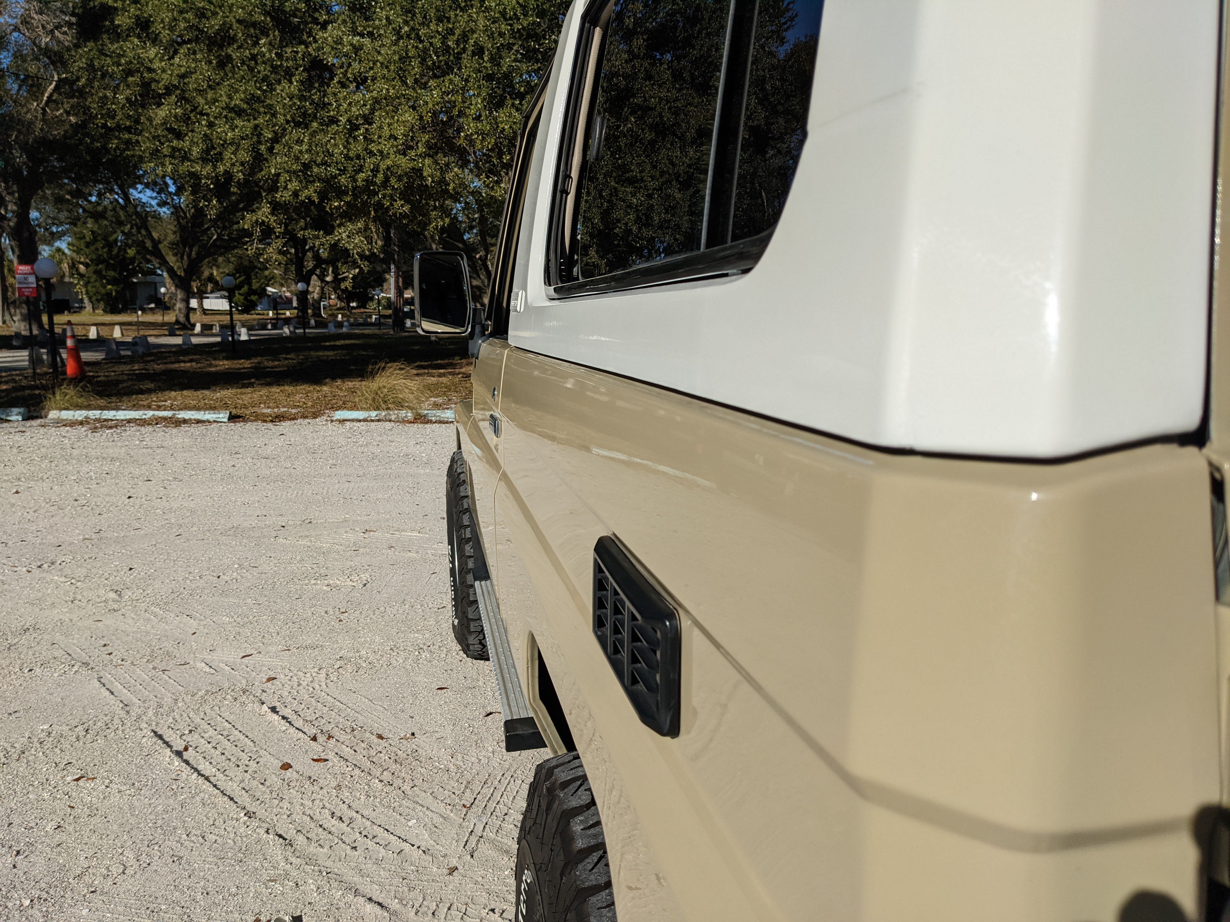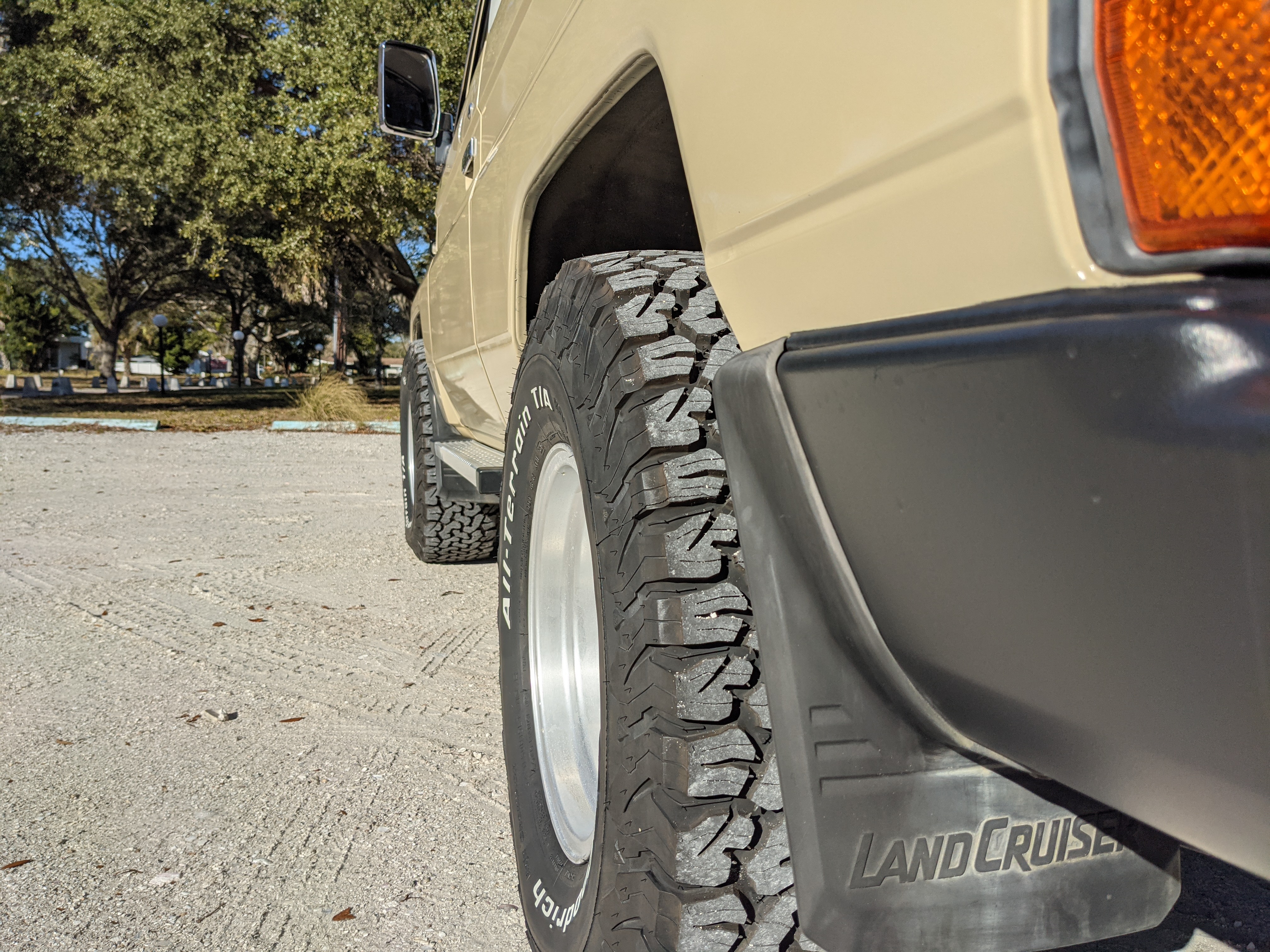 Desert tan on this narrow body model with a bright white FRP top gives a great contrast against most ‘always mad grrr’ designs that SUVs of this type typically wear these days. No dents or dings in the body work either, just straight, clean edges. Spare tire cover has been removed for an even more minimalist look. Aftermarket aluminum wheels are wrapped in brand new 32 inch BF Goodrich KO2s, white letters out.