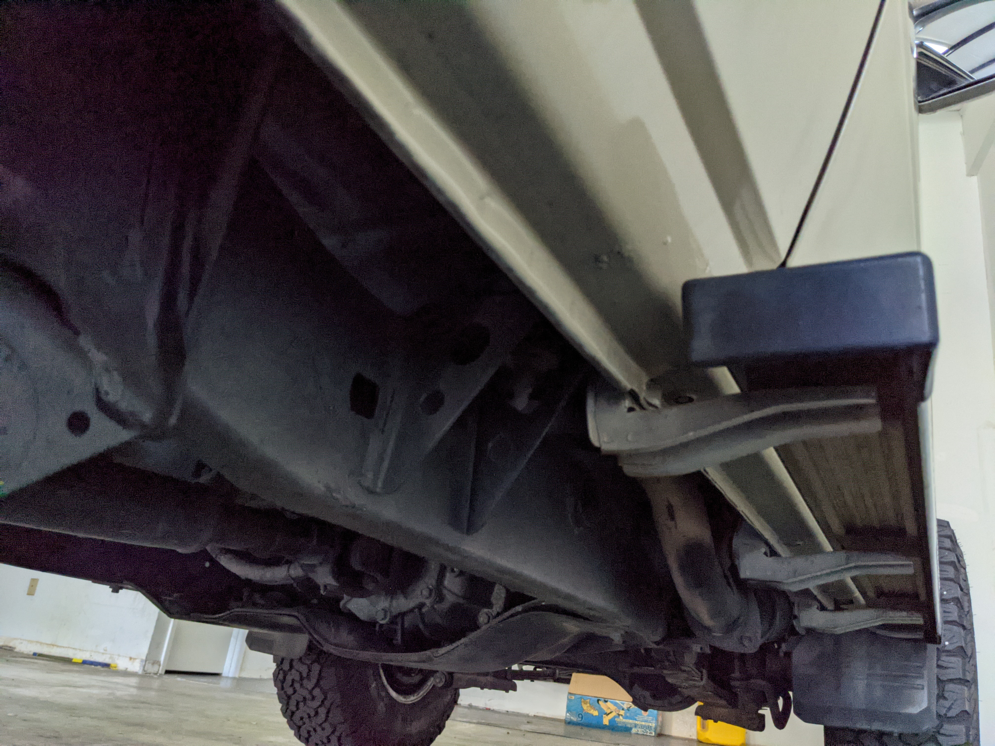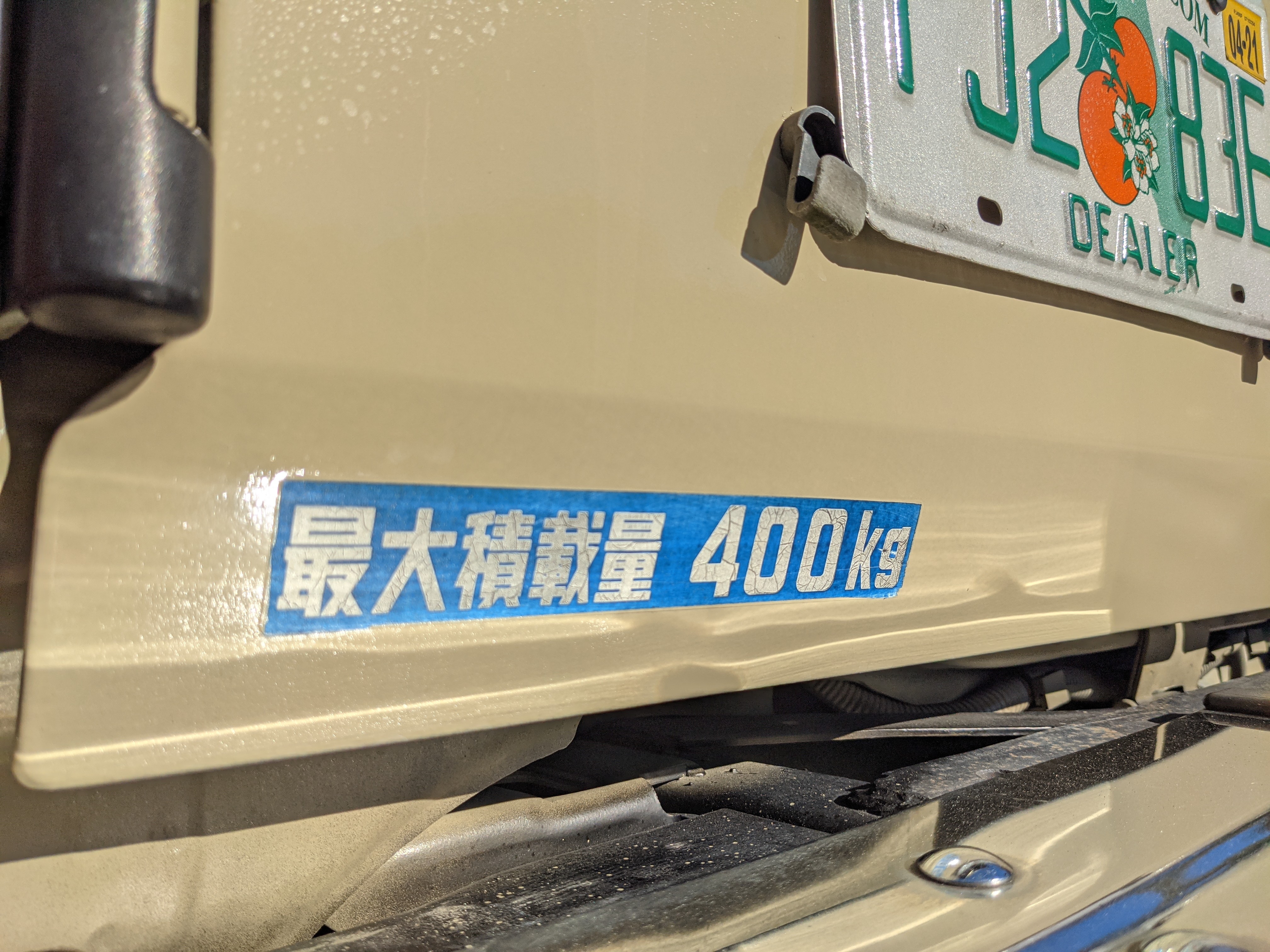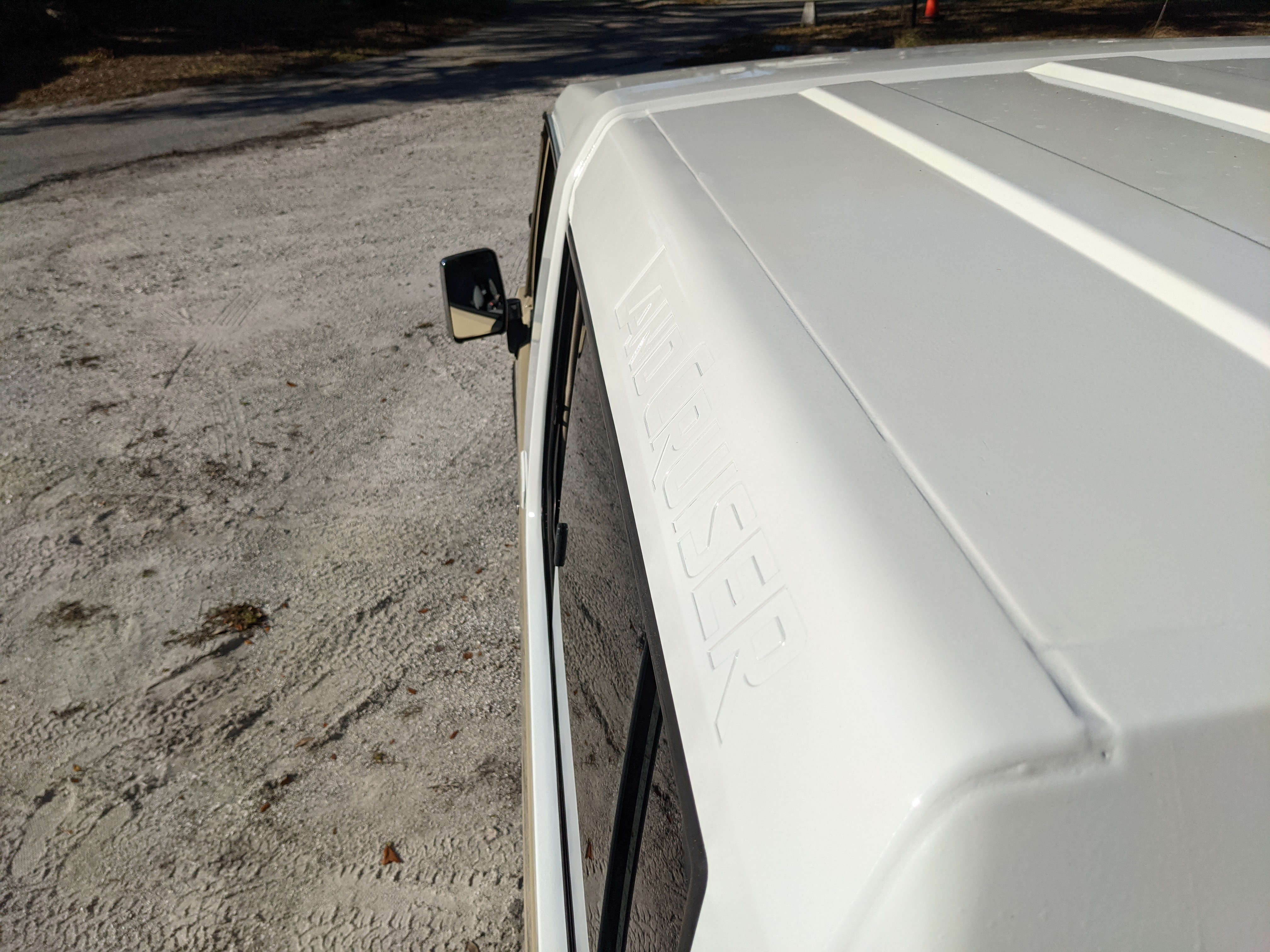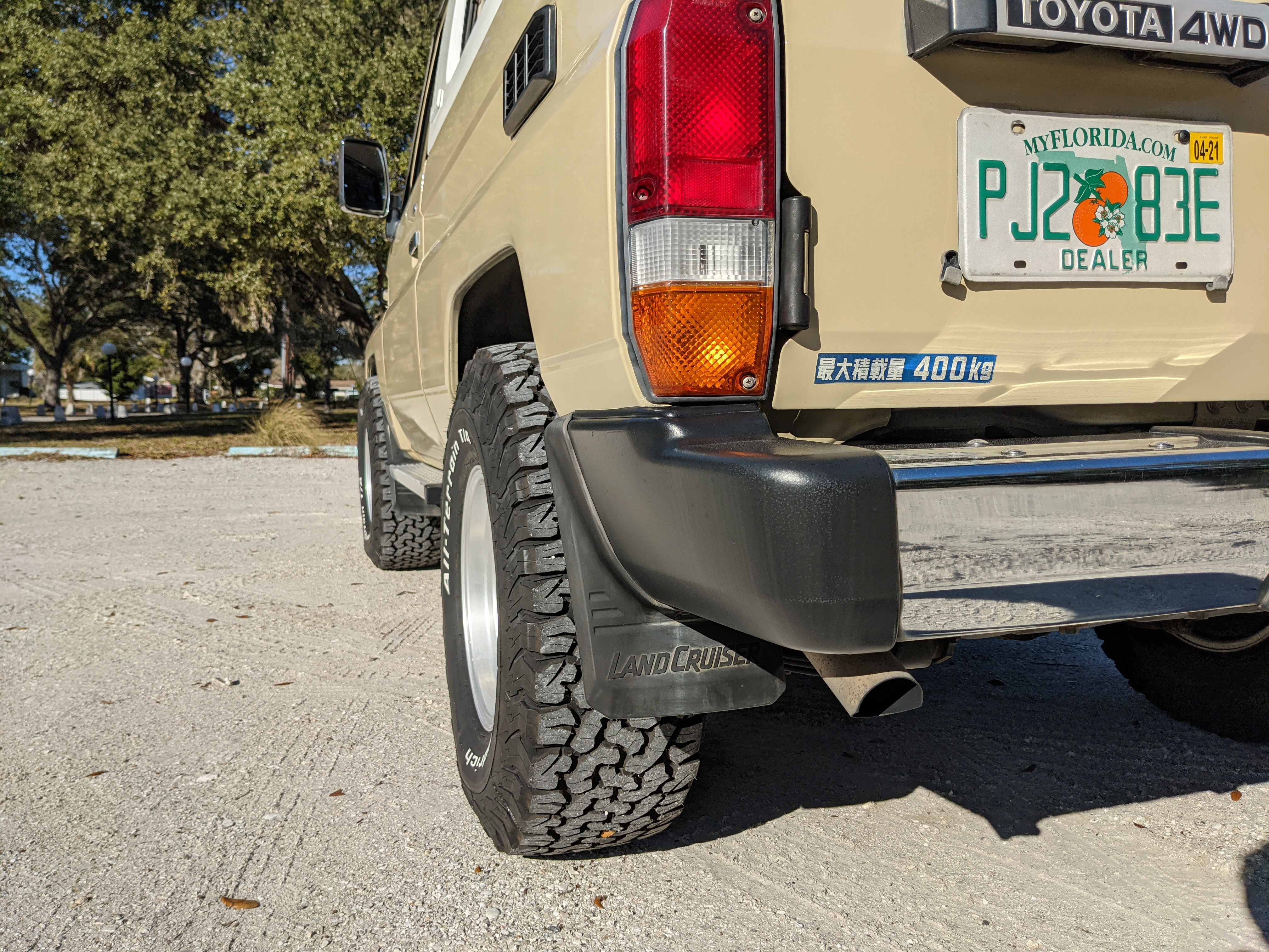 Desert tan on this narrow body model with a bright white FRP top gives a great contrast against most ‘always mad grrr’ designs that SUVs of this type typically wear these days. No dents or dings in the body work either, just straight, clean edges. Spare tire cover has been removed for an even more minimalist look. Aftermarket aluminum wheels are wrapped in brand new 32 inch BF Goodrich KO2s, white letters out.