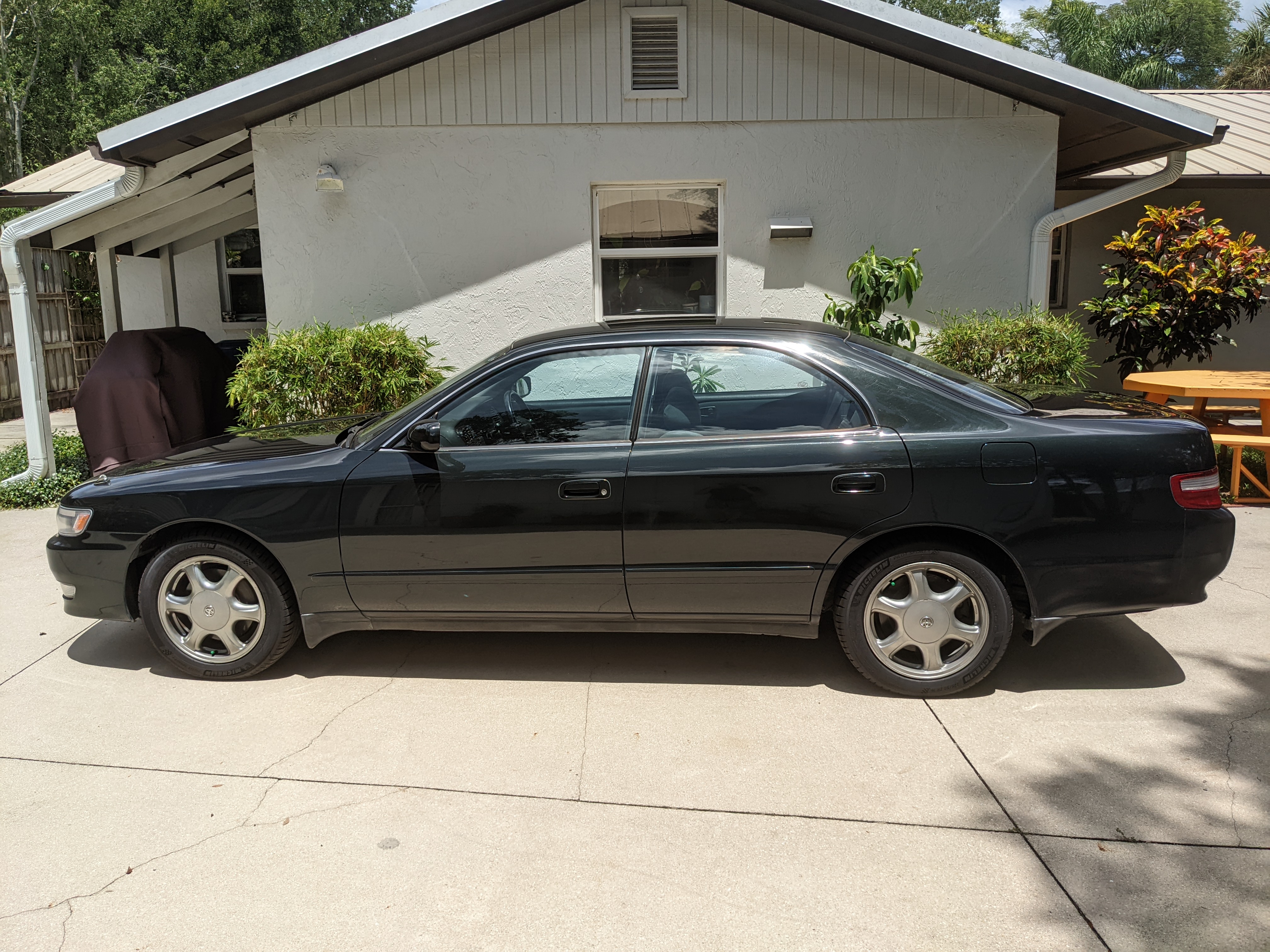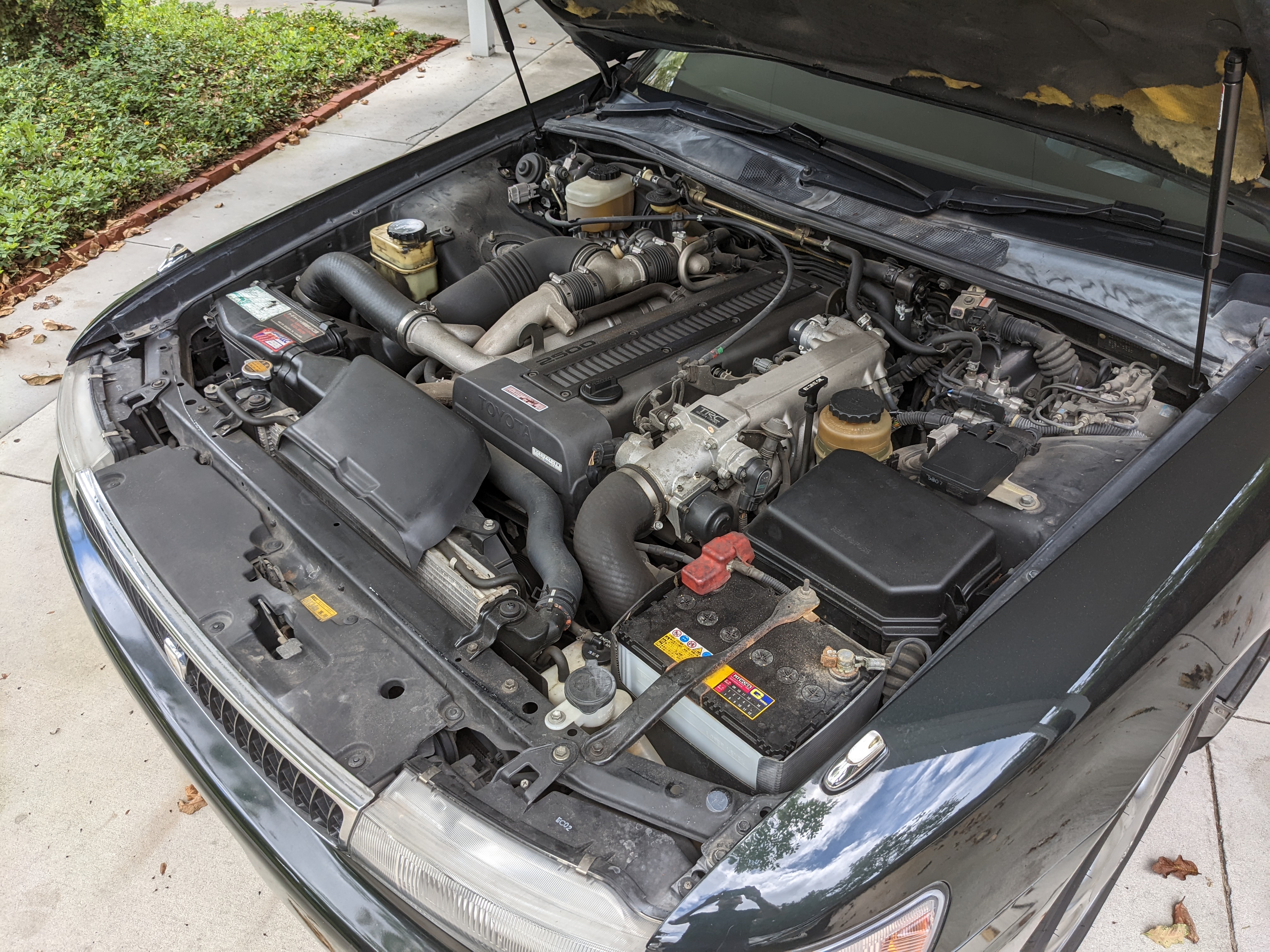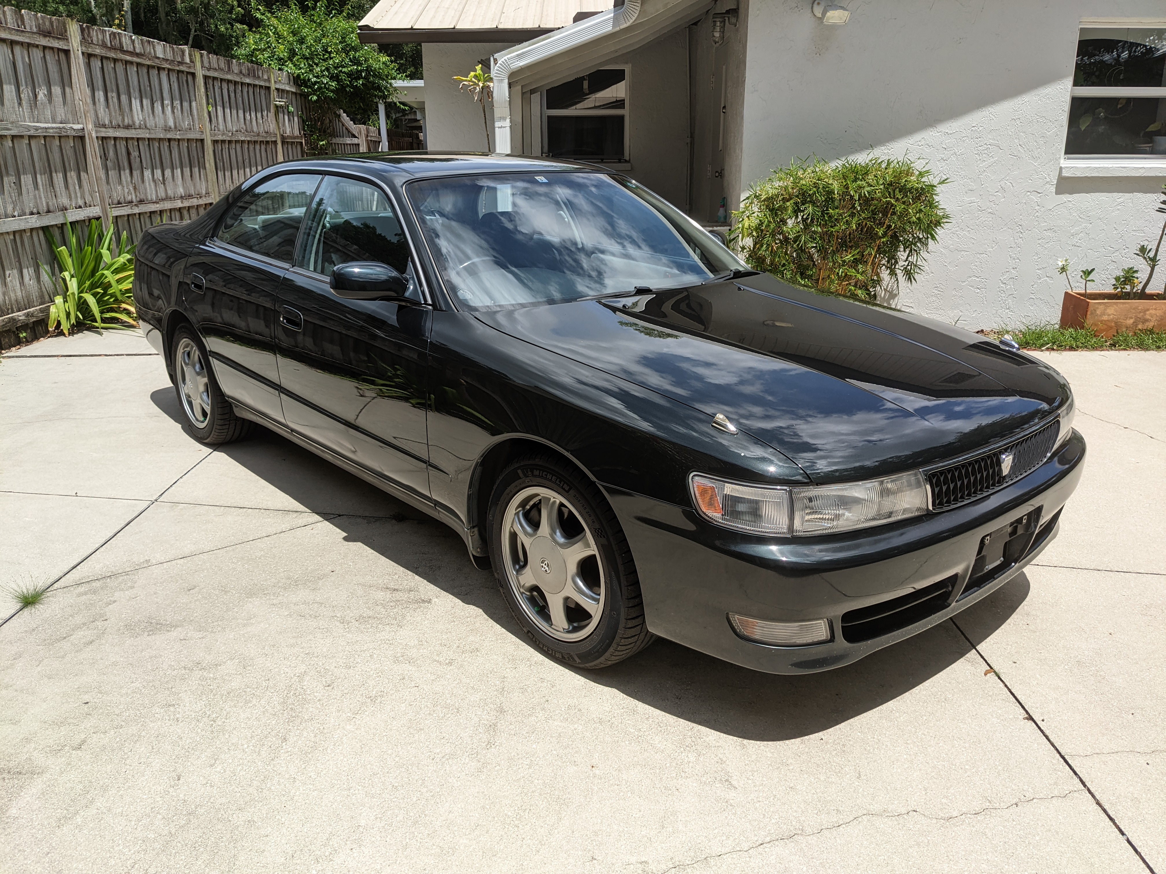 Alright so, enough history. This brings us to the car you see before you: a dark green, perfectly intact and completely stock, JZX90 Toyota Chaser Tourer V. "Tourer V" is the nameplate that would replace the "GT twin-turbo" with the advent of the X90 series cars, but denotes the highest performance variant all the same. Rated at 276 hp, which is the highest allowed at the time by Japanese law, and has been subsequently shown to be significantly lower than what the car actually produces, this car is quick. Power delivery is smooth, predictable, and when you really get on it, the turbo spool is really something. A long-geared transmission and limited-slip differential translate power cleanly and efficiently, and with a good set of tires (currently equipped with new Michelin Pilot Sport 4s), this car is, by all definitions, a sleeper. Additionally, both the 1JZ and 2JZ motors have been shown to have incredible power overhead, making them very popular for modification. Adding only a single turbo, a larger front mounted intercooler, bigger injectors, and a tune, most JZs will make nearly double stock horsepower numbers without opening up the engine or even breaking a sweat.