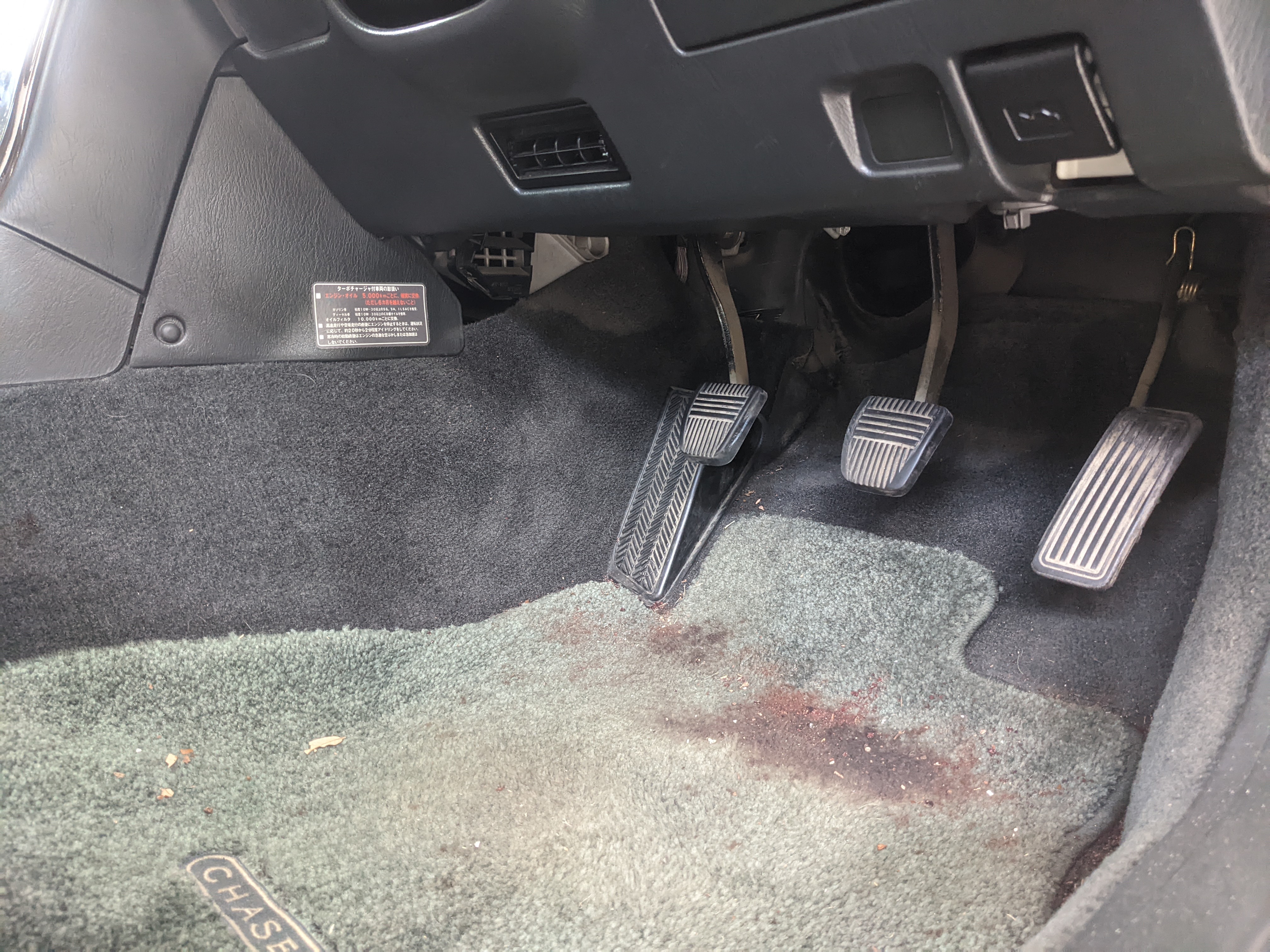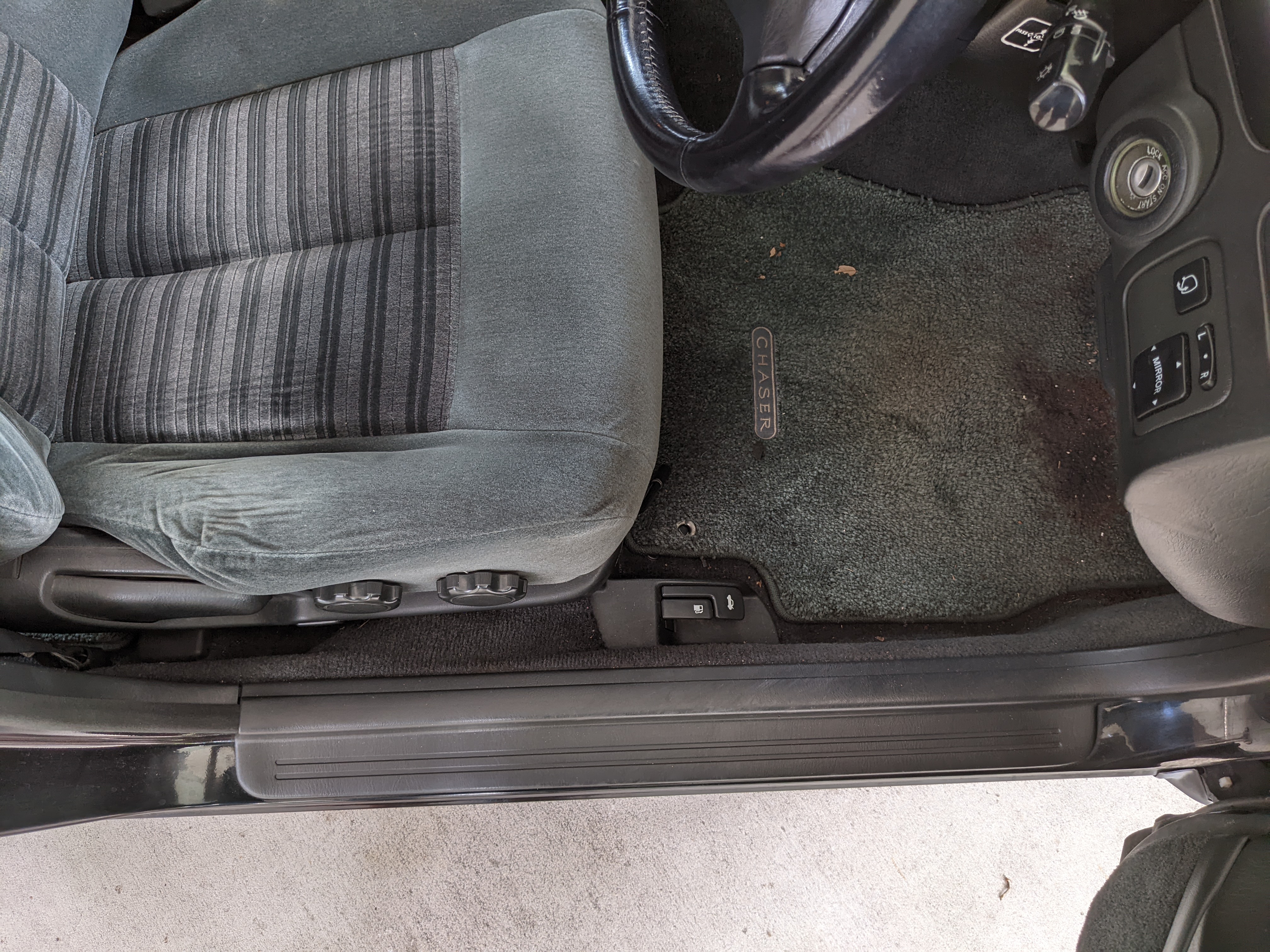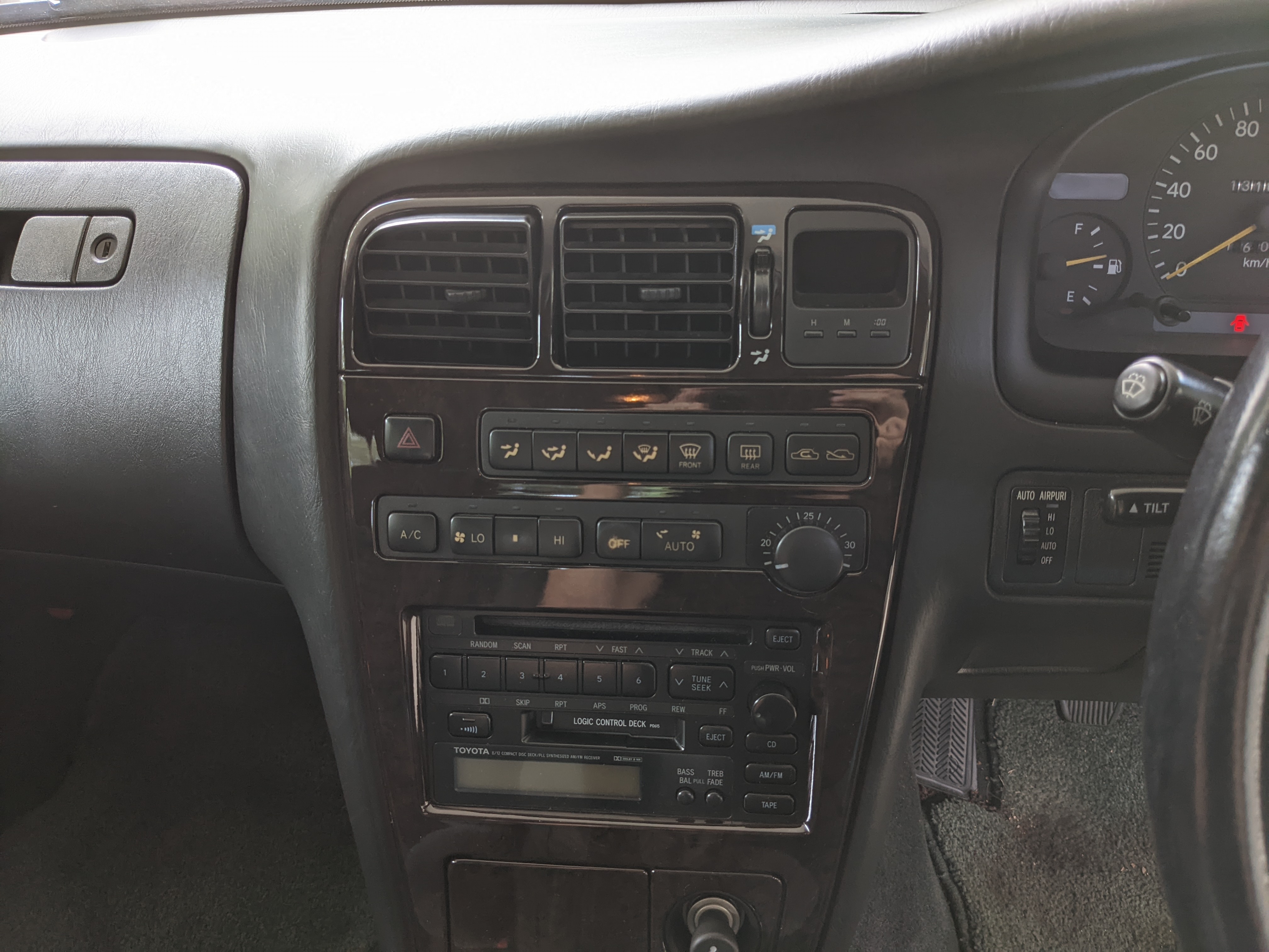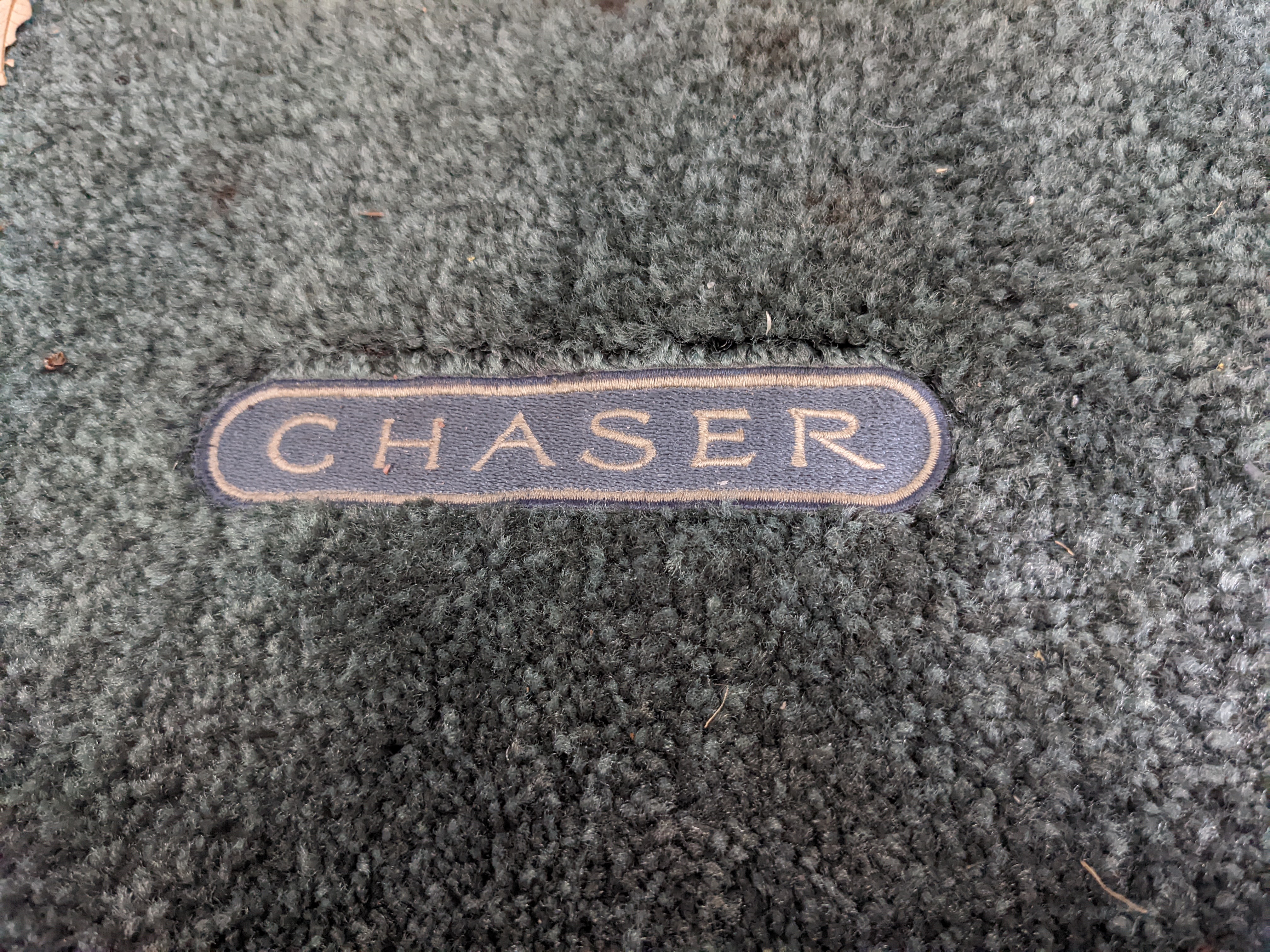 Likewise unmodified, the interior sports all the original furnishings, including the original factory stereo with working CD player and tape deck. I can not understate how cool this is. Most Japanese cars of this age undergo a stereo refit at least once in their lives, but nothing here has been touched, and the faux wood paneling shines with only very minor wear showing in a few places and on a few buttons. Equipped with a fabric interior with only minor sagging on the driver's side seat bolster, everything is intact and comfortable. The factory Chaser-branded floor mats are present, the driver's side showing wear and minor discoloration in the pedal box. Air conditioning is factory R134a, so service is easy, and blows very cold. The only issue with the car that we've identified is the driver's side rear door lock actuator motor is weak, resulting in the door not unlocking or locking with the rest of the vehicle. It took me a month of driving the car to notice this, as I did not use the back seats often. If there is time to replace it, I will, and update the price accordingly.