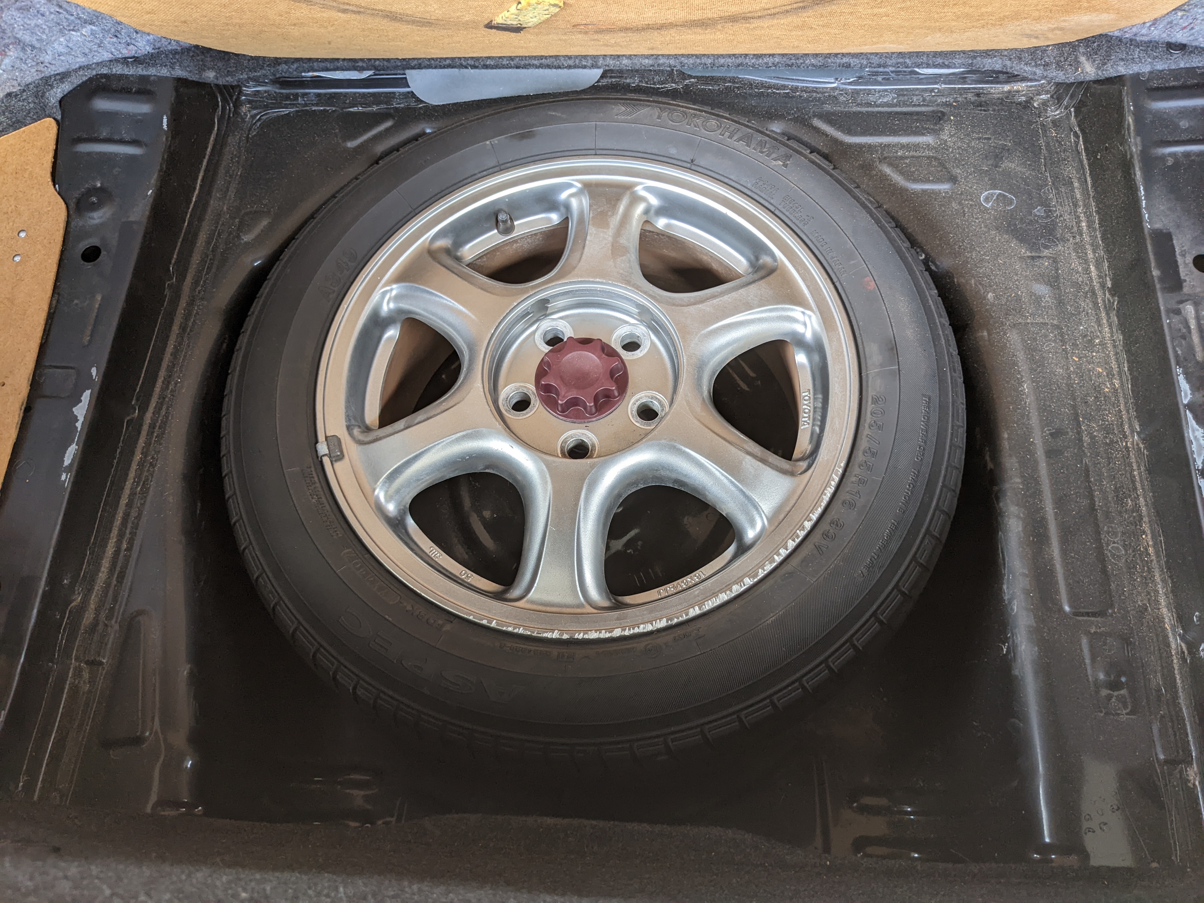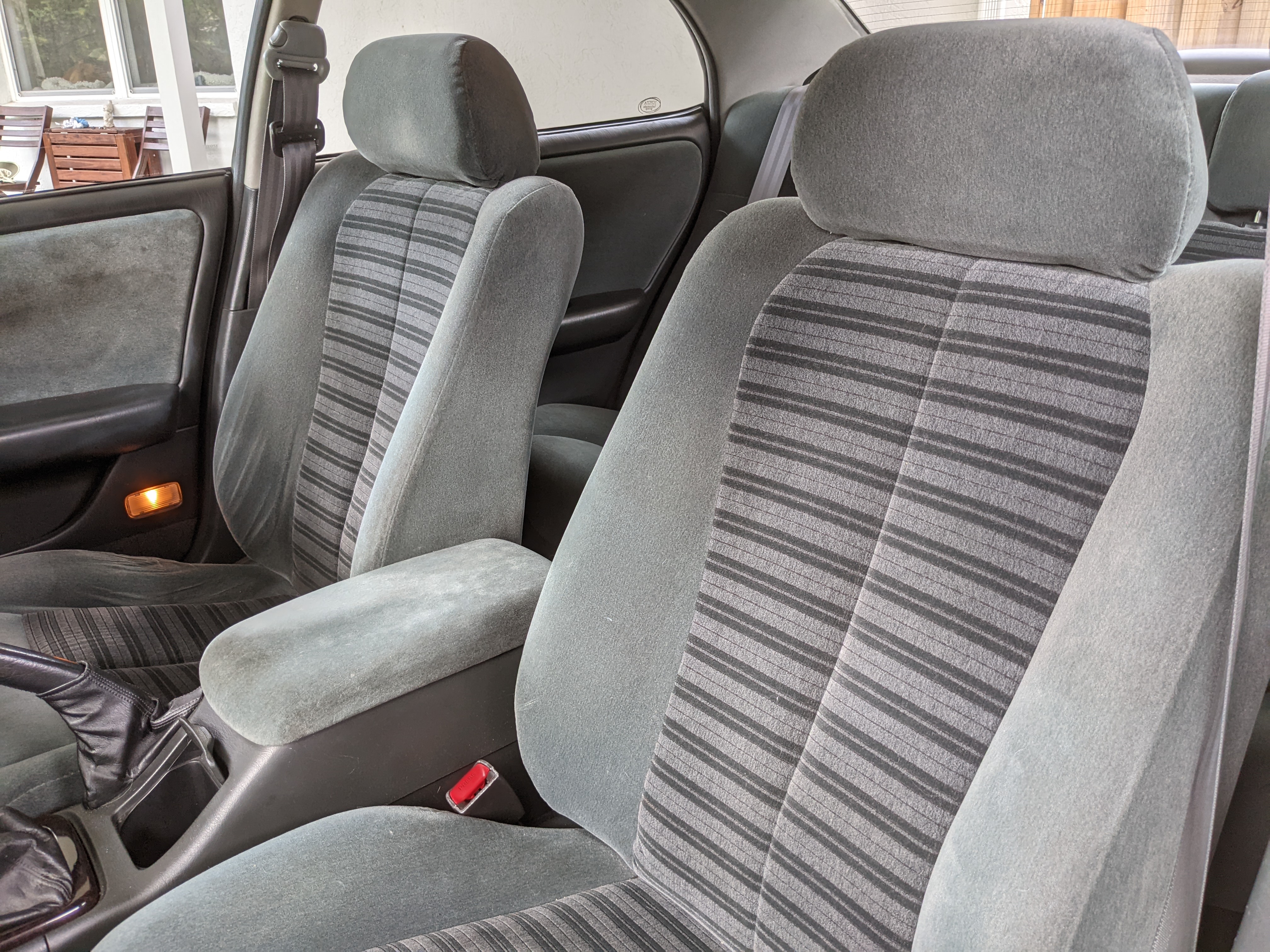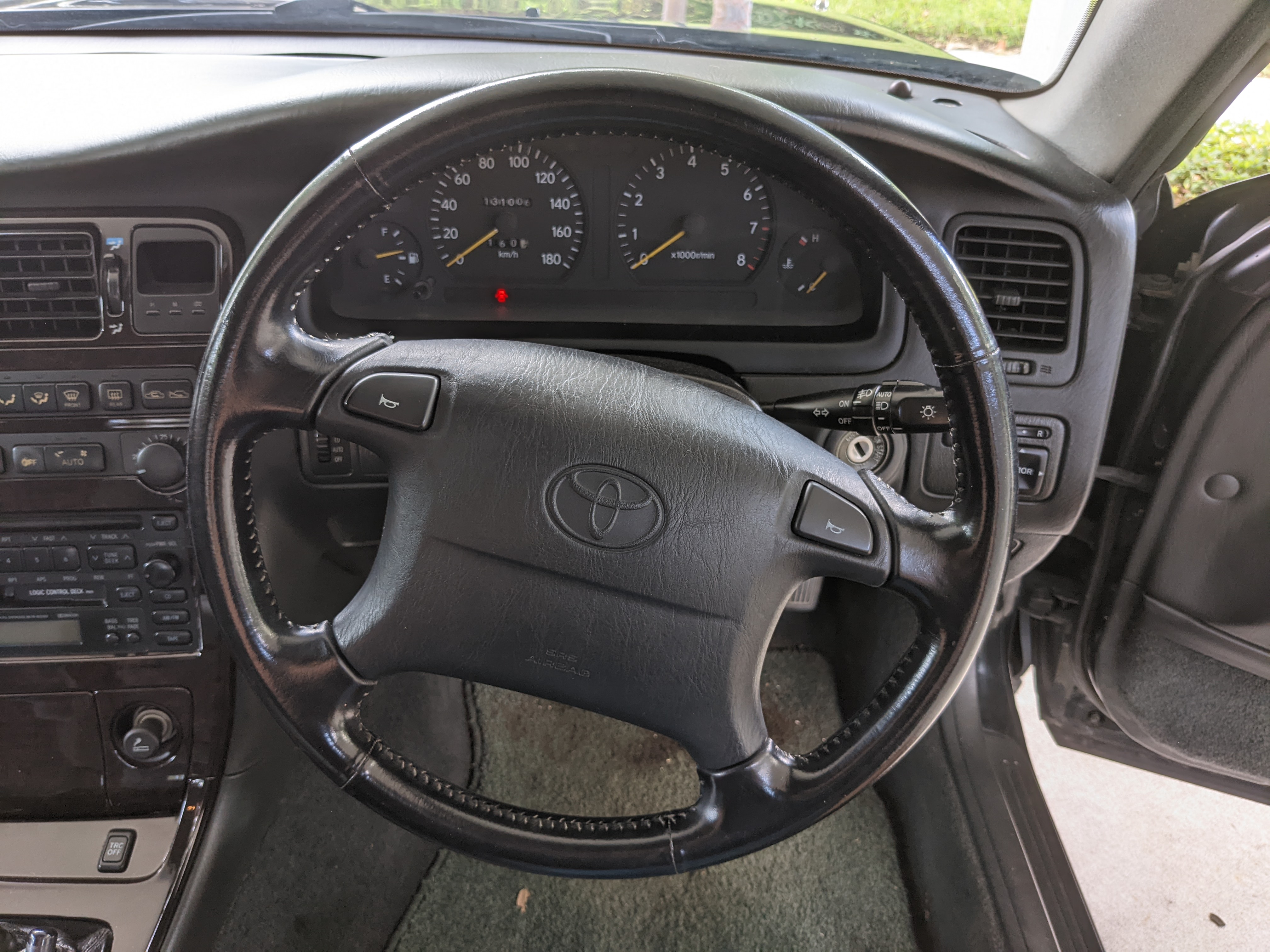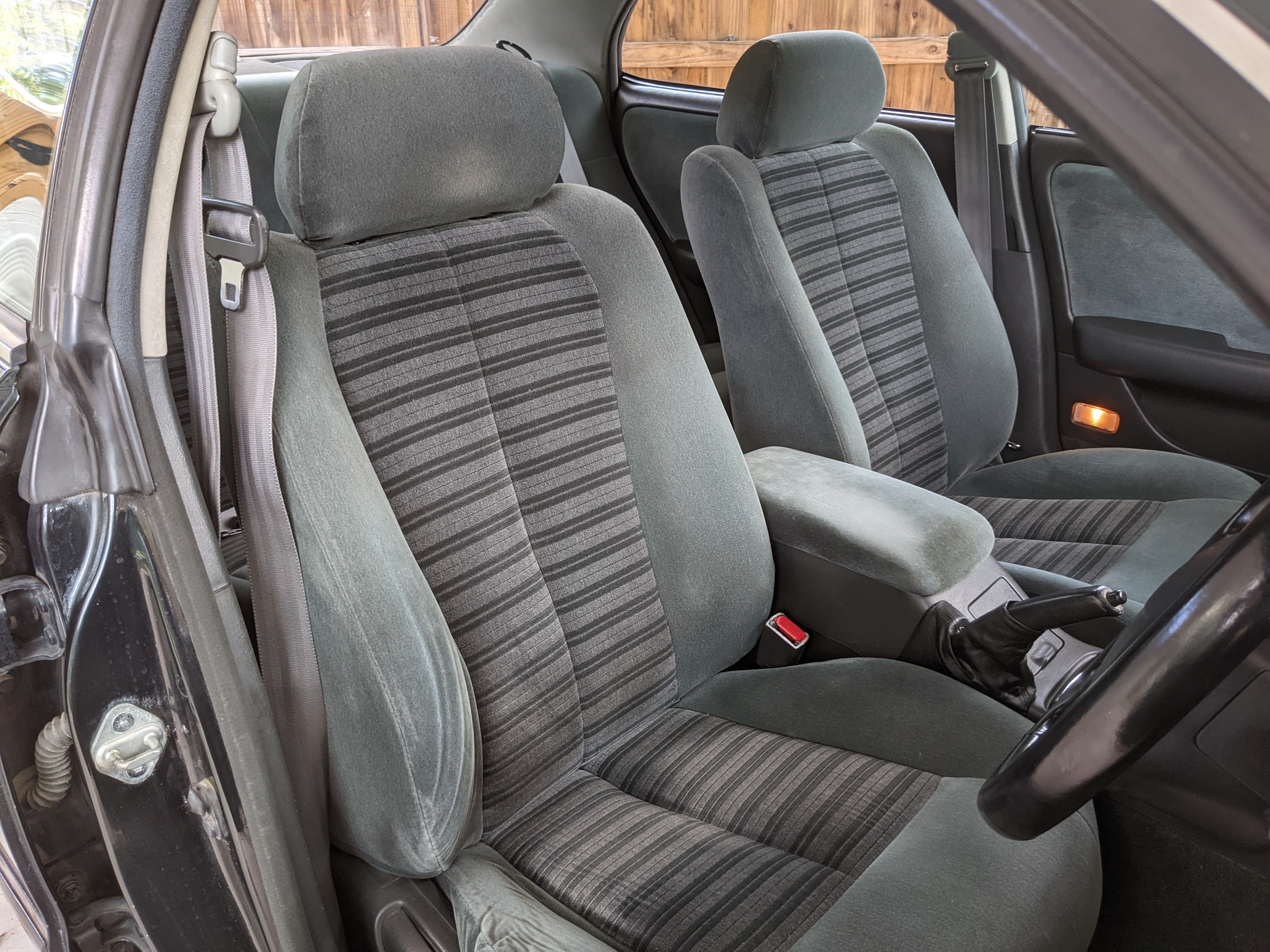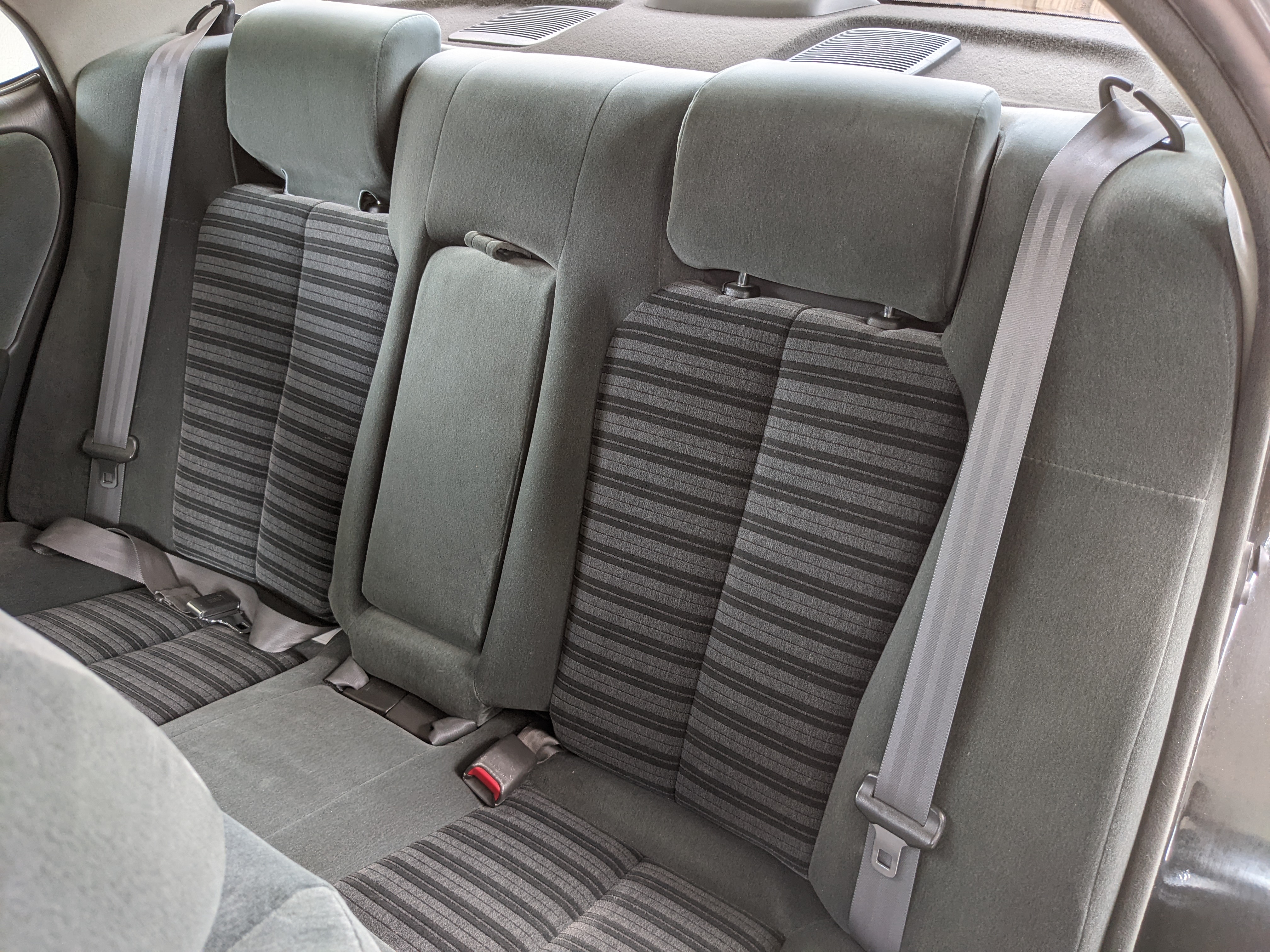 Likewise unmodified, the interior sports all the original furnishings, including the original factory stereo with working CD player and tape deck. I can not understate how cool this is. Most Japanese cars of this age undergo a stereo refit at least once in their lives, but nothing here has been touched, and the faux wood paneling shines with only very minor wear showing in a few places and on a few buttons. Equipped with a fabric interior with only minor sagging on the driver's side seat bolster, everything is intact and comfortable. The factory Chaser-branded floor mats are present, the driver's side showing wear and minor discoloration in the pedal box. Air conditioning is factory R134a, so service is easy, and blows very cold. The only issue with the car that we've identified is the driver's side rear door lock actuator motor is weak, resulting in the door not unlocking or locking with the rest of the vehicle. It took me a month of driving the car to notice this, as I did not use the back seats often. If there is time to replace it, I will, and update the price accordingly.