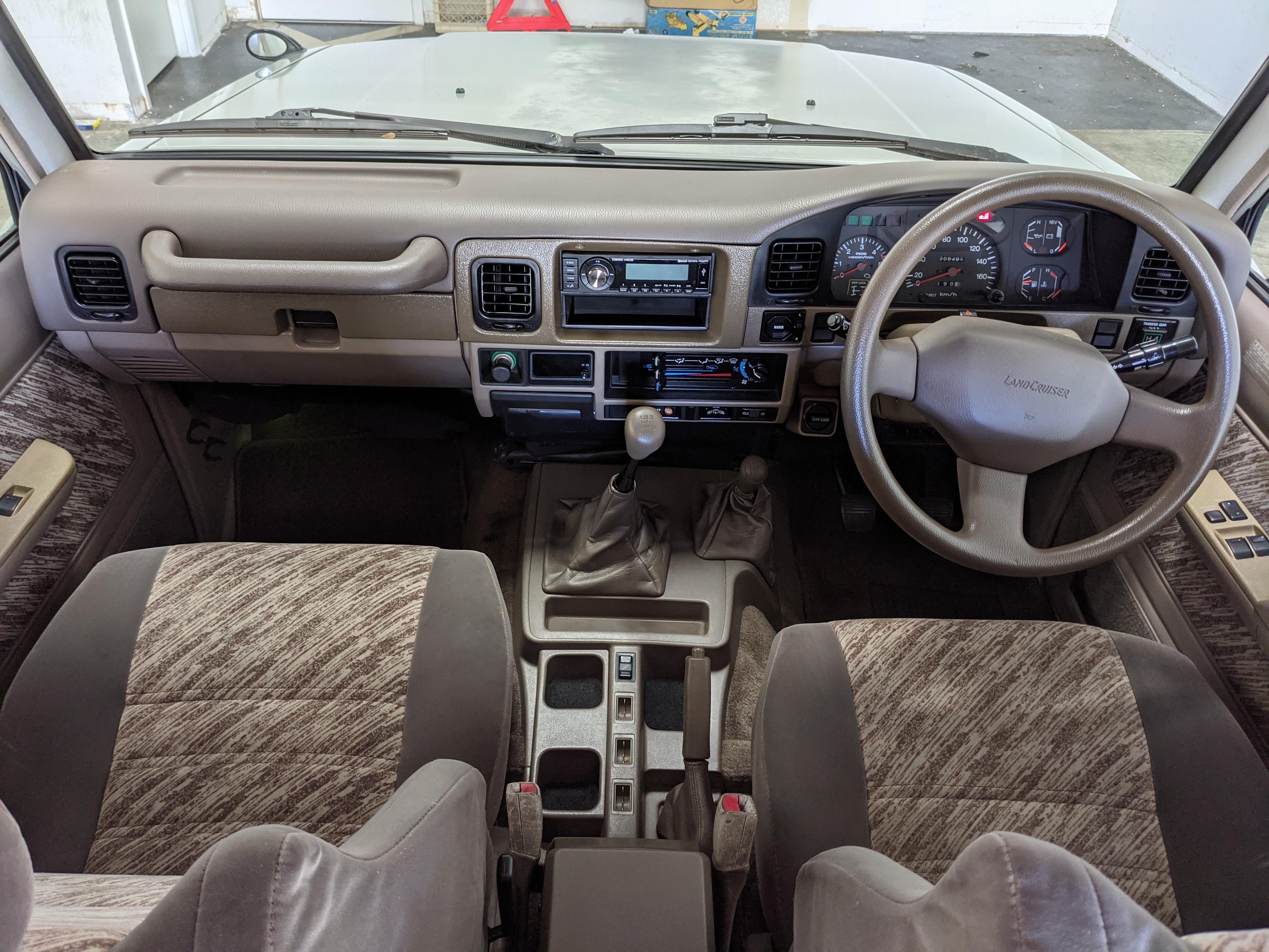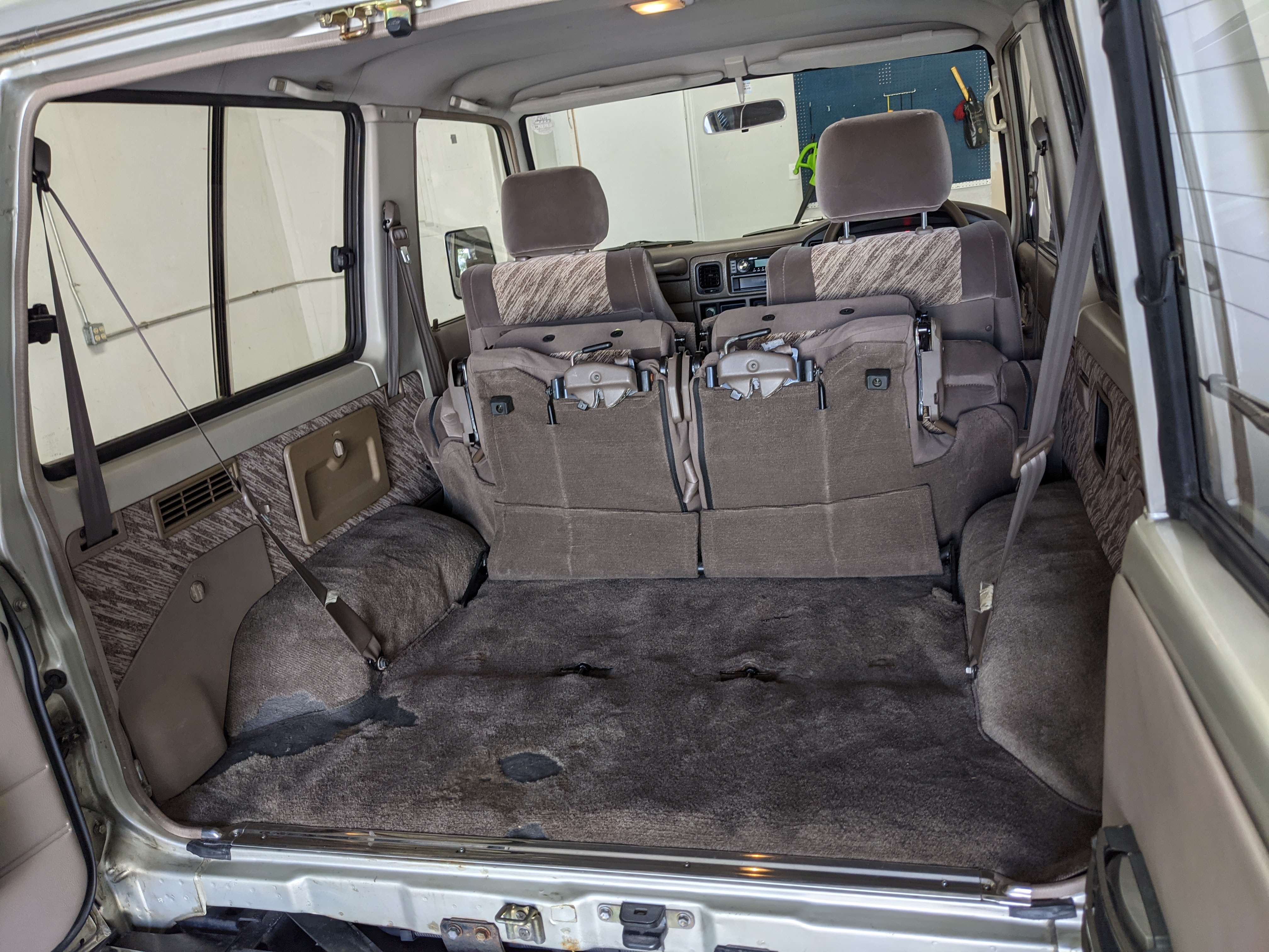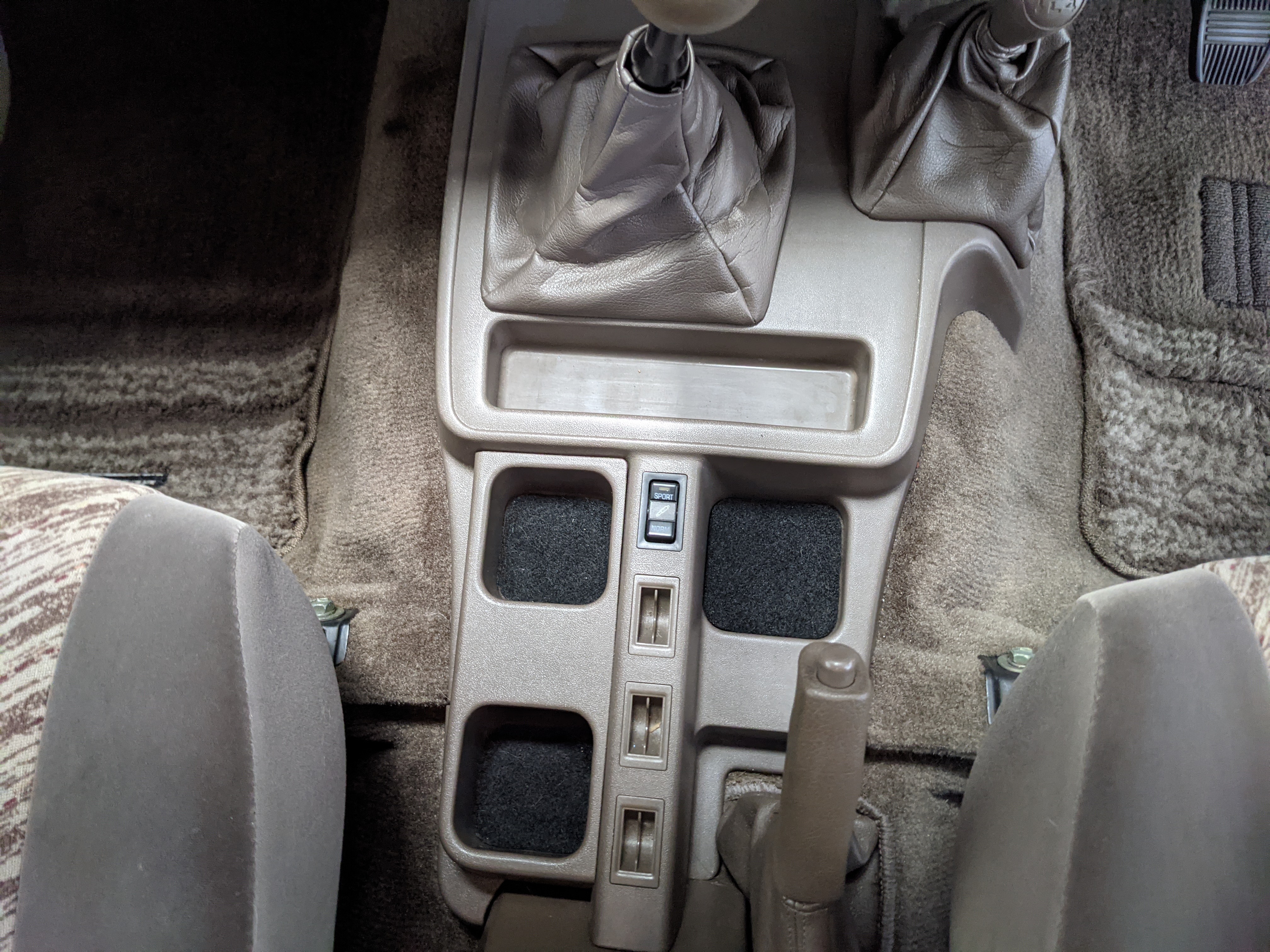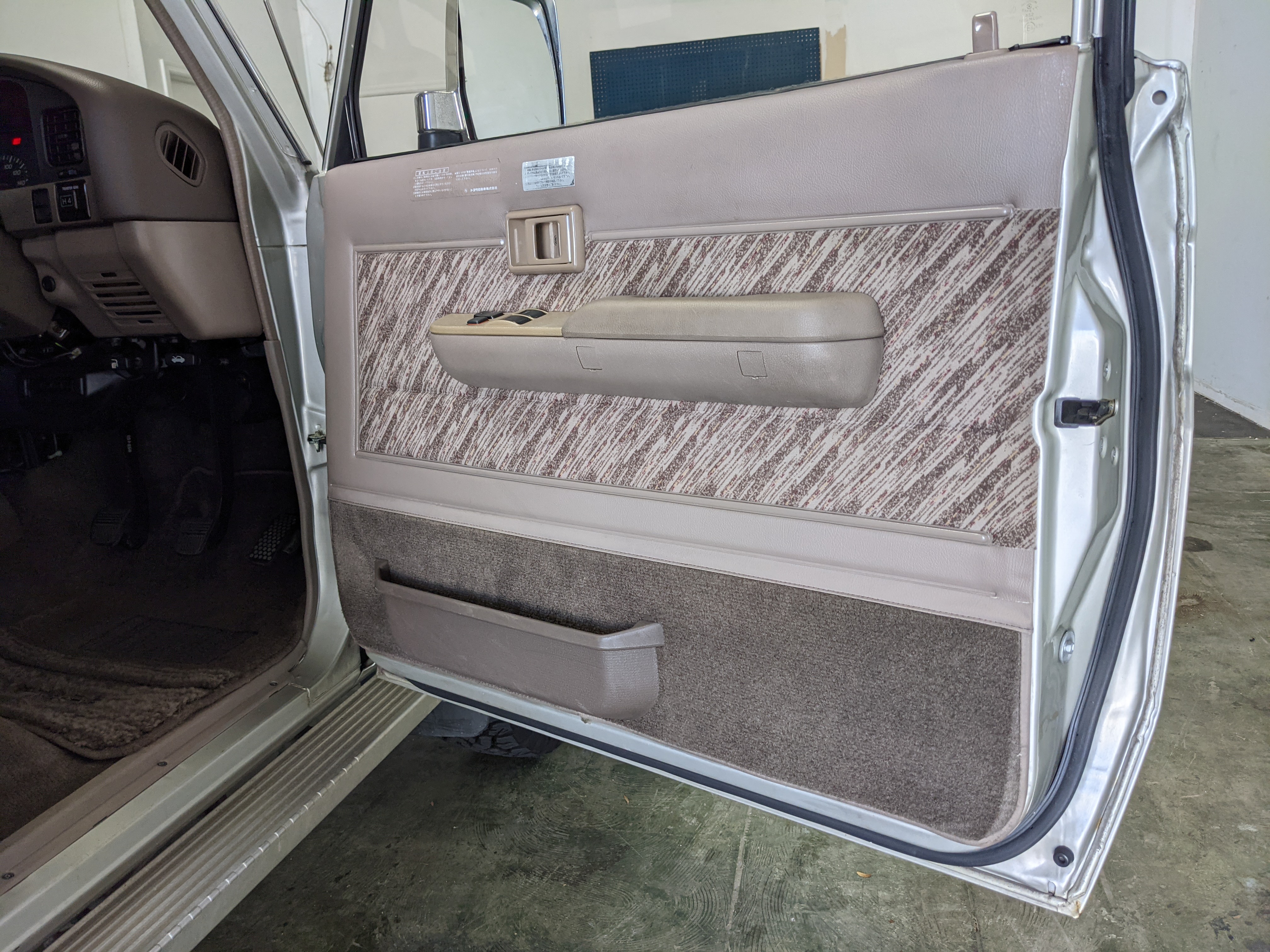 Inside is awash in what Toyota calls ‘sable’, but you or I would call it ‘beige’. That’s not a knock by the way, I find the interior of this Prado excellent to be enveloped in. Seating for 5 is what is listed, but that 5th person better be a small kid or they are going to hate riding with you. Power windows, power locks, 5 speed manual, diff lock switch and push button 4WD with lever-actuated low range. You do have to get out to lock your hubs, but nobody ever has anything bad to say about AISIN hubs. Air conditioning works perfectly, as does heat. Your stereo is a clean and simple Clarion M508, giving you all the musical connectivity you desire without throwing off the interior aesthetic. Speakers themselves have been upgraded at some point in the past and sound quite excellent. Previous owner was a non-smoker as evidenced by the spotless ashtray and cigarette lighter, also the complete lack of burns. Rear seats can fold forward giving you more cargo space when the time arrives.
