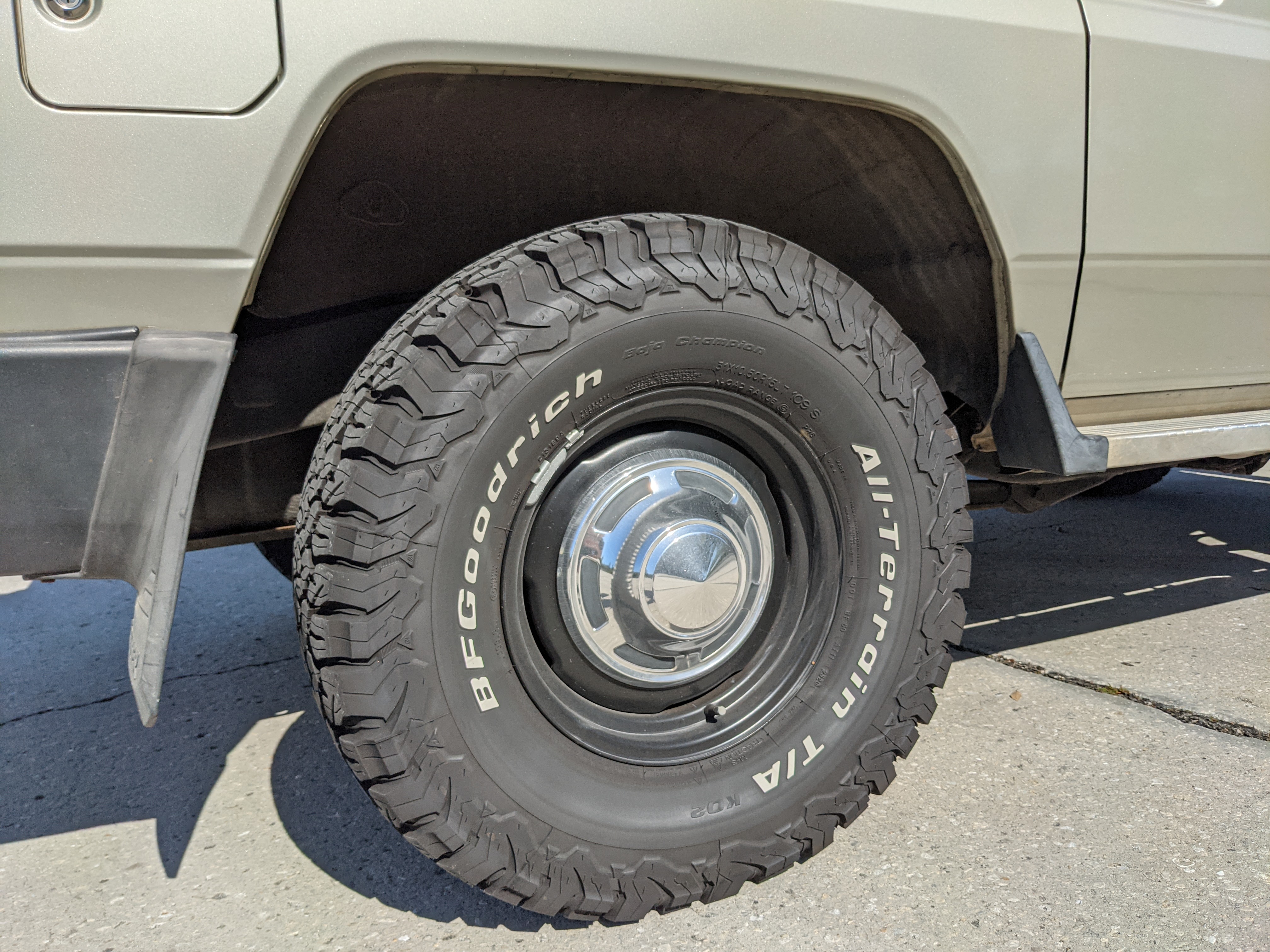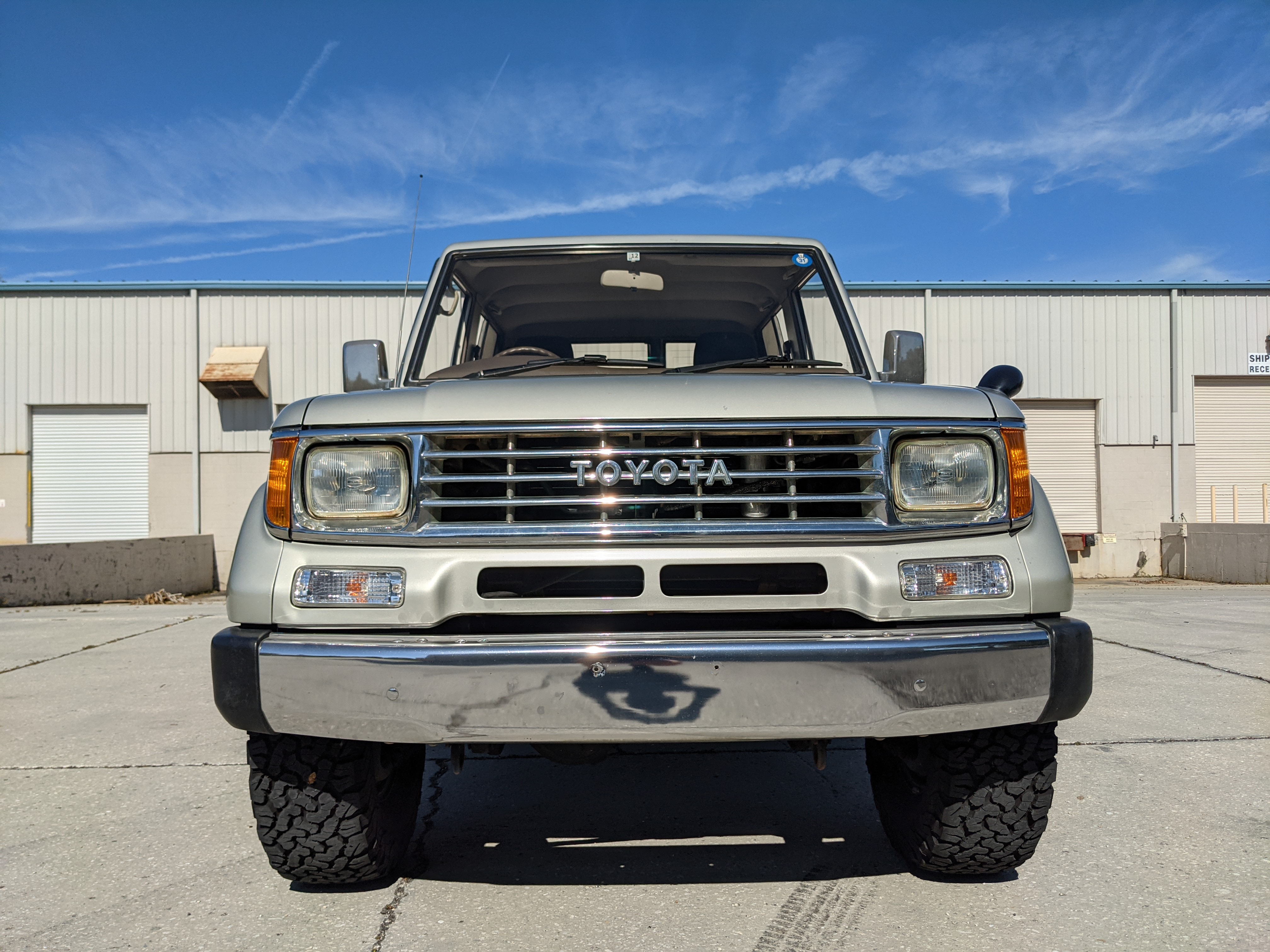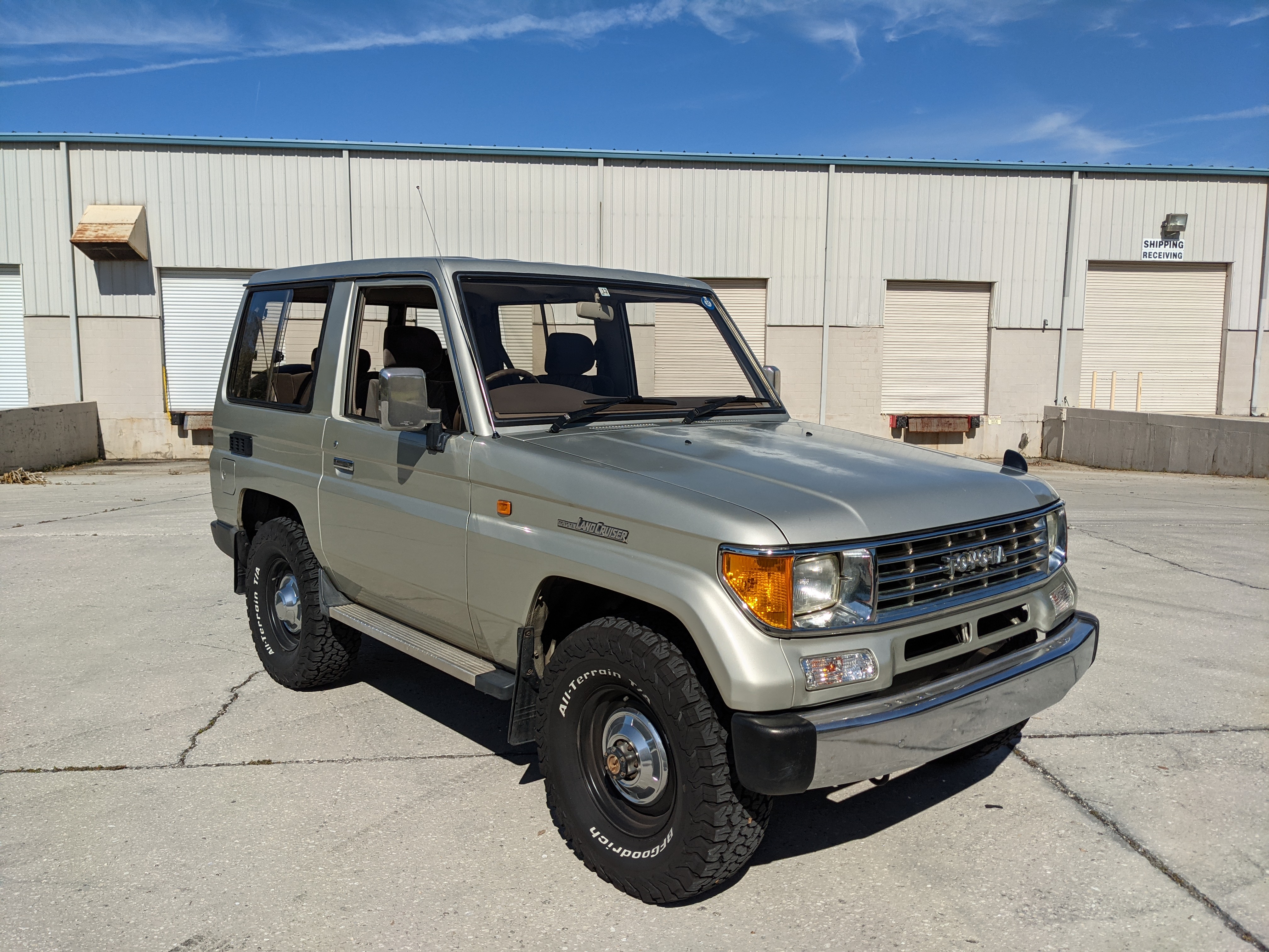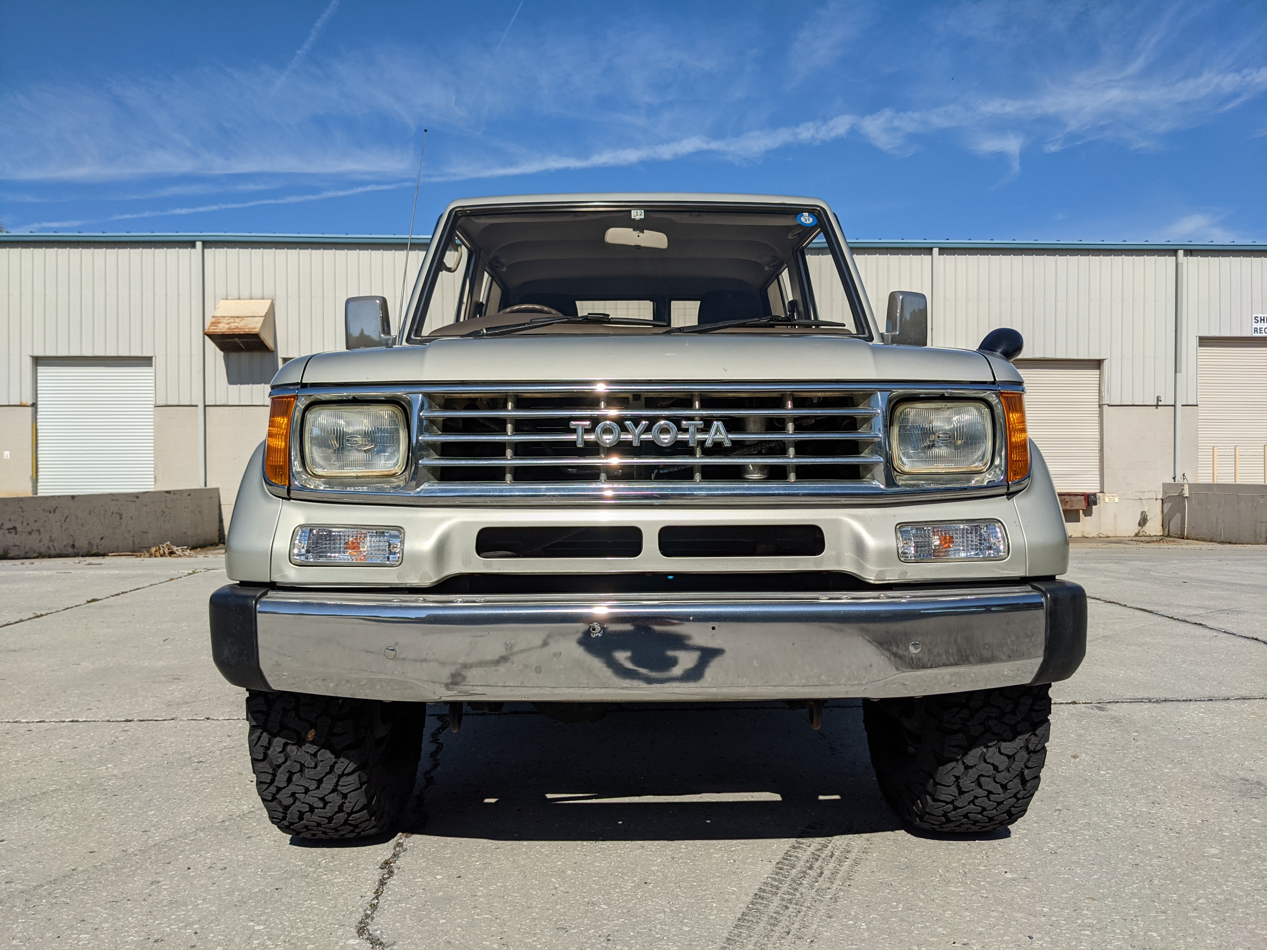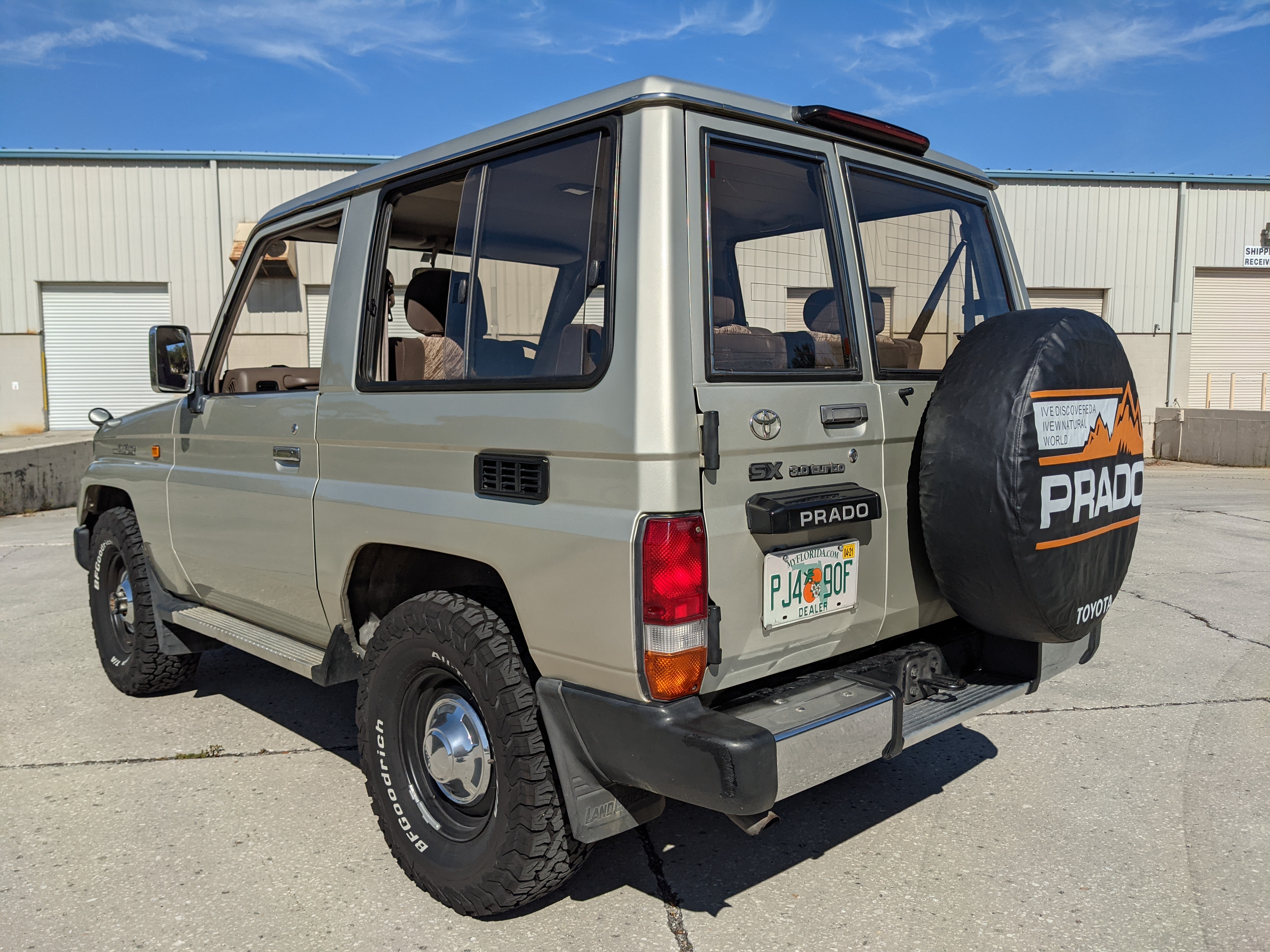 Repeat after me: Turbo diesel 3 liter KZ engine. 5 speed manual transmission. Locking rear differential. Short wheelbase, body-on-frame construction. Solid front and rear axles. Coil sprung suspension. Brand new BF Goodrich K02 tires mounted on old style black steel wheels with dog dish center caps. Two doors. Congratulations, you just described why this particular first-generation Land Cruiser Prado whips.