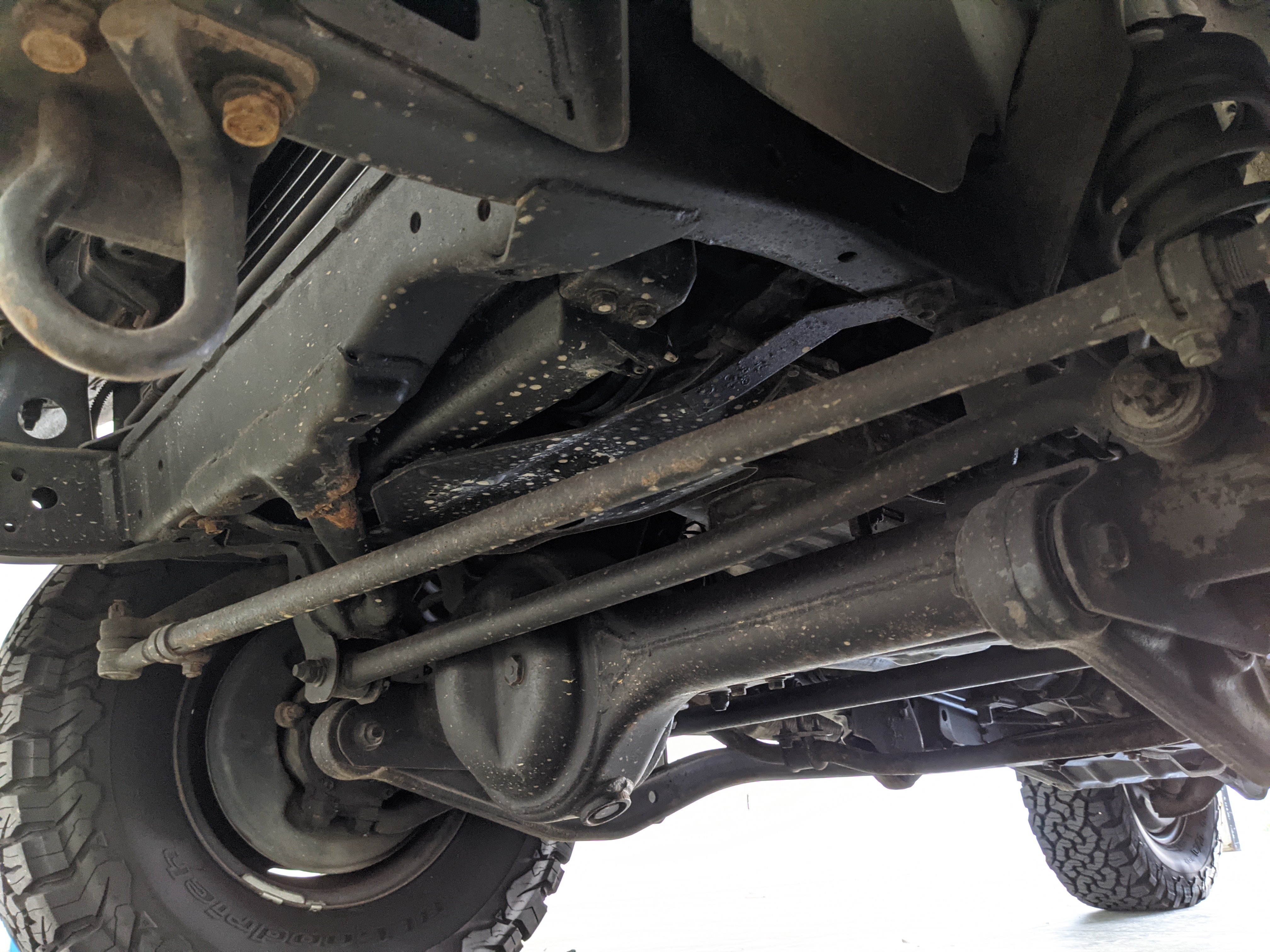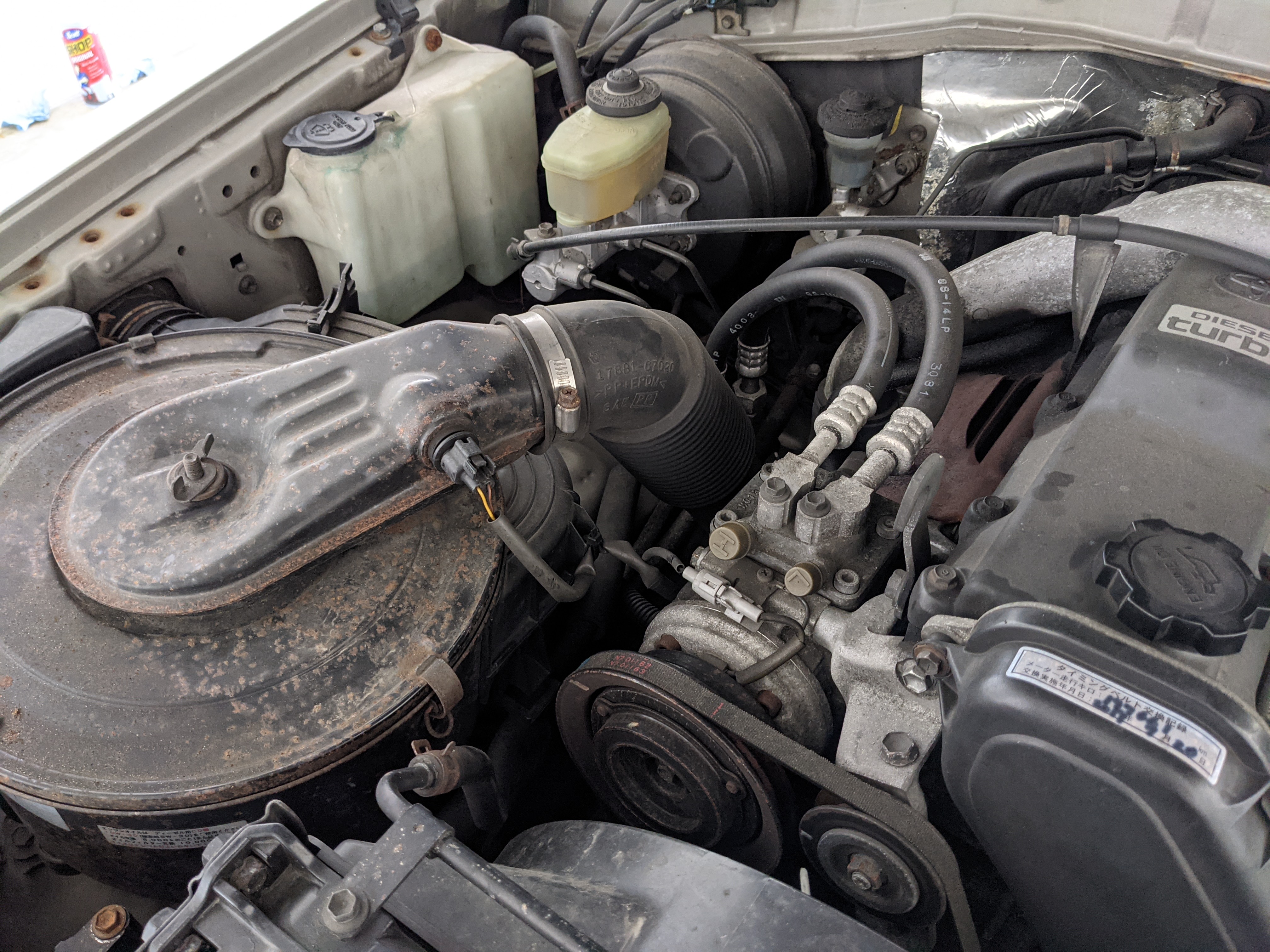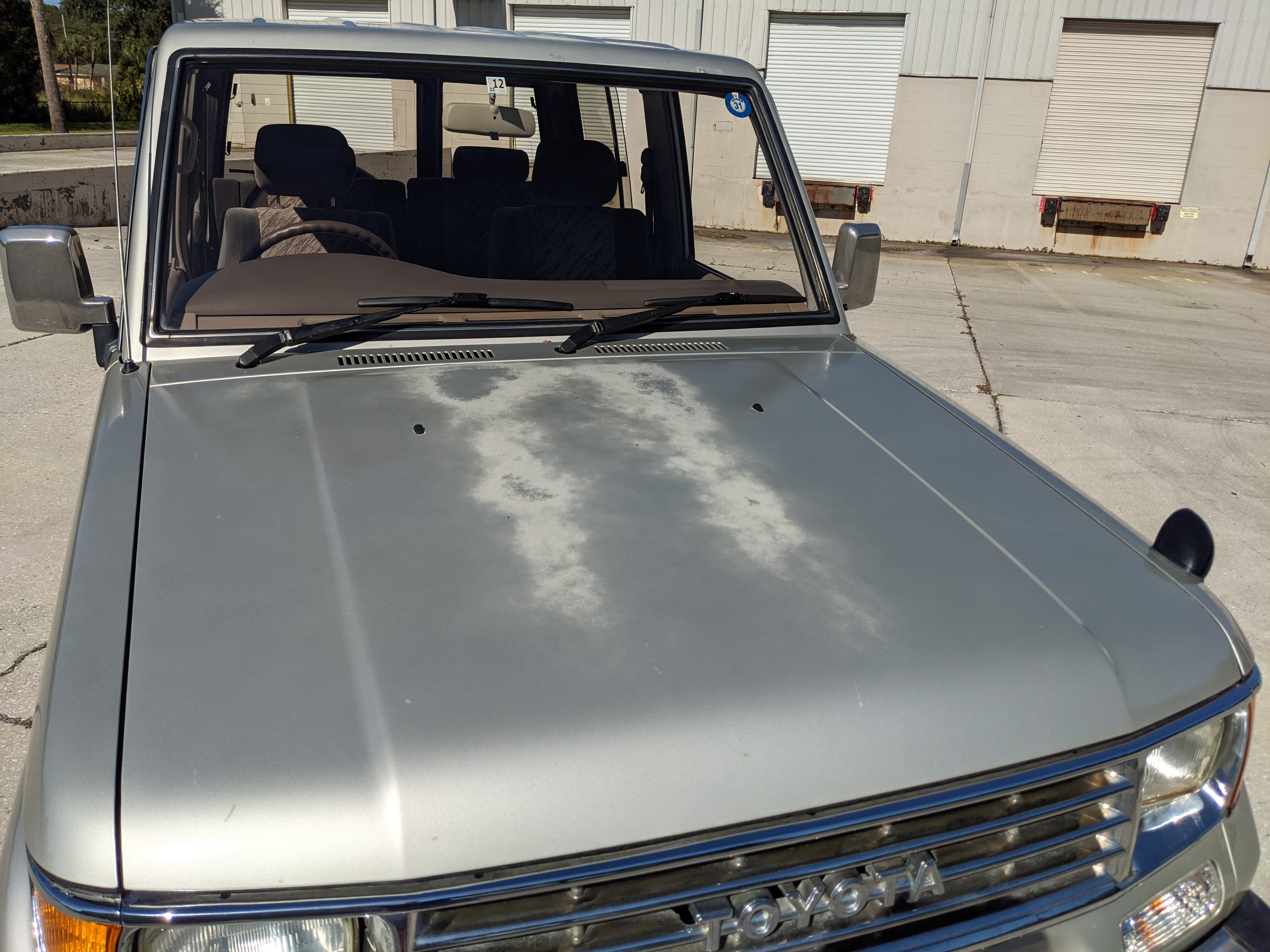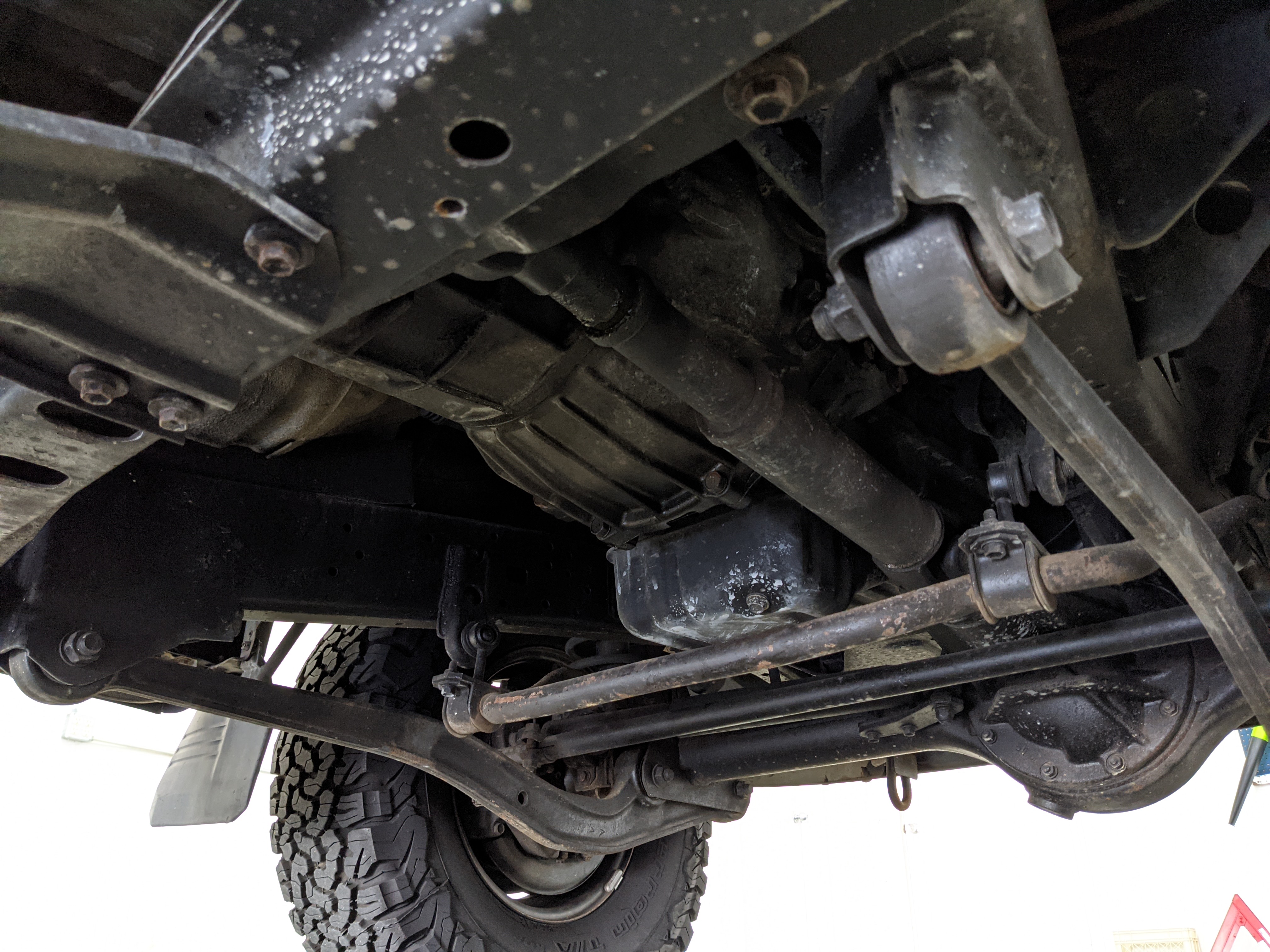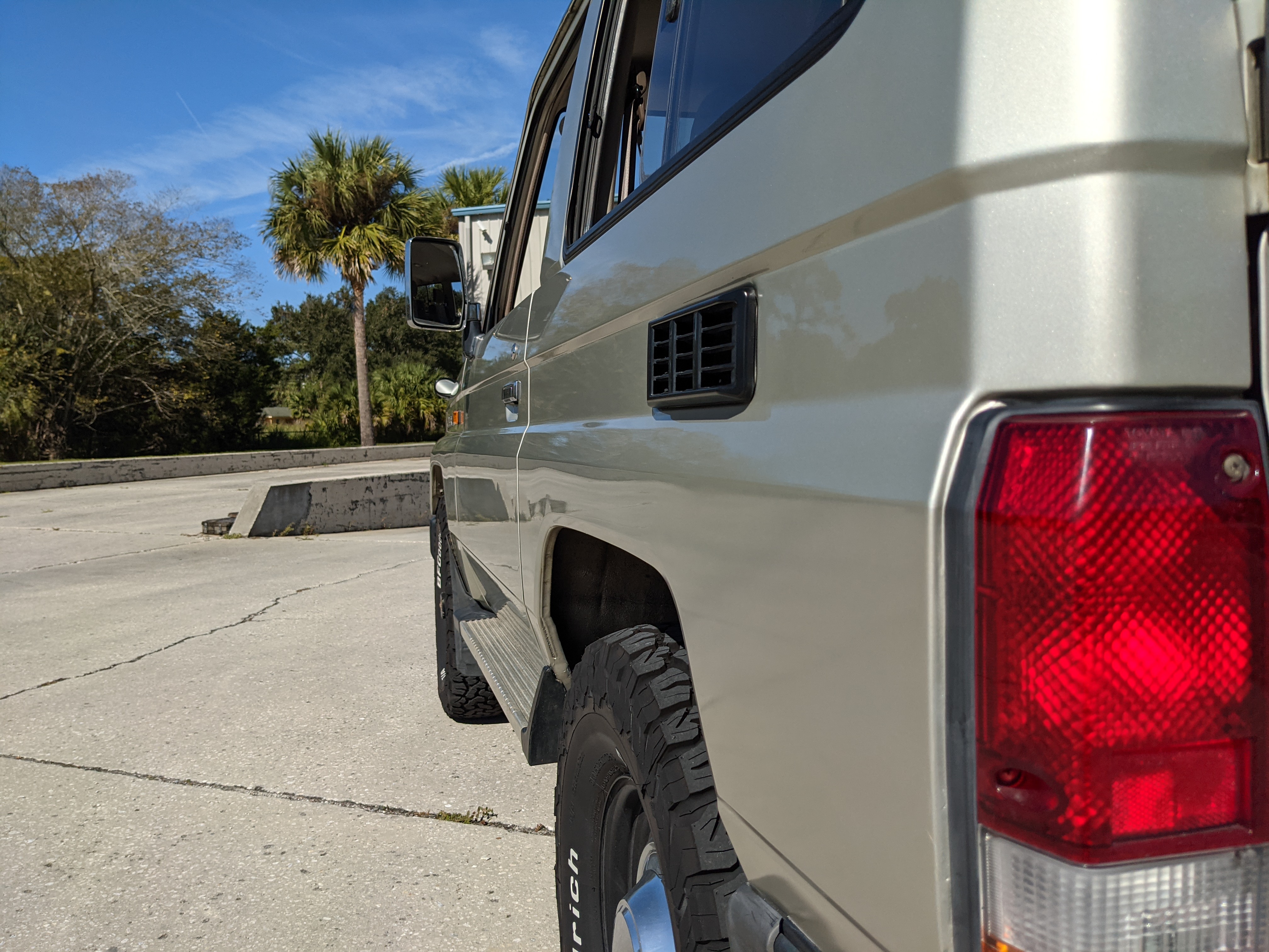 Repeat after me: Turbo diesel 3 liter KZ engine. 5 speed manual transmission. Locking rear differential. Short wheelbase, body-on-frame construction. Solid front and rear axles. Coil sprung suspension. Brand new BF Goodrich K02 tires mounted on old style black steel wheels with dog dish center caps. Two doors. Congratulations, you just described why this particular first-generation Land Cruiser Prado whips.