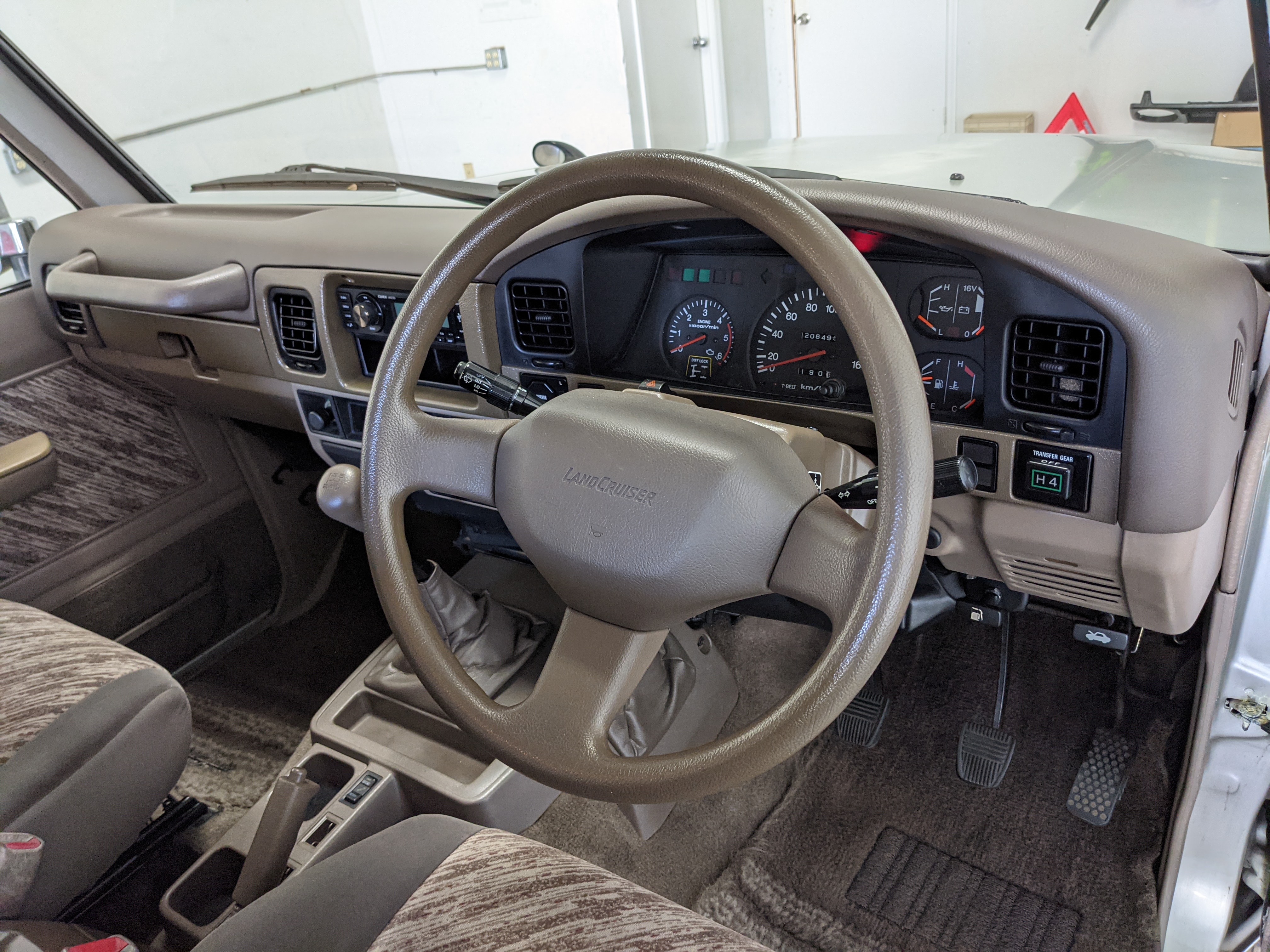 Gold n’ bold over the narrow body variant, this Prado has a classic look about it. A clean, trim profile with no extraneous details. The short wheelbase gives it unrivaled maneuverability be it in a bog somewhere or the parking lot of Costco. You may note the unforgivable set of spelling and grammar mistakes on the spare tire cover. Just nod sagely, know it in your heart that it’s a part of the charm and focus instead on the giant letters spelling out “PRADO”. The already-mentioned black steel wheels set inside new K02s adorned with the chrome center caps contribute to making this a drop-dead gorgeous truck. Everyone recognizes and appreciates a Land Cruiser, even if they don’t notice you’re sitting on the other side of a Land Cruiser they are probably seeing for the very first time.