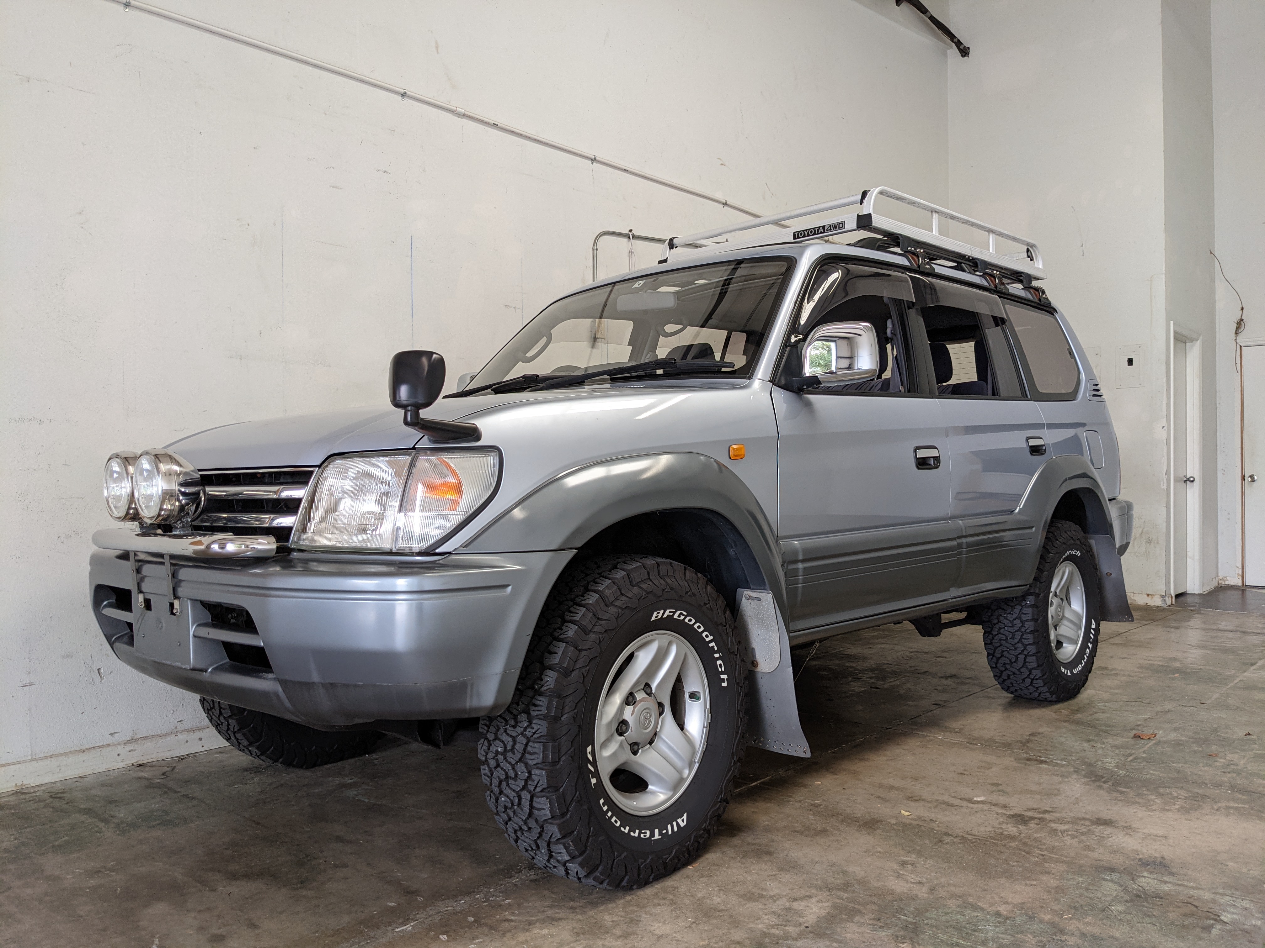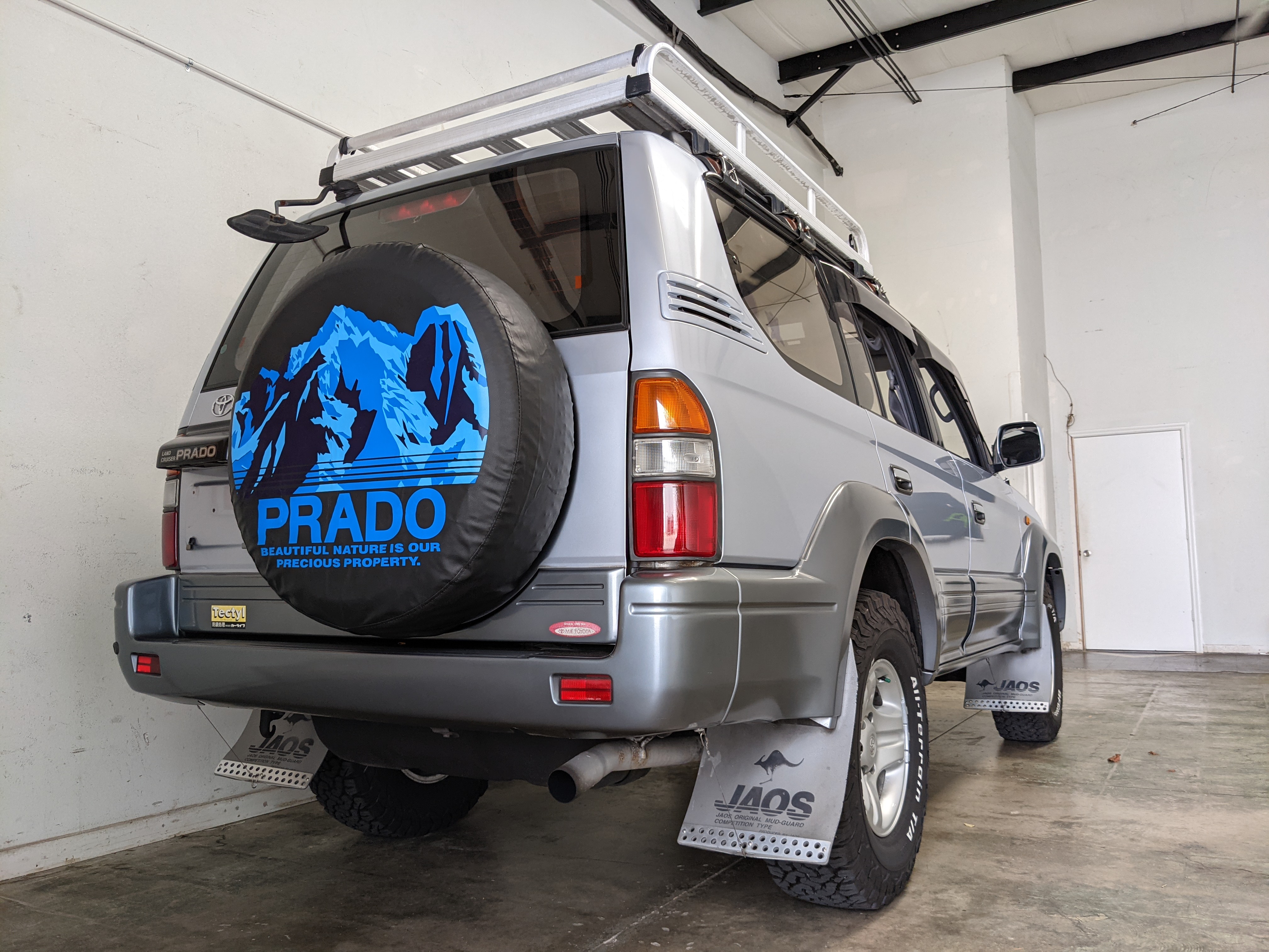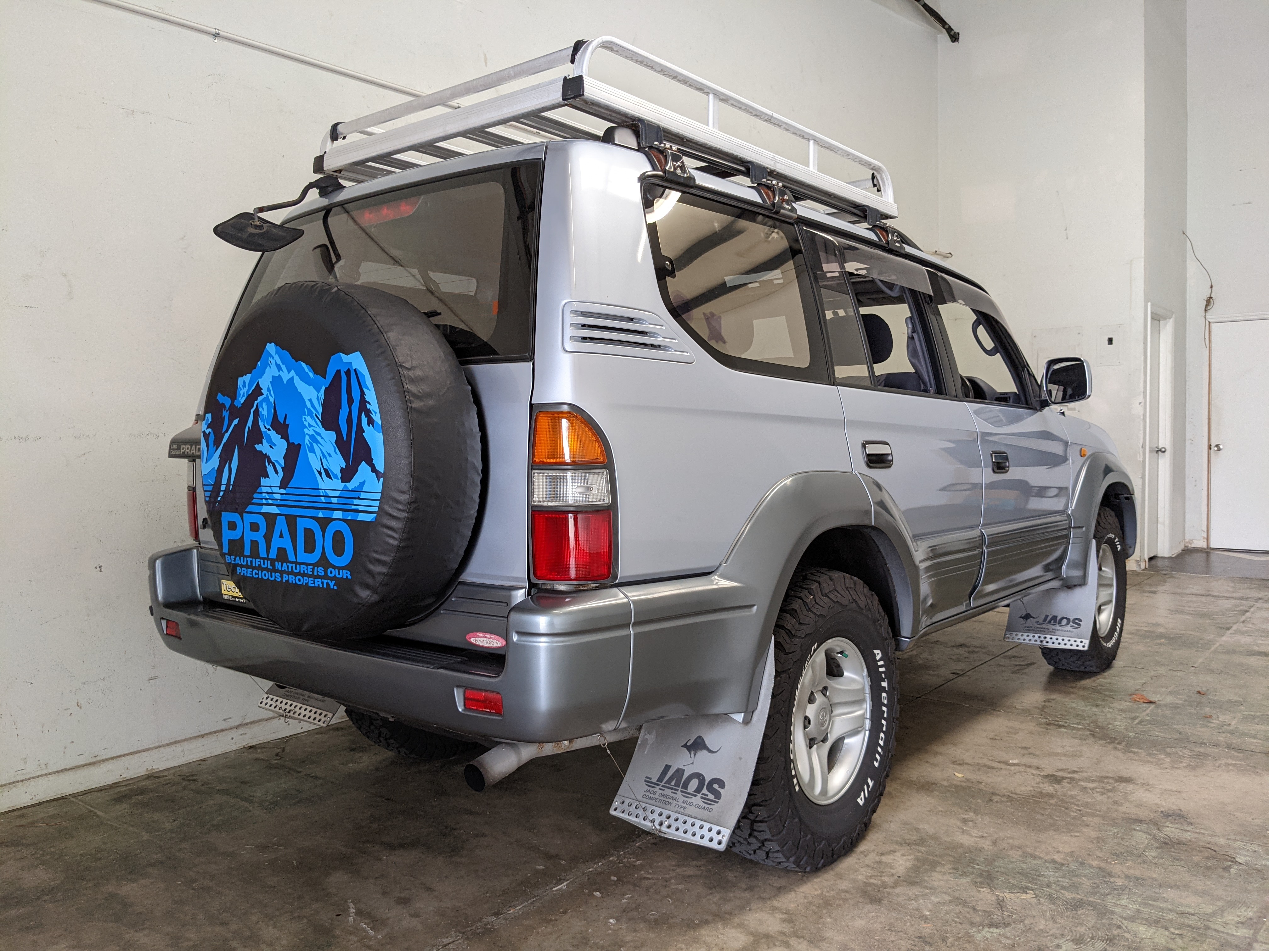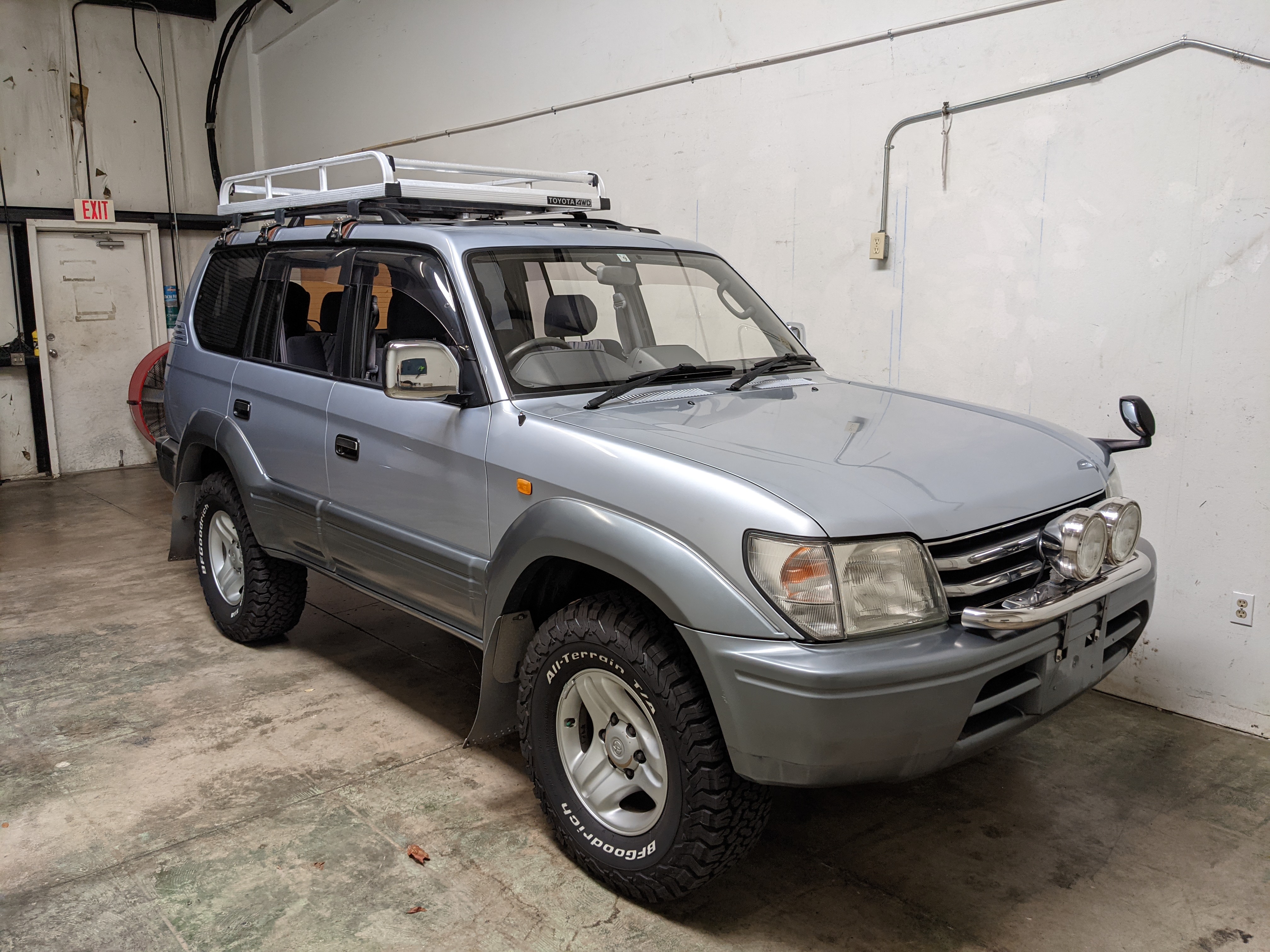 Bluish silver paint with darker lower panels set up a very 90s look right off the bat. This truck has a tall, athletic stance with excellent ground clearance. Very JDM rain guards over every window, front-mounted fog lights attached to an inboard bullbar with the corner-mounted mirror bleed even more distinctive vibes. Radical Toyota-original 3 spoke wheels wrapped in BF Goodrich KO2s white letters out complete the look. Top it off with a massive OEM Toyota aluminum rack and you have yourself a fantastically capable, excellent daily driver. As an added bonus (especially for 1996) you get a proximity sensor on your rear left bumper that beeps to let you know when you are about to hit something.