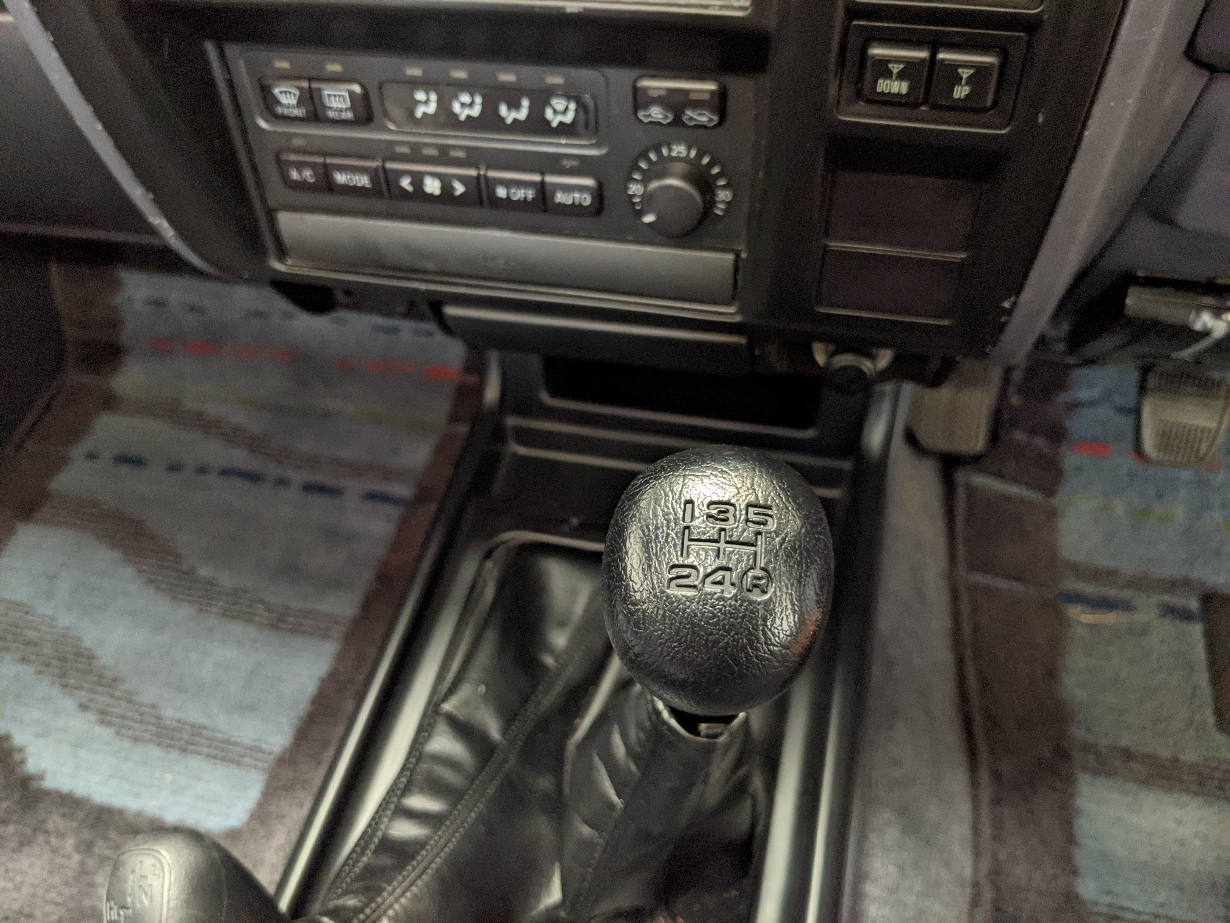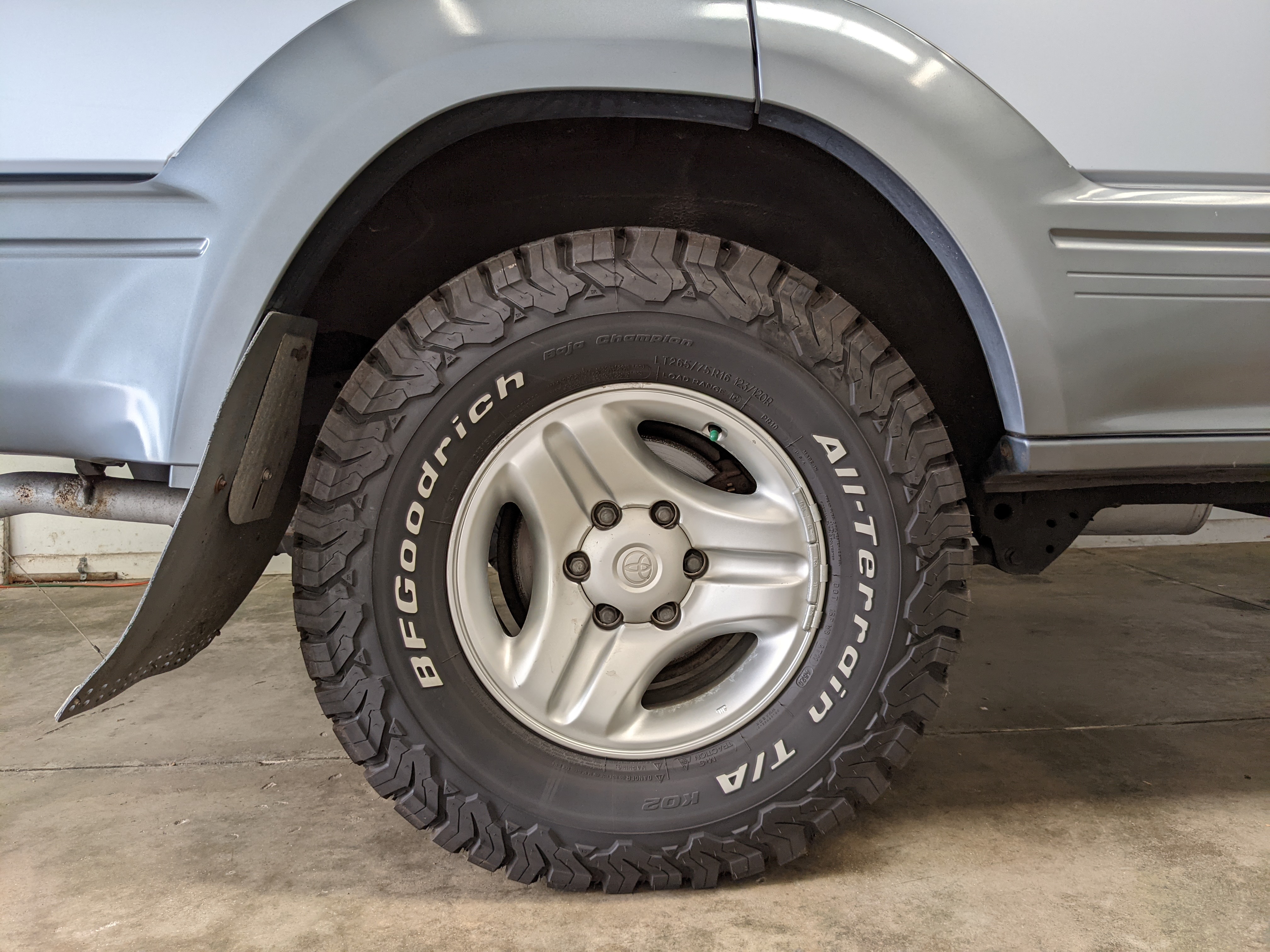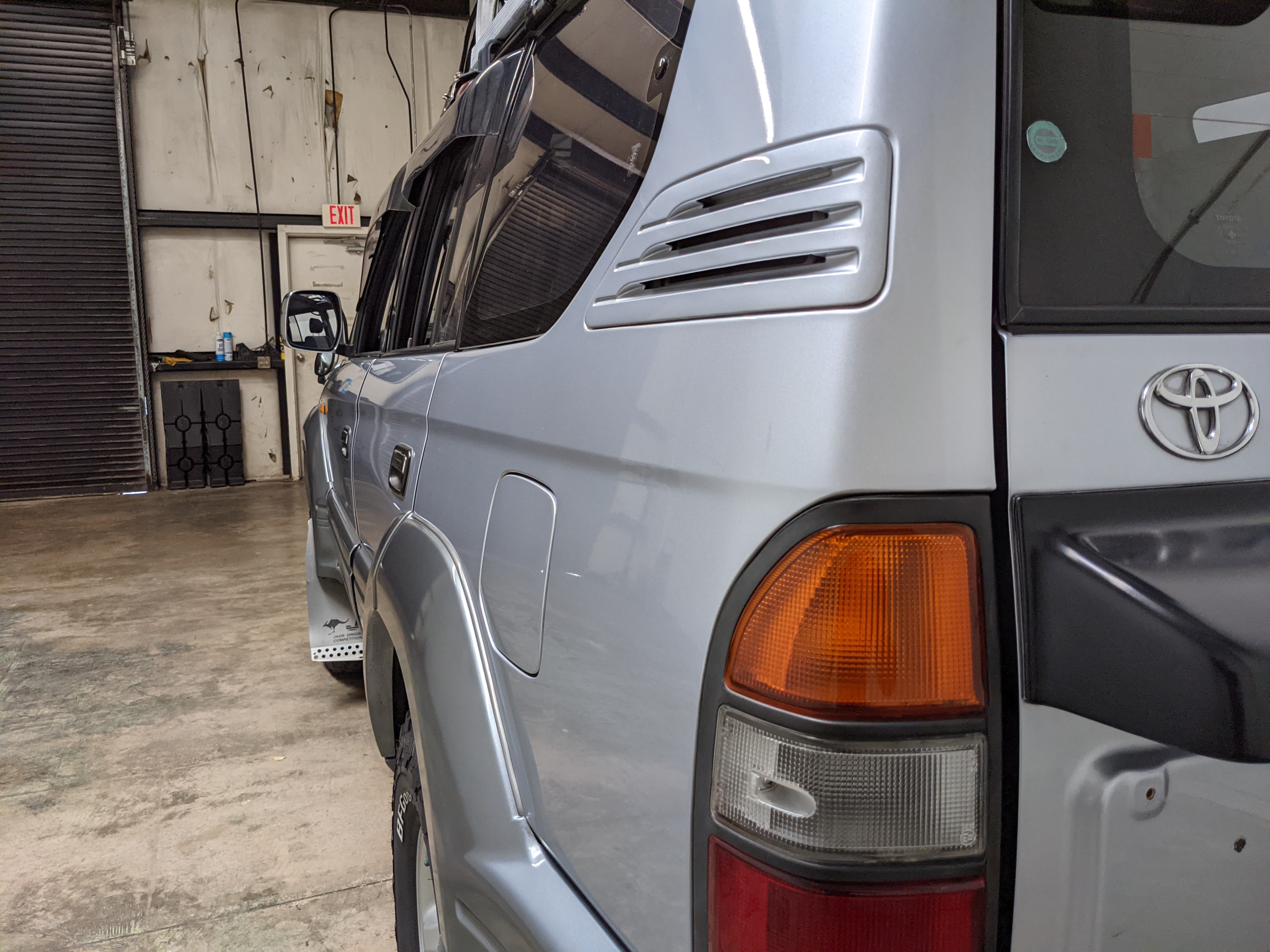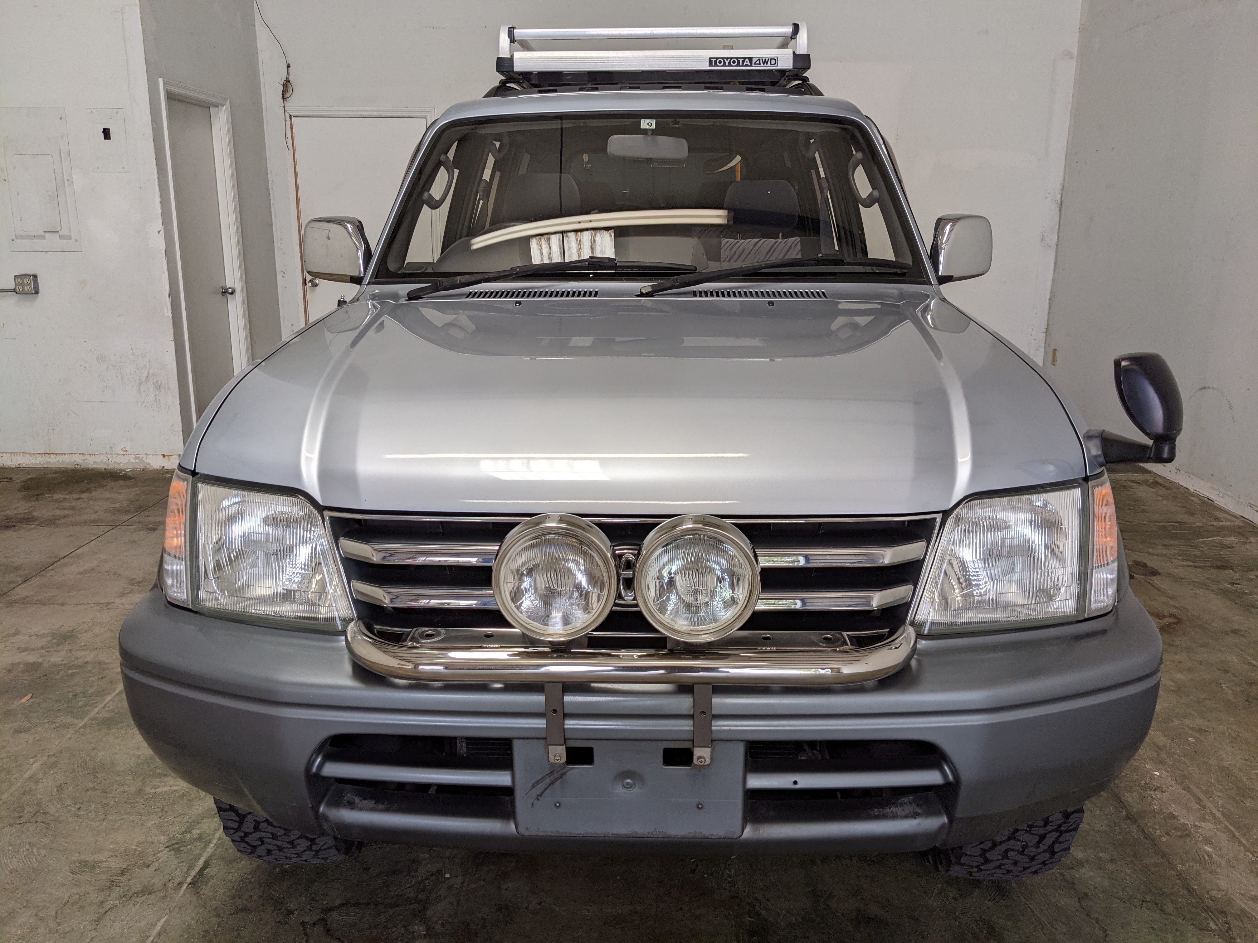 Bluish silver paint with darker lower panels set up a very 90s look right off the bat. This truck has a tall, athletic stance with excellent ground clearance. Very JDM rain guards over every window, front-mounted fog lights attached to an inboard bullbar with the corner-mounted mirror bleed even more distinctive vibes. Radical Toyota-original 3 spoke wheels wrapped in BF Goodrich KO2s white letters out complete the look. Top it off with a massive OEM Toyota aluminum rack and you have yourself a fantastically capable, excellent daily driver. As an added bonus (especially for 1996) you get a proximity sensor on your rear left bumper that beeps to let you know when you are about to hit something.
