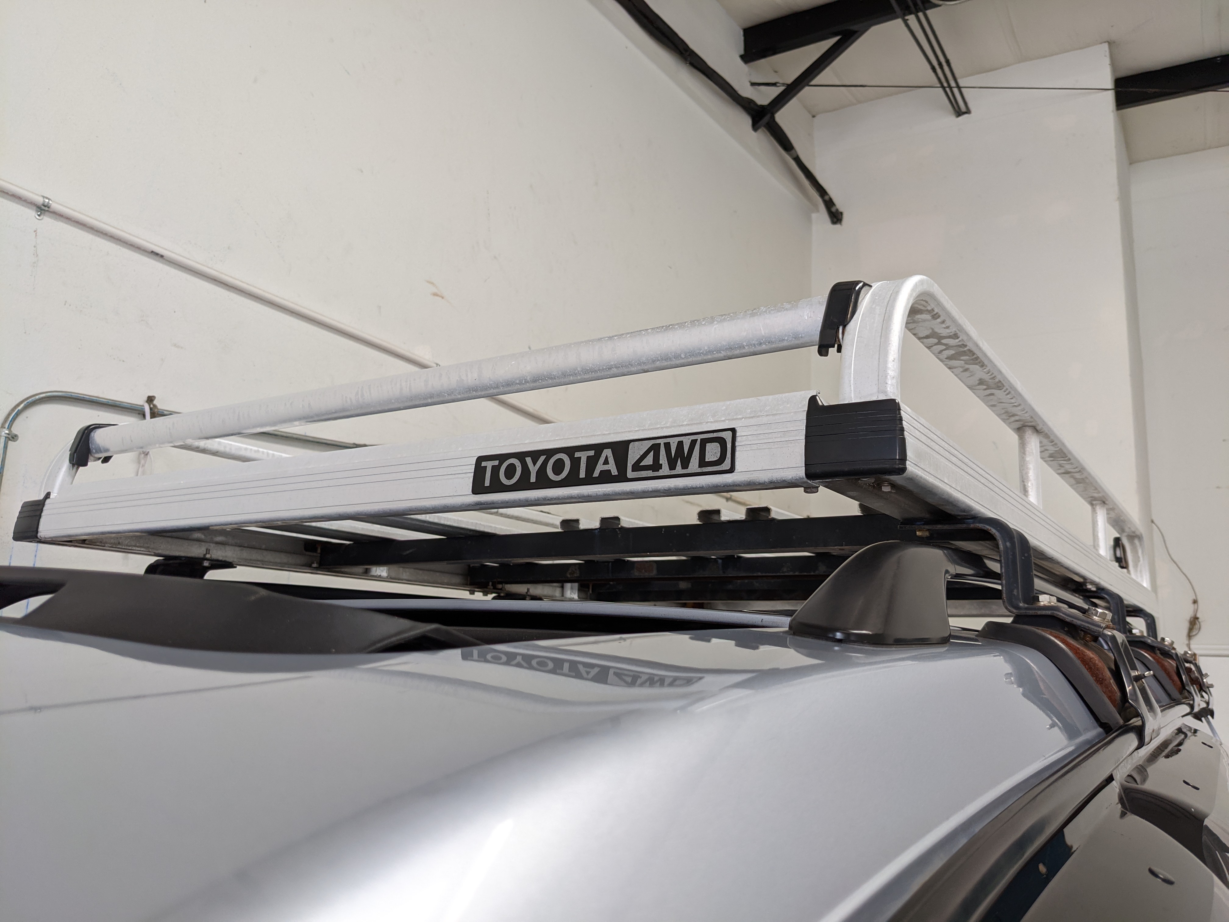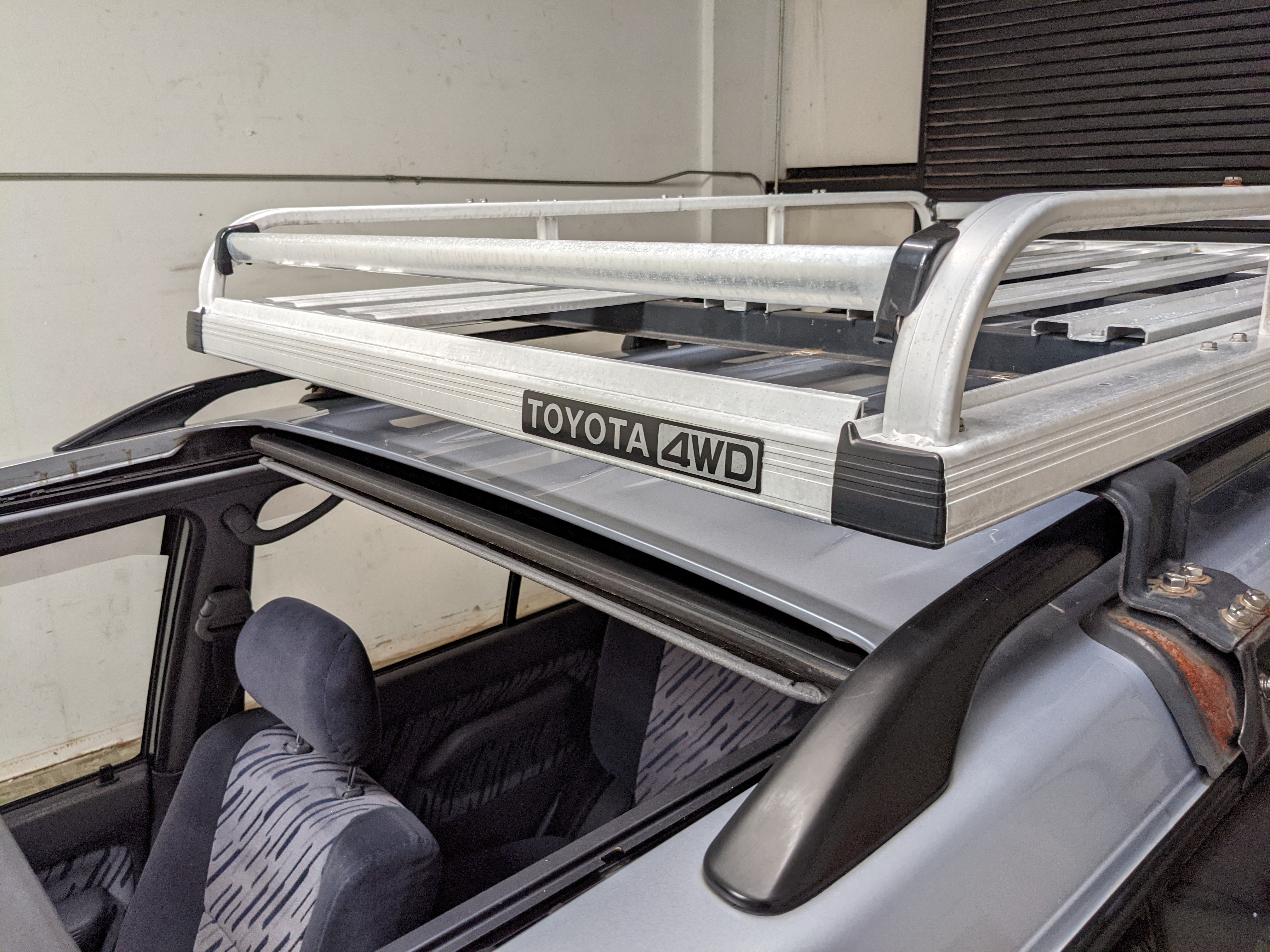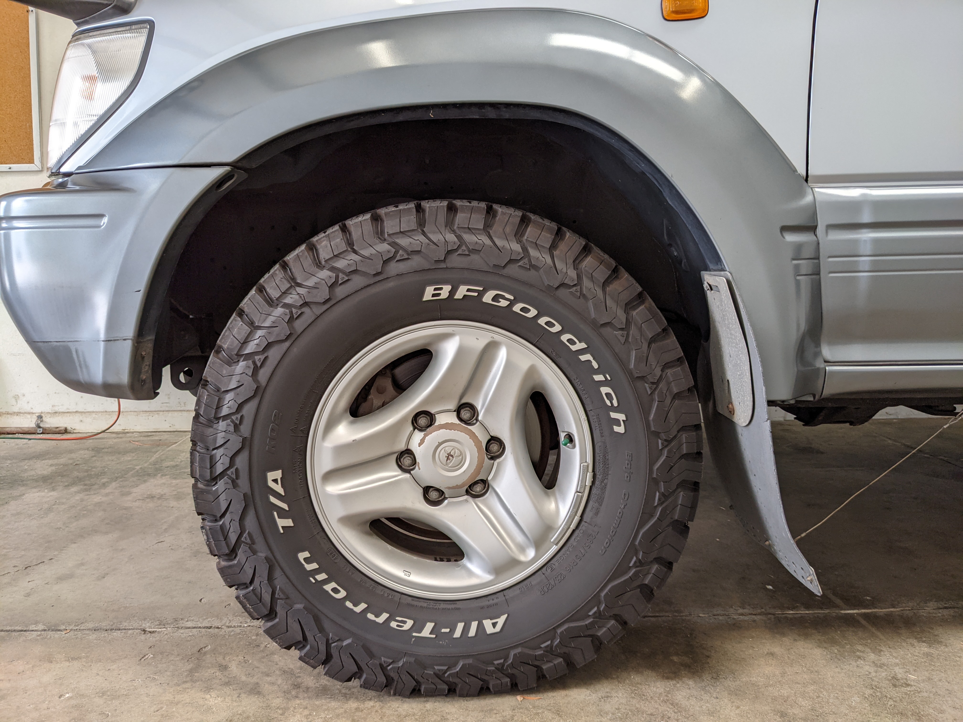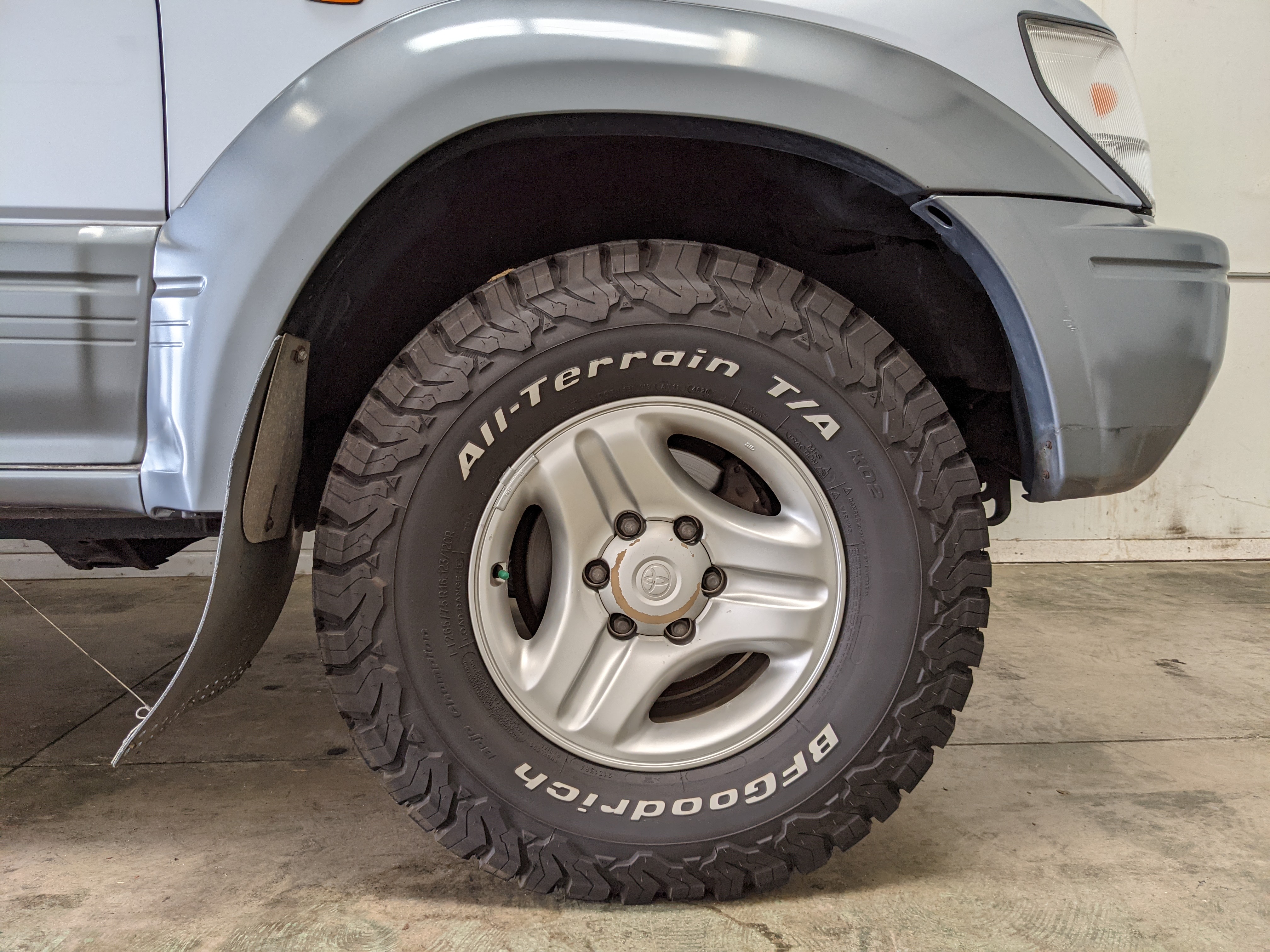Bluish silver paint with darker lower panels set up a very 90s look right off the bat. This truck has a tall, athletic stance with excellent ground clearance. Very JDM rain guards over every window, front-mounted fog lights attached to an inboard bullbar with the corner-mounted mirror bleed even more distinctive vibes. Radical Toyota-original 3 spoke wheels wrapped in BF Goodrich KO2s white letters out complete the look. Top it off with a massive OEM Toyota aluminum rack and you have yourself a fantastically capable, excellent daily driver. As an added bonus (especially for 1996) you get a proximity sensor on your rear left bumper that beeps to let you know when you are about to hit something.