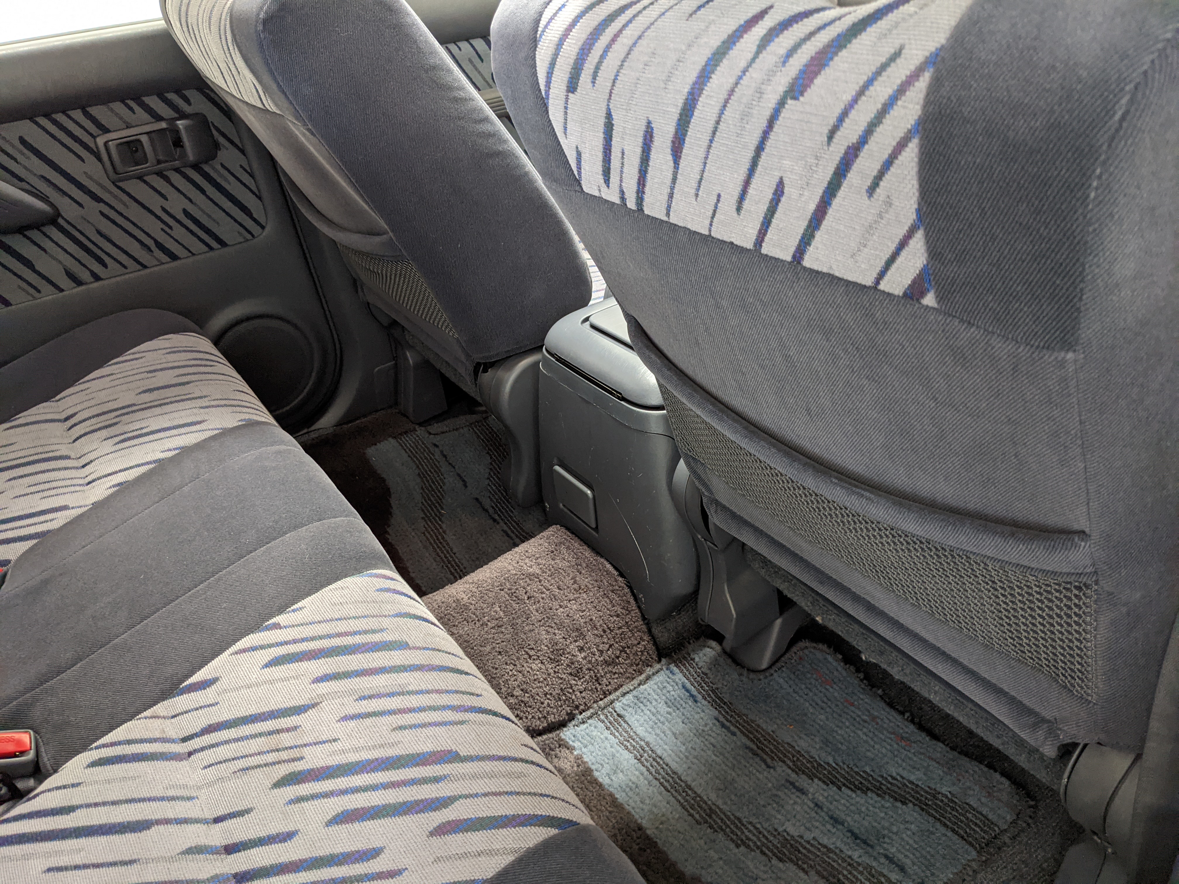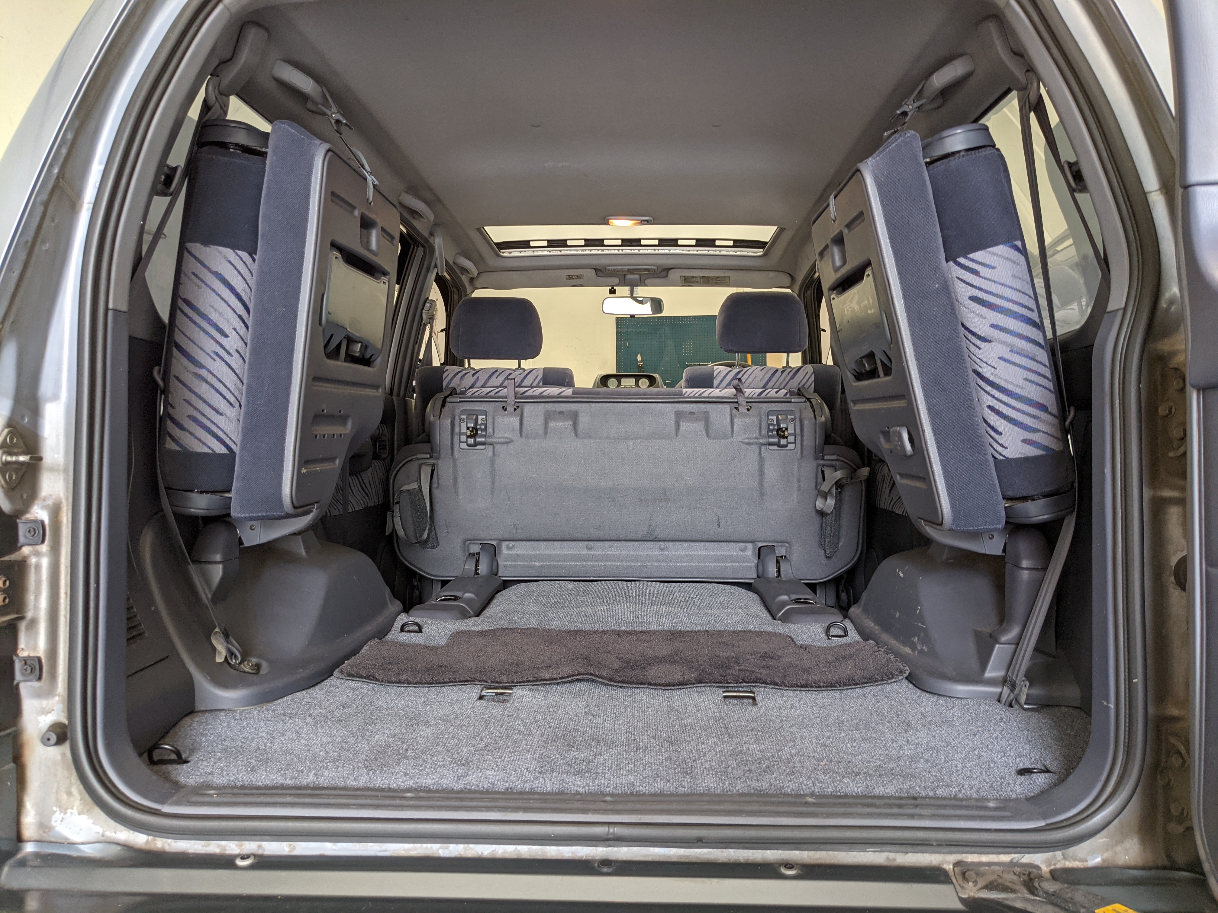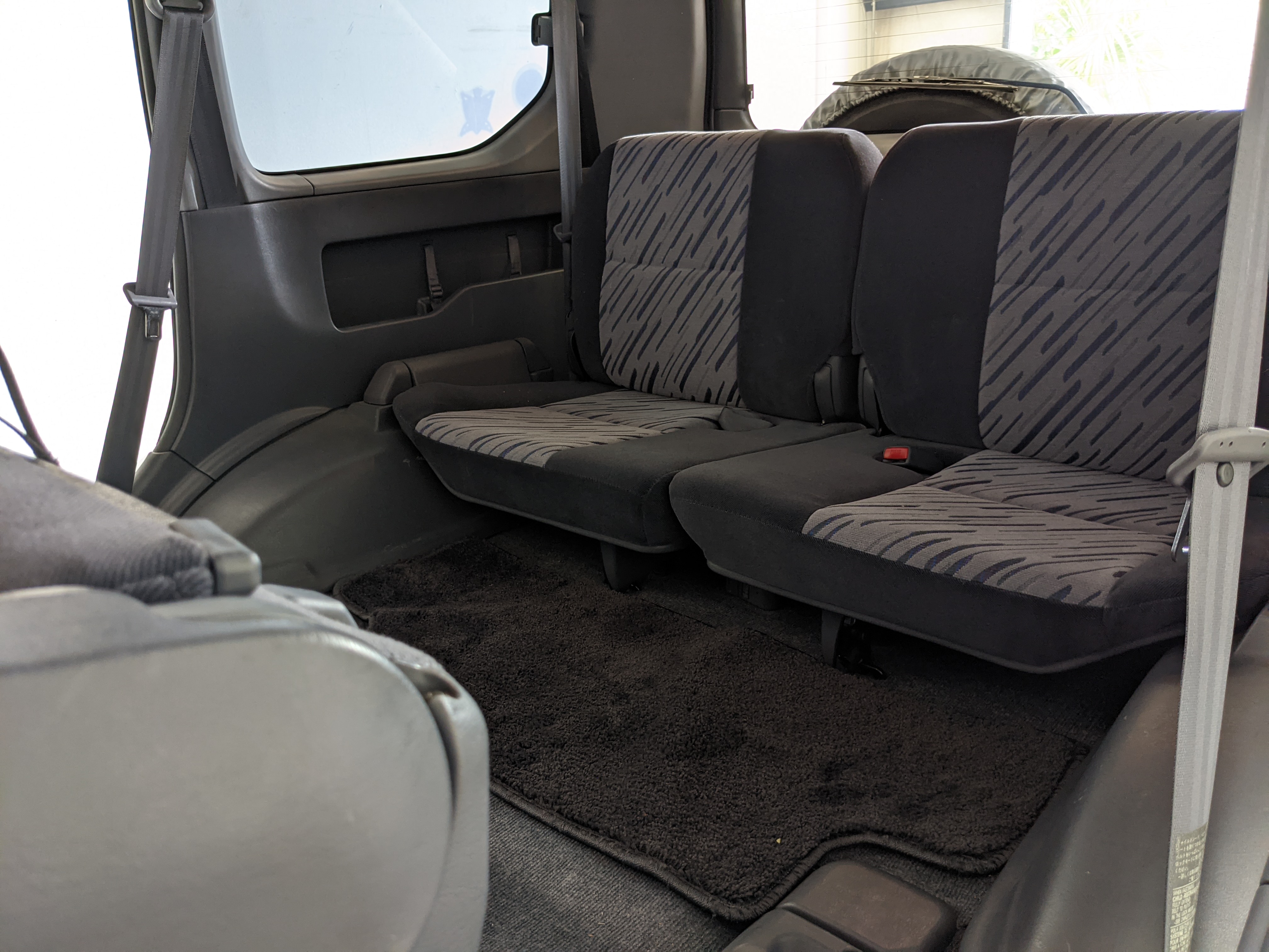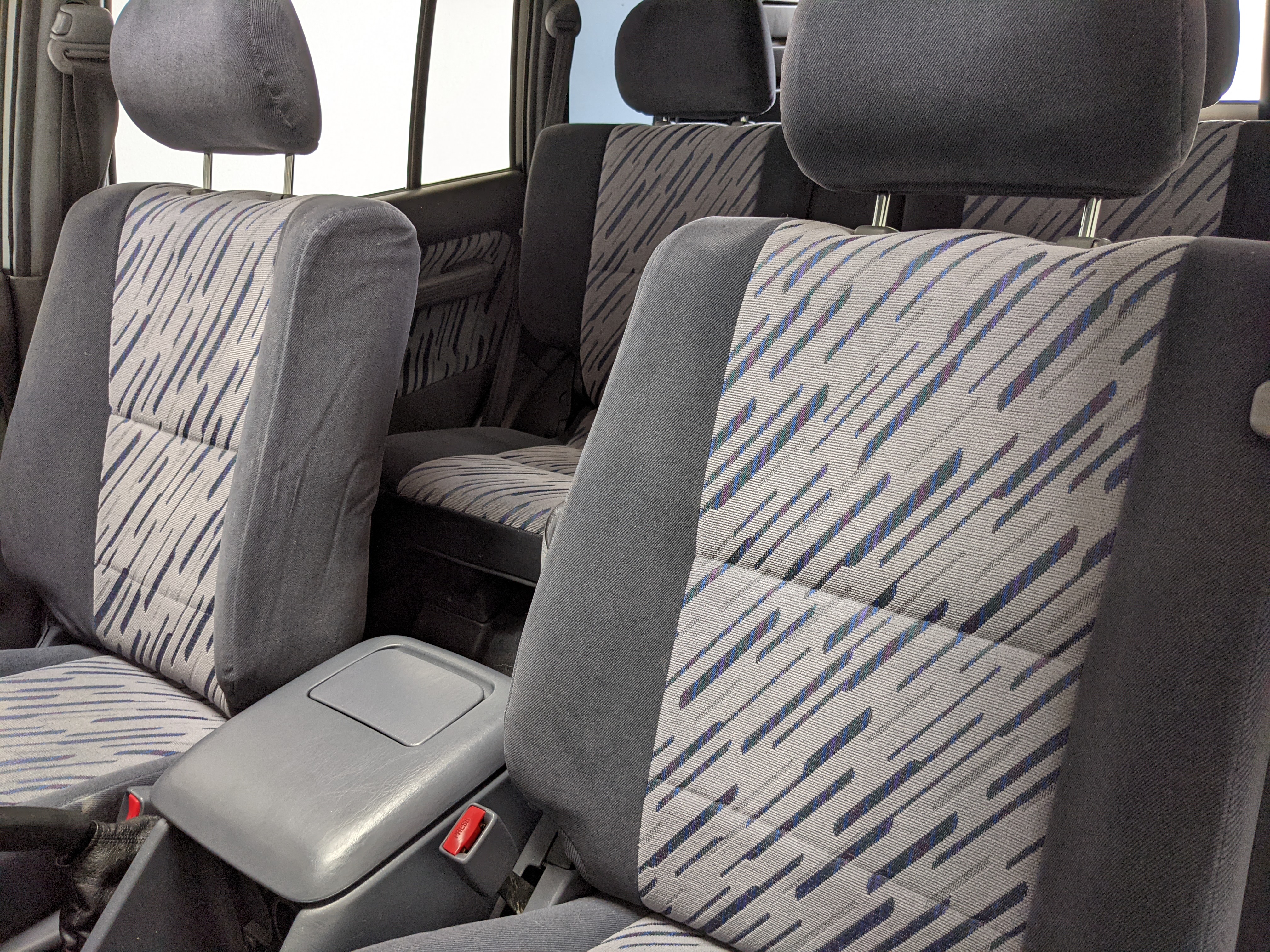 Blue, green and purple splashes of color dot the door panels and seats. As such, the seats themselves are comfortable fabric affairs, with great bolstering. Standard instrument cluster up front, amazing visibility all around and a functioning sunroof above your head. Above the center stack is the ‘Field Monitor’, a sort of digital information pod that includes an inclinometer, pitch/roll indicator and a digital compass. In addition it can display temperature, elevation, barometric pressure, digital speedometer (in kilometers of course) and a timer. Below this is arguably the star of the show, a 5 speed manual transmission along with a low-range selector. The stereo is missing, thankfully the wiring harness is uncut so is ready to have any USDM double-din unit you’d like installed. Automatic climate control and a little drawer, along with an analog clock are here as well. You also get dual front airbags and ABS which is a far cry from the “not at all” available in the last generation. Center console can swallow all sorts of things under its lid, including four drinks in its various cupholders. Backseats are clean and comfortable, with a smaller set of third row seats in the very back. The cargo area is large on its own but can be made significantly larger if you fold the rear seats forward.