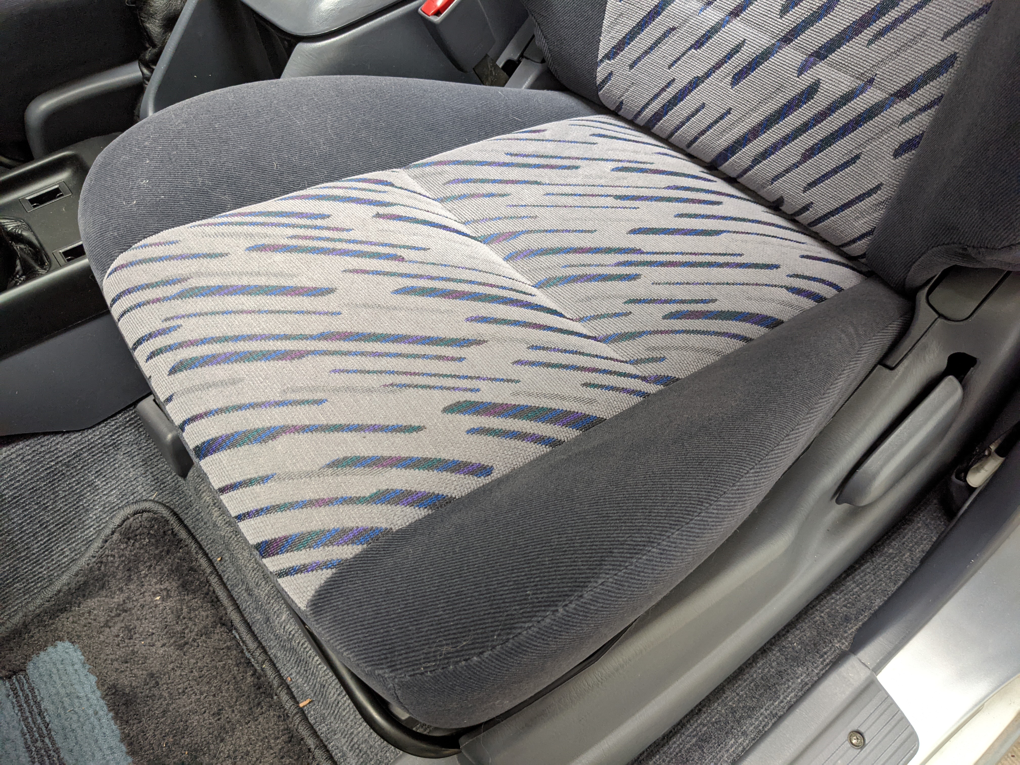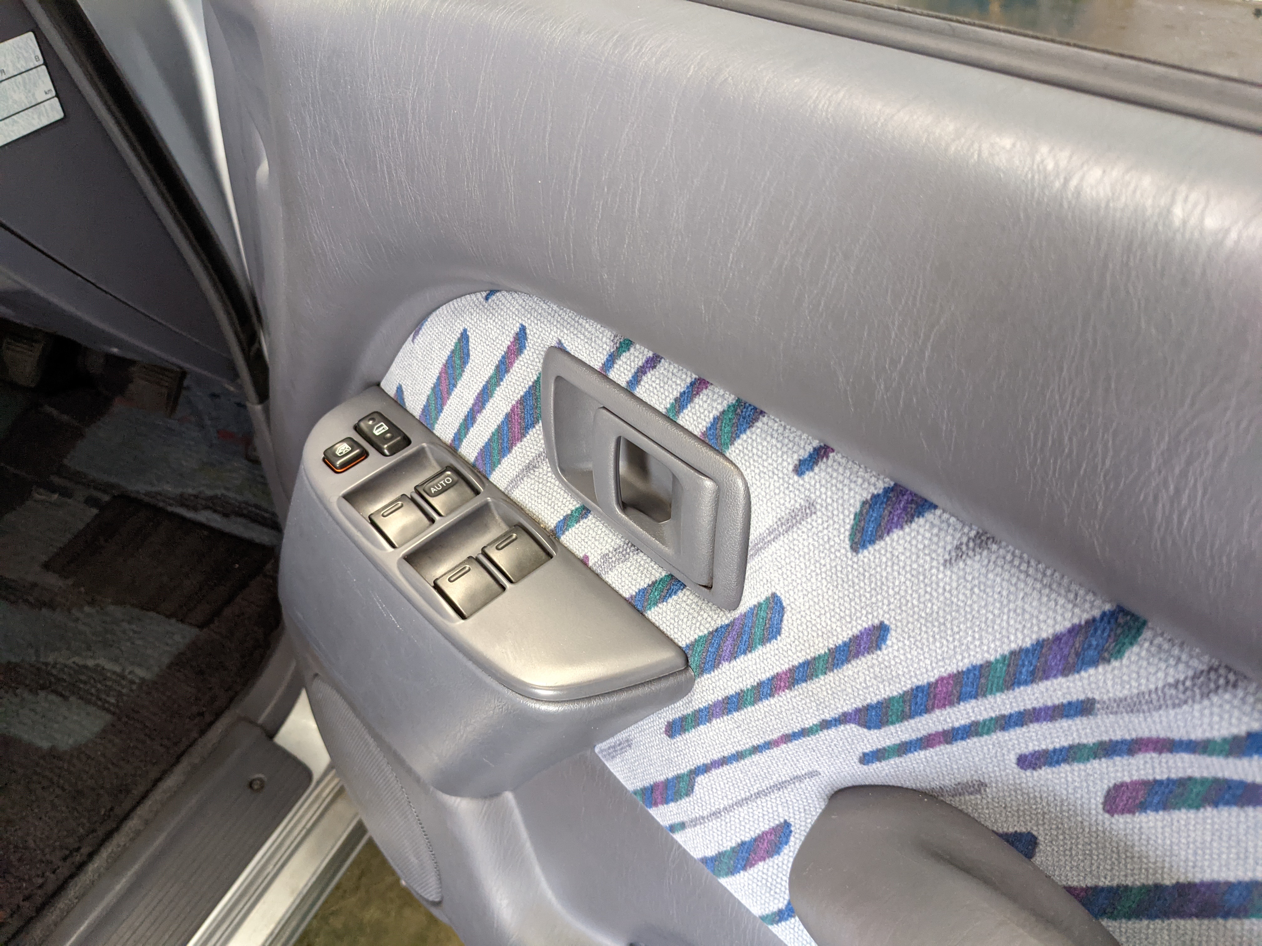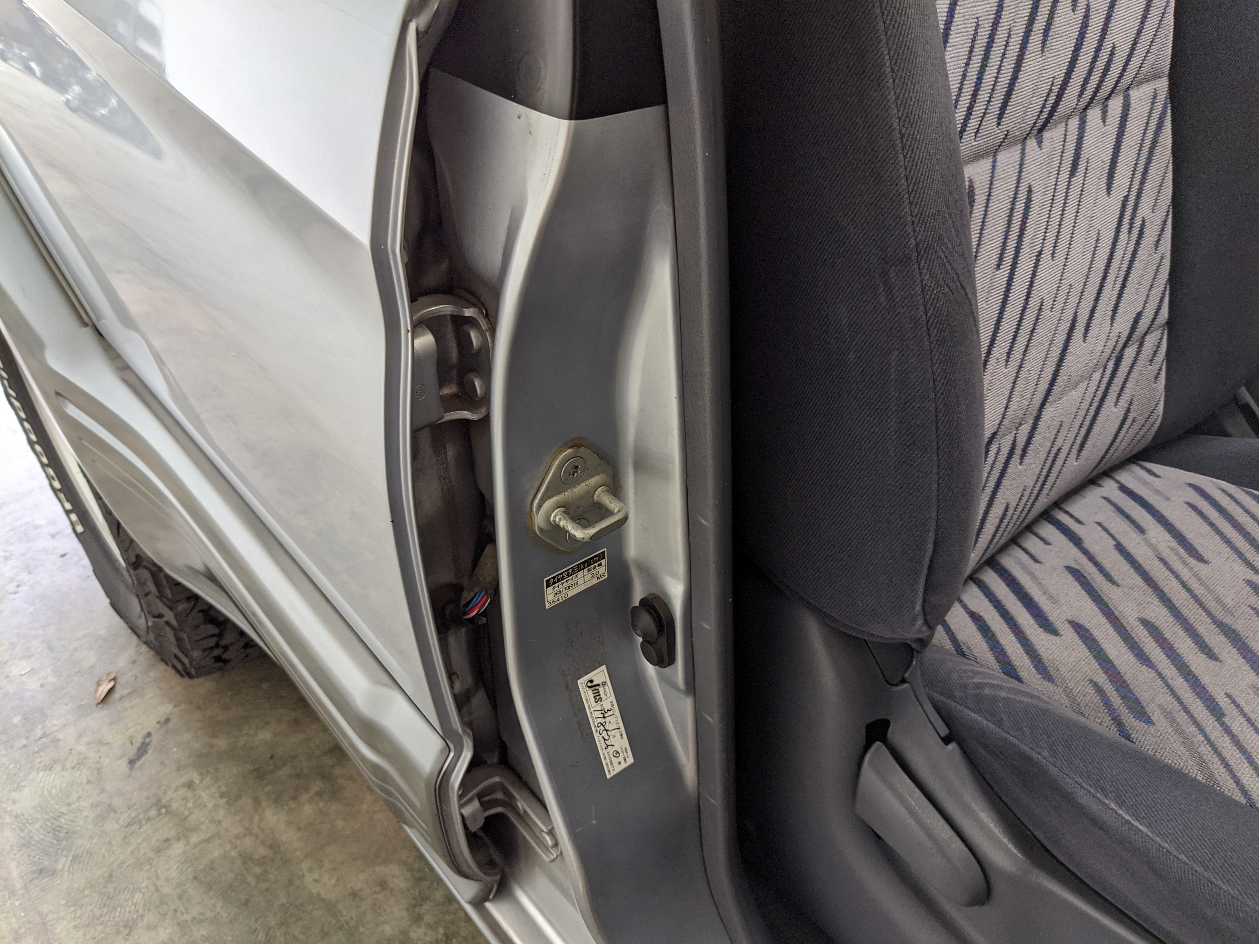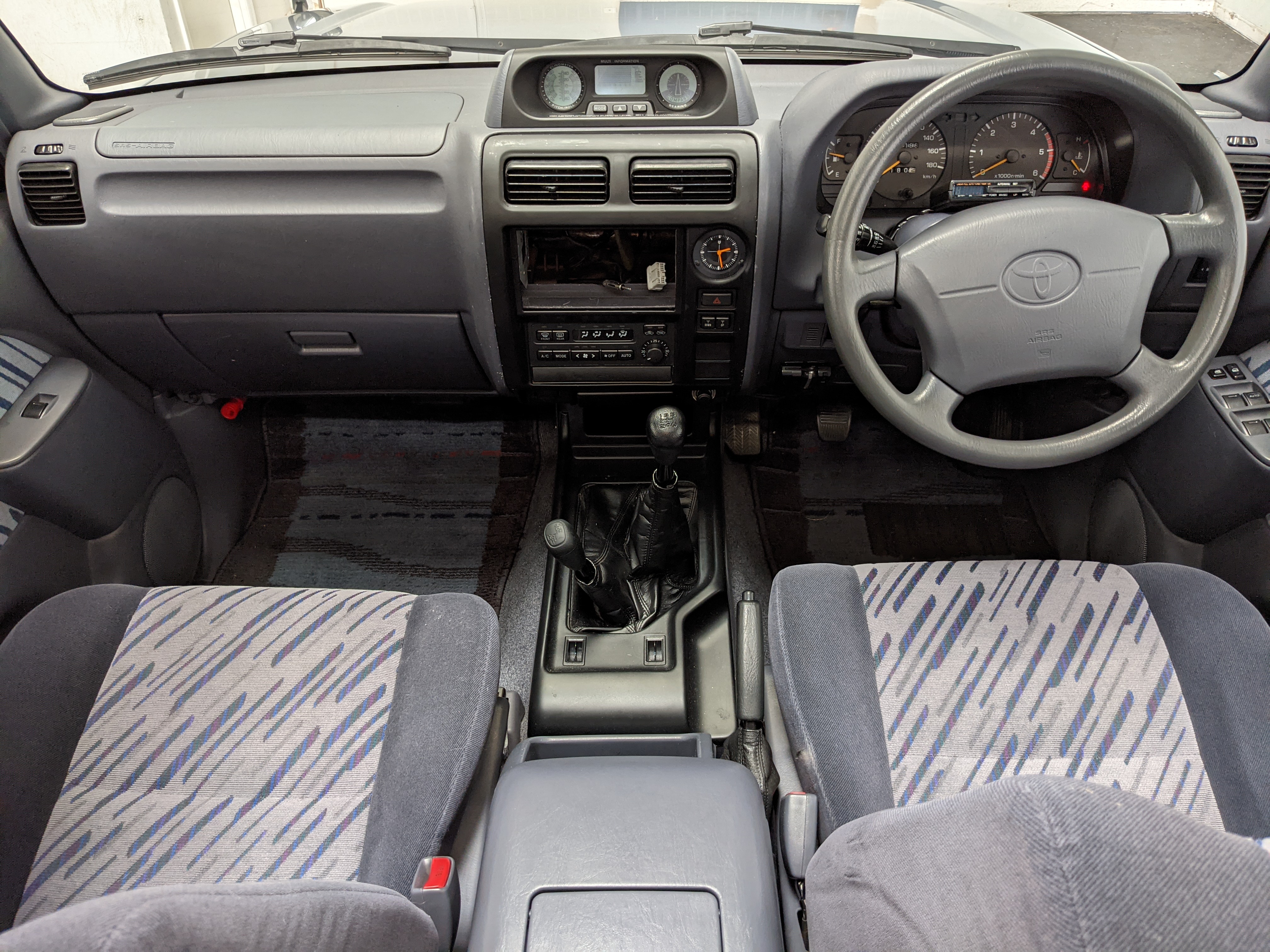 Blue, green and purple splashes of color dot the door panels and seats. As such, the seats themselves are comfortable fabric affairs, with great bolstering. Standard instrument cluster up front, amazing visibility all around and a functioning sunroof above your head. Above the center stack is the ‘Field Monitor’, a sort of digital information pod that includes an inclinometer, pitch/roll indicator and a digital compass. In addition it can display temperature, elevation, barometric pressure, digital speedometer (in kilometers of course) and a timer. Below this is arguably the star of the show, a 5 speed manual transmission along with a low-range selector. The stereo is missing, thankfully the wiring harness is uncut so is ready to have any USDM double-din unit you’d like installed. Automatic climate control and a little drawer, along with an analog clock are here as well. You also get dual front airbags and ABS which is a far cry from the “not at all” available in the last generation. Center console can swallow all sorts of things under its lid, including four drinks in its various cupholders. Backseats are clean and comfortable, with a smaller set of third row seats in the very back. The cargo area is large on its own but can be made significantly larger if you fold the rear seats forward.