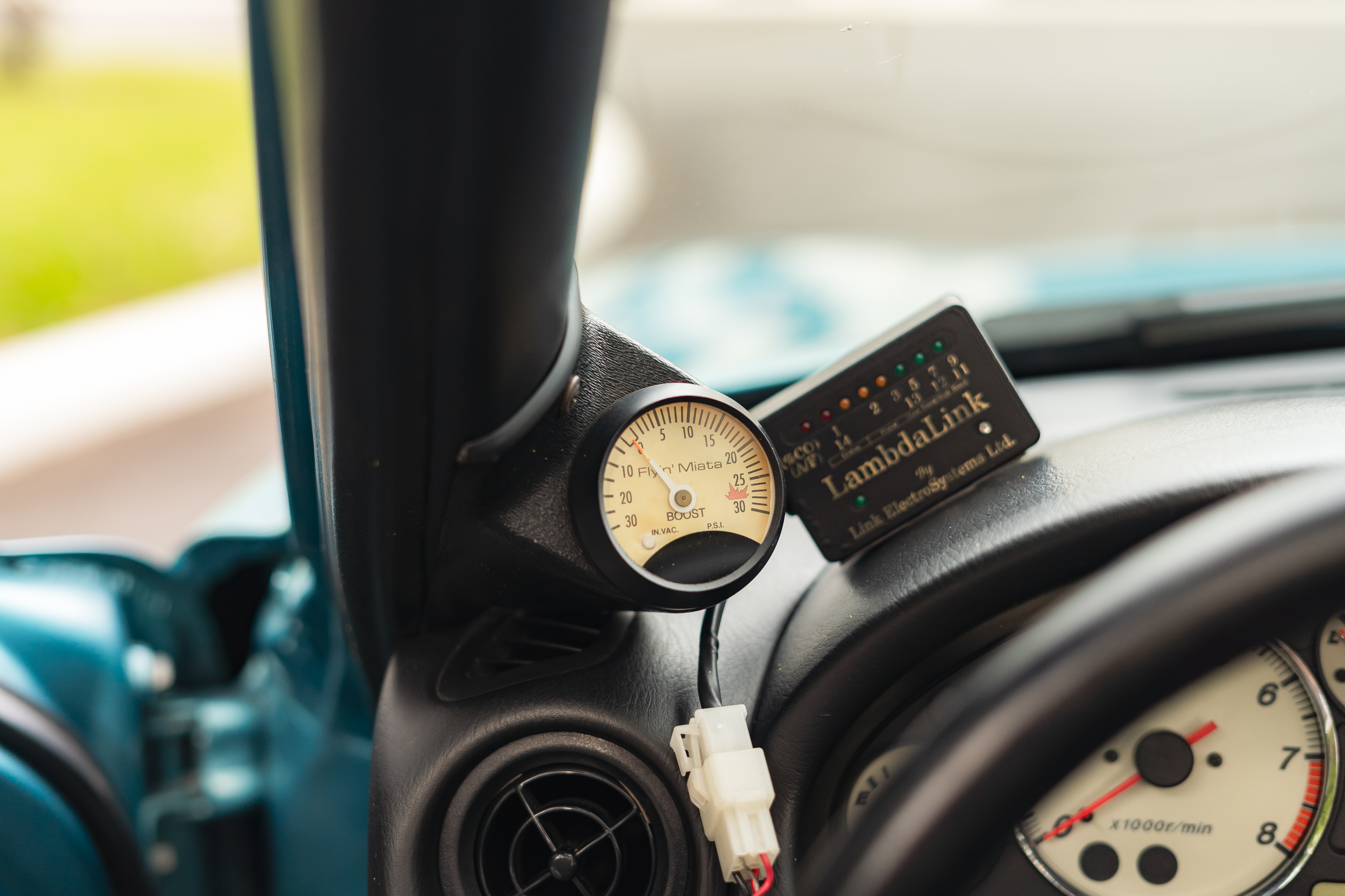 Speaking of power, this engine was completely redone with forged pistons and rods, a 1.9L overbored Flyin' Miata shortblock, a polished and ported head, a 9:1 compression ratio, and of course, a water-cooled, internally gated, Garret Turbo. Using an of-era Link piggyback management system, this car drives like it did in 2005 and is a time machine straight to that era. A Link Wide-Band O2 sensor sends to a readout on the dash, allowing you to keep track of fuel trims, and the Flyin' Miata boost gauge will help remind you that 16 psi is a hell of a lot of boost.